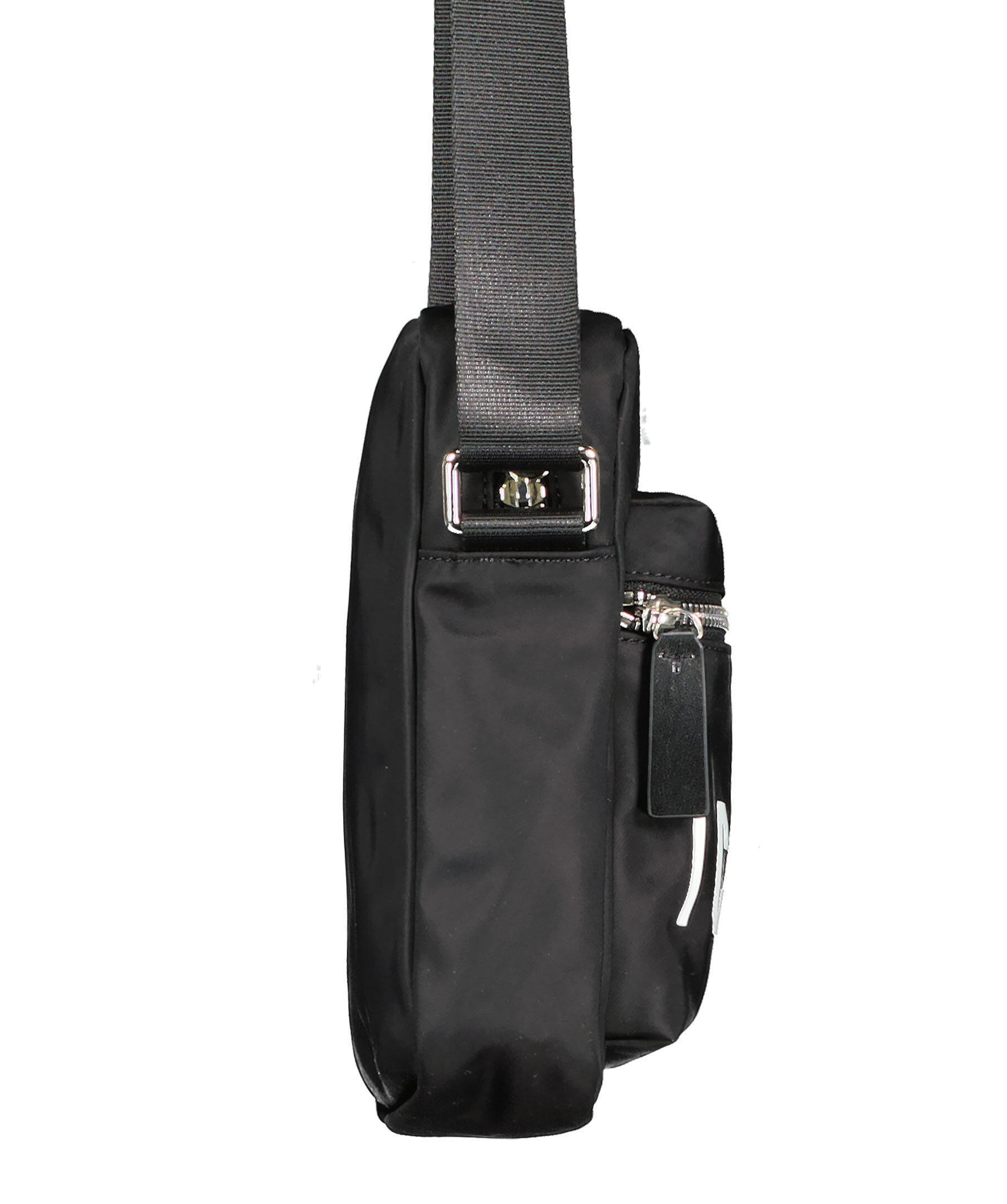 Svart crossbody bag från Dsquared2. Vit logga fram, fack med dragkedjor. Reglerbart spänne, tillverkad i textil och har detaljer i läder. Djup 5 cm, höjd 20 cm, bredd 15 cm.