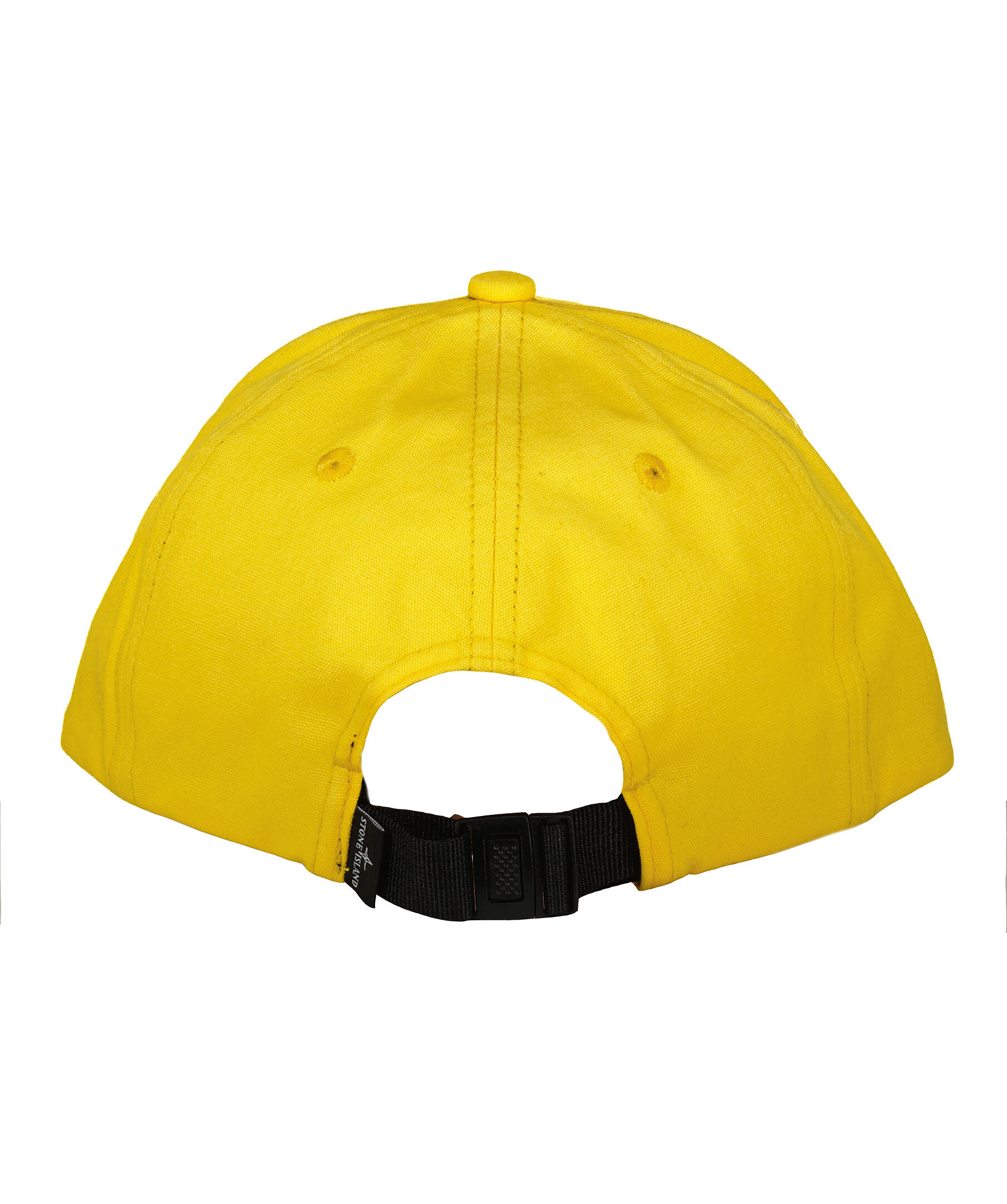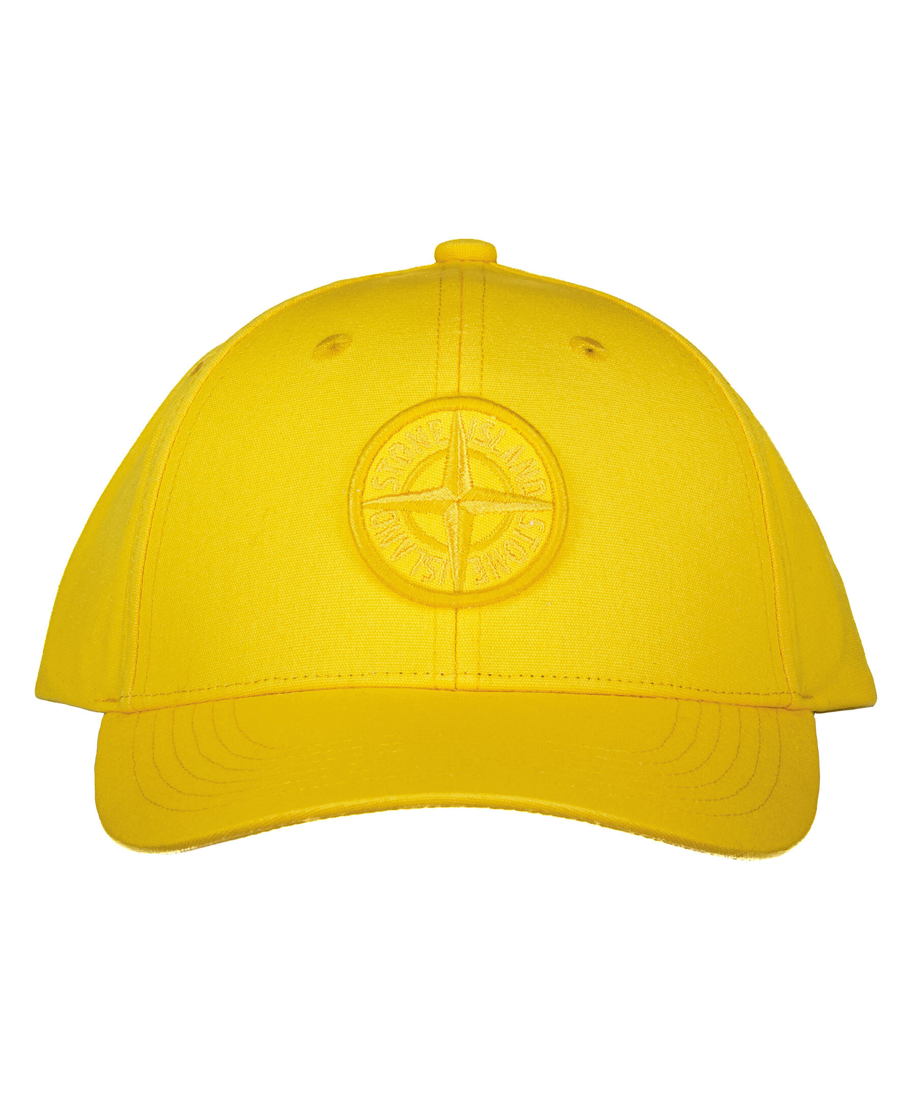 Gul keps från Stone Island i bomull. Stor, broderad logotyp i ton i ton fram. Kepsens skärm är lite böjd och det går att justera kepsen baktill med spänne i plast.