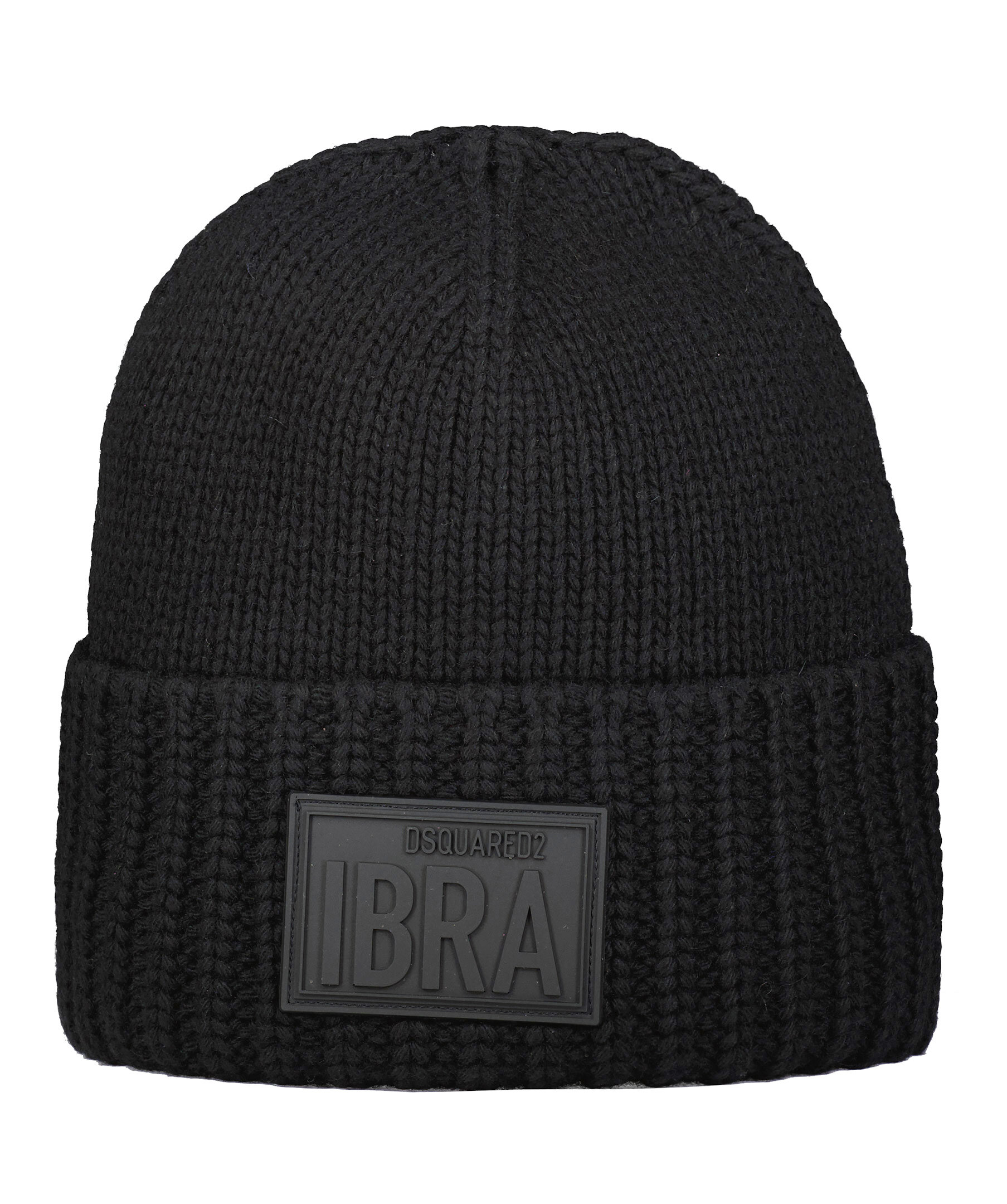 Svart ribbstickad mössa i ullblandning från Dsquared2 i samarbete med Zlatan Ibrahimović. Mössan har ett rektangulärt märke i svart gummi med texten "DSQUARED2 IBRA" på framsidan av den uppvikta kanten.