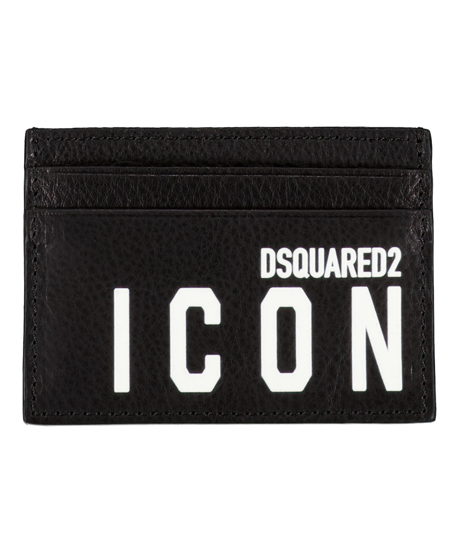 Svart korthållare i läder från by Dsquared2. Plats för två kontokort på varje sida och har ett fack i mitten. stor, vit tryckt logotyp på framsidan och liten präglad logotyp på baksidan.