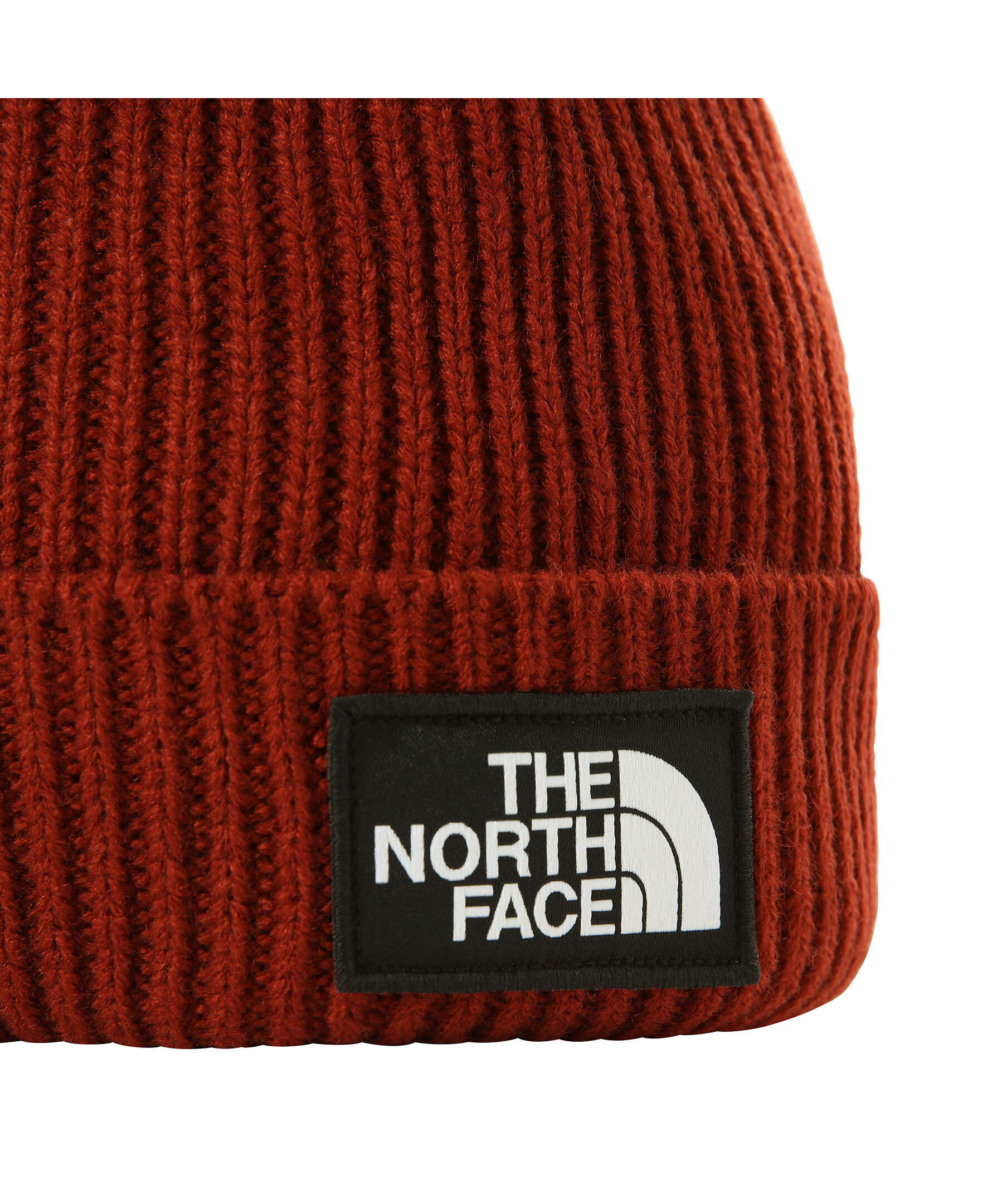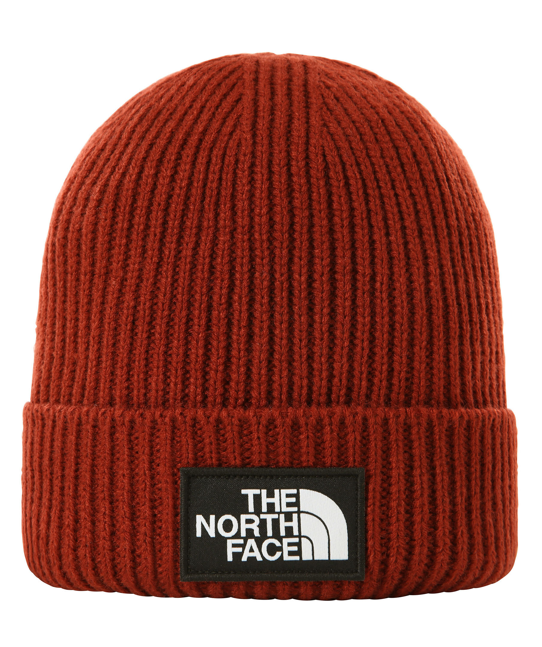 Roströd ribbstickad mössa från The North Face. Tygpatch med logotyp, uppvikt kant.