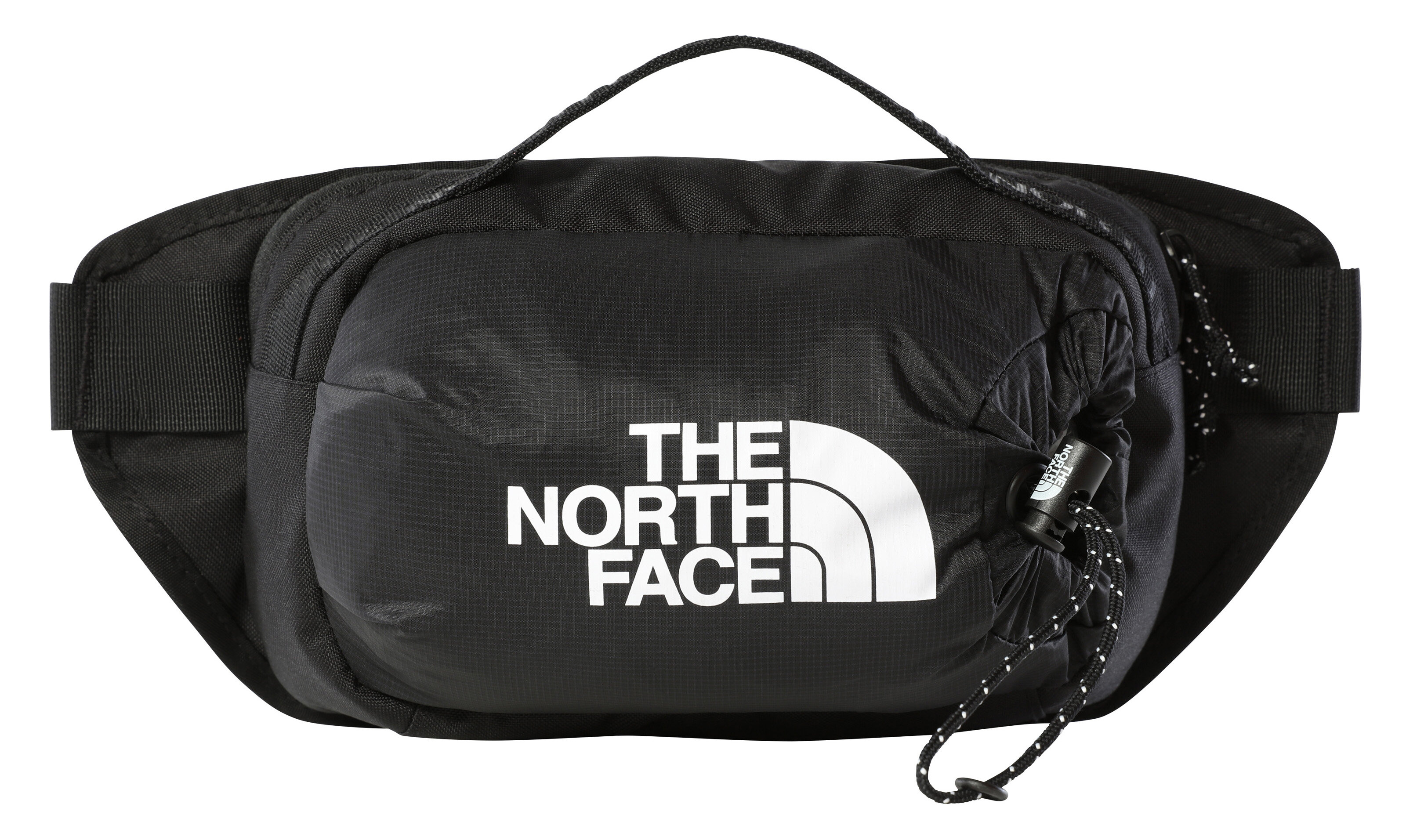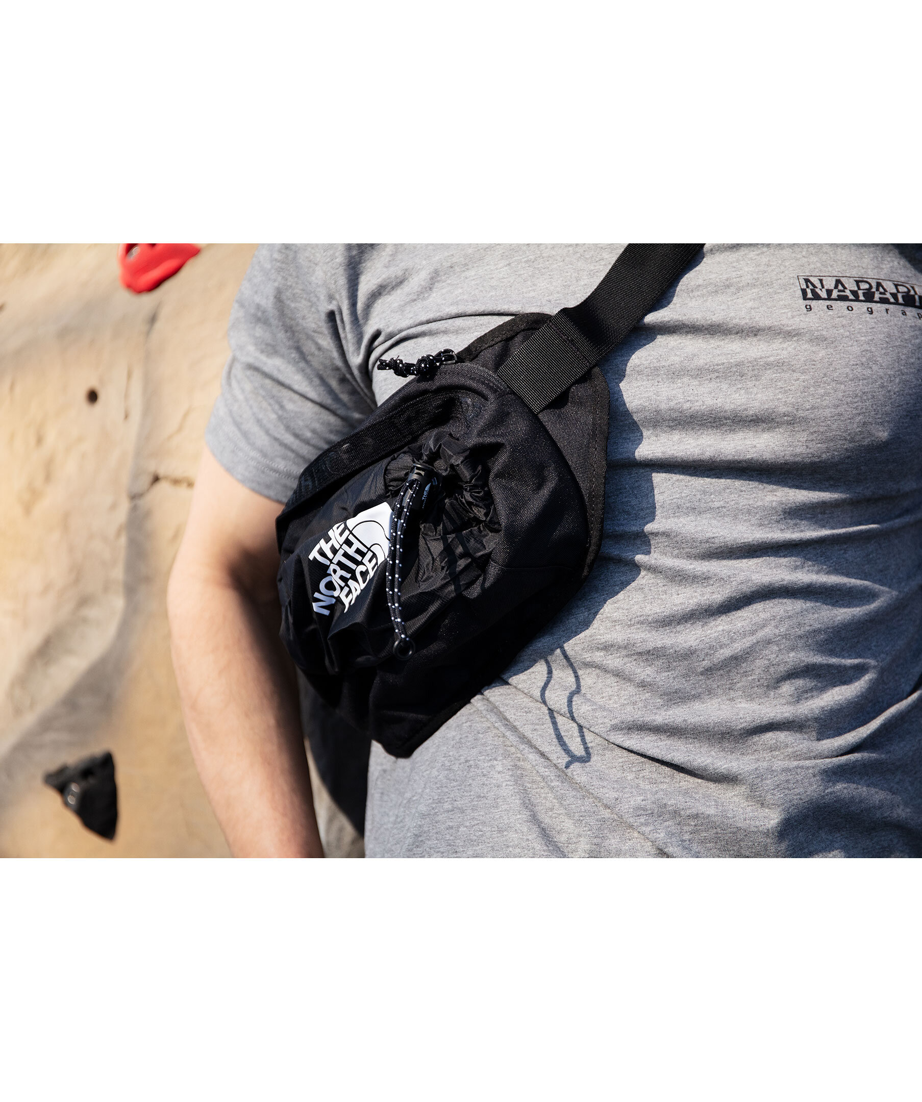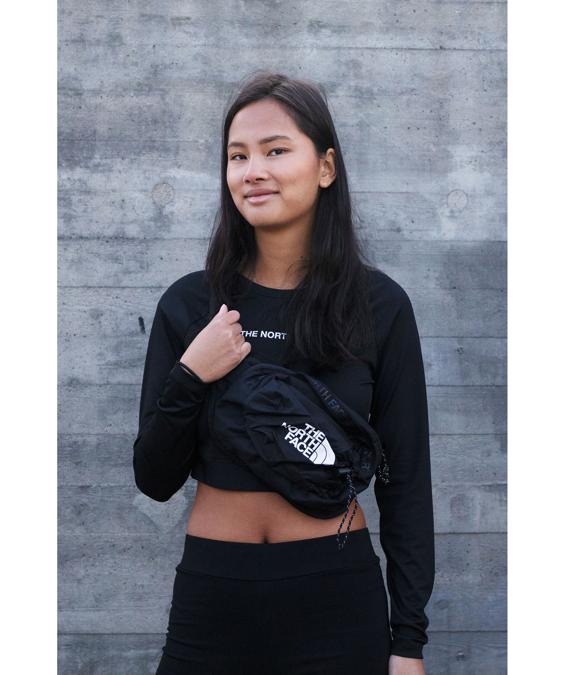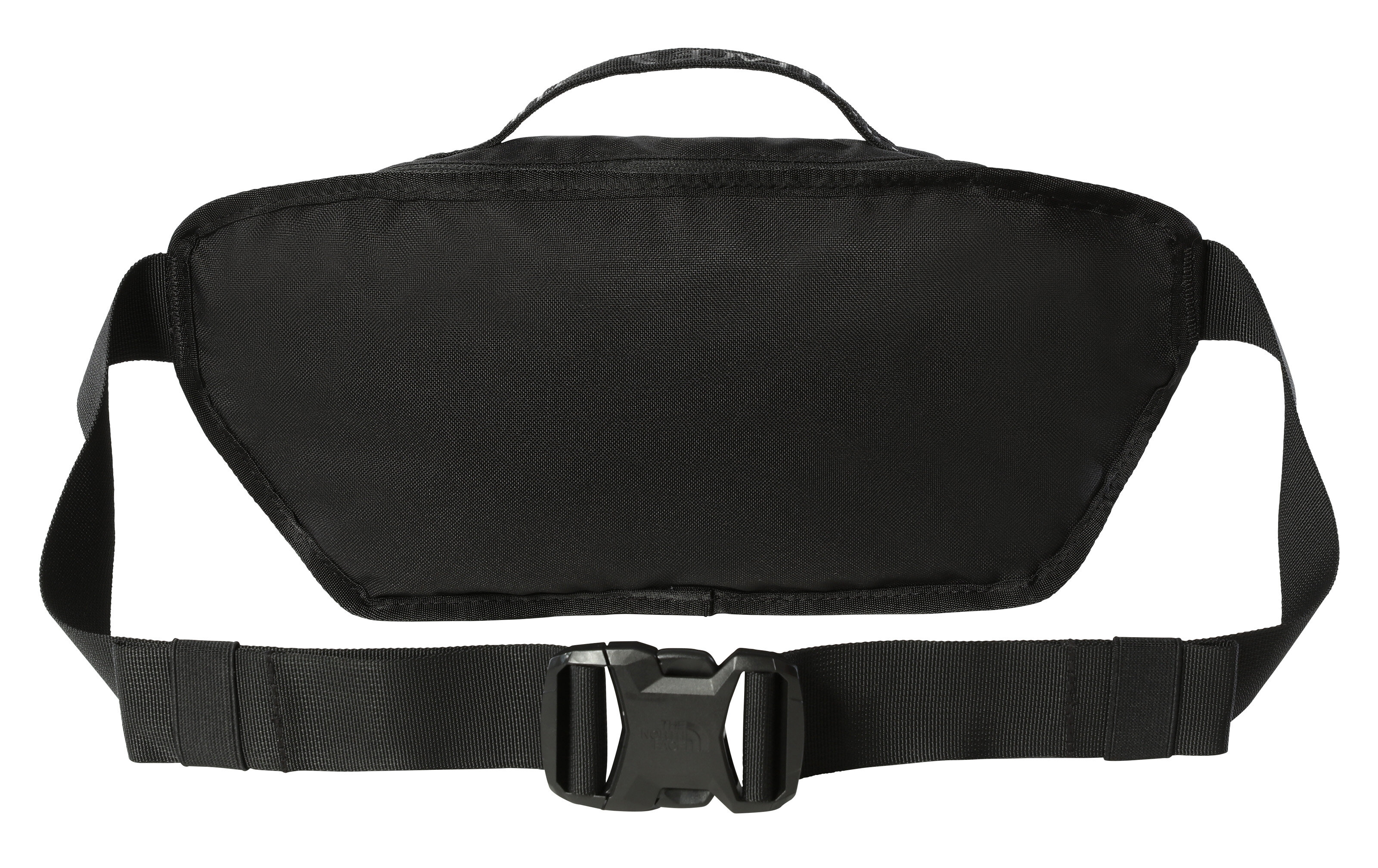 Svart midjeväska från The North Face. Justerbar rem för att kunna ha väskan över axeln eller runt midjan. Stort innerfack med två små öppna fack. Huvudfacket stängs med dragkedja. Fastsydd packpåse med dragsko på utsidan av väskan med stor logotyp. 33 cm Bred, 16 cm hög och 6 cm djup.