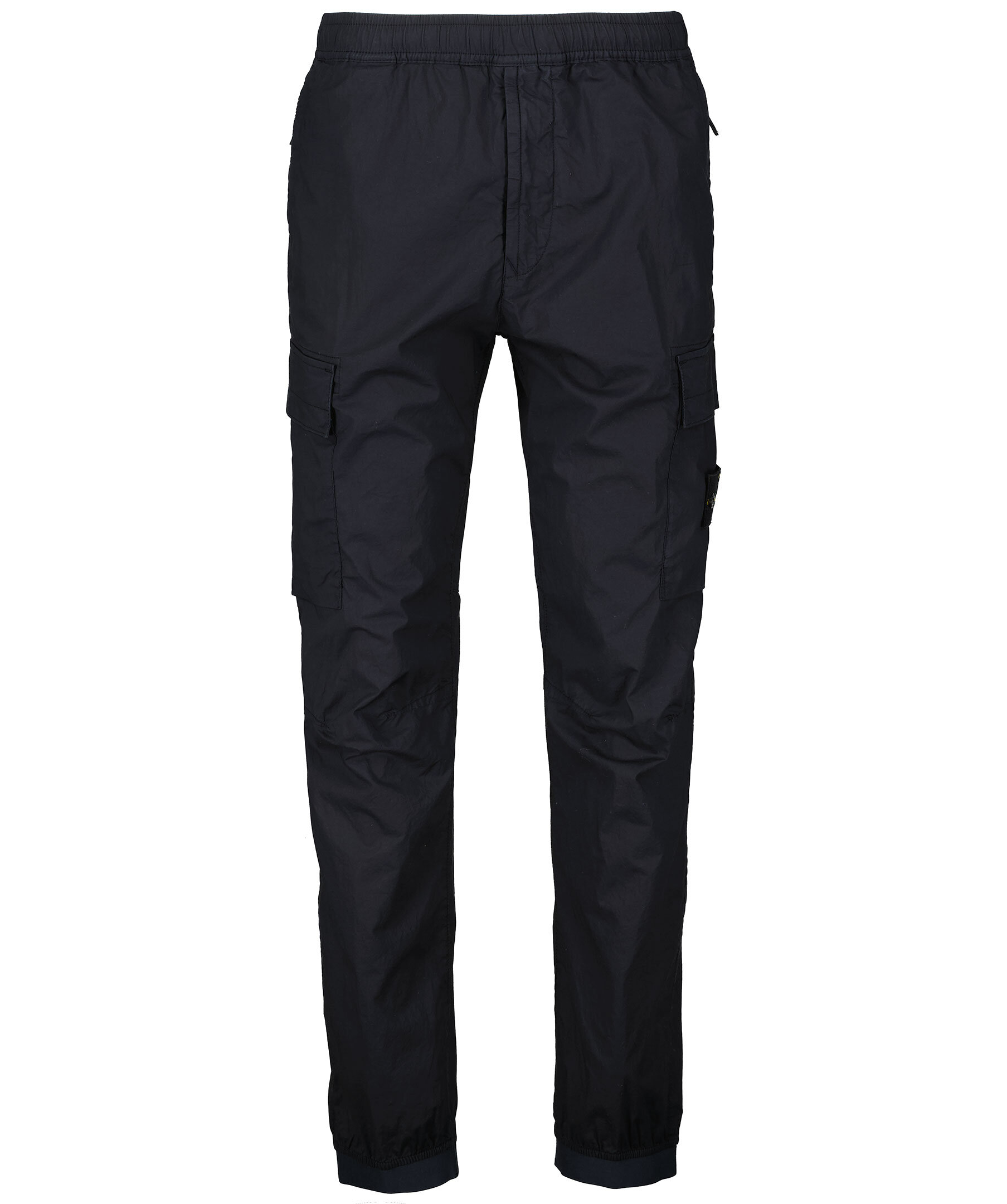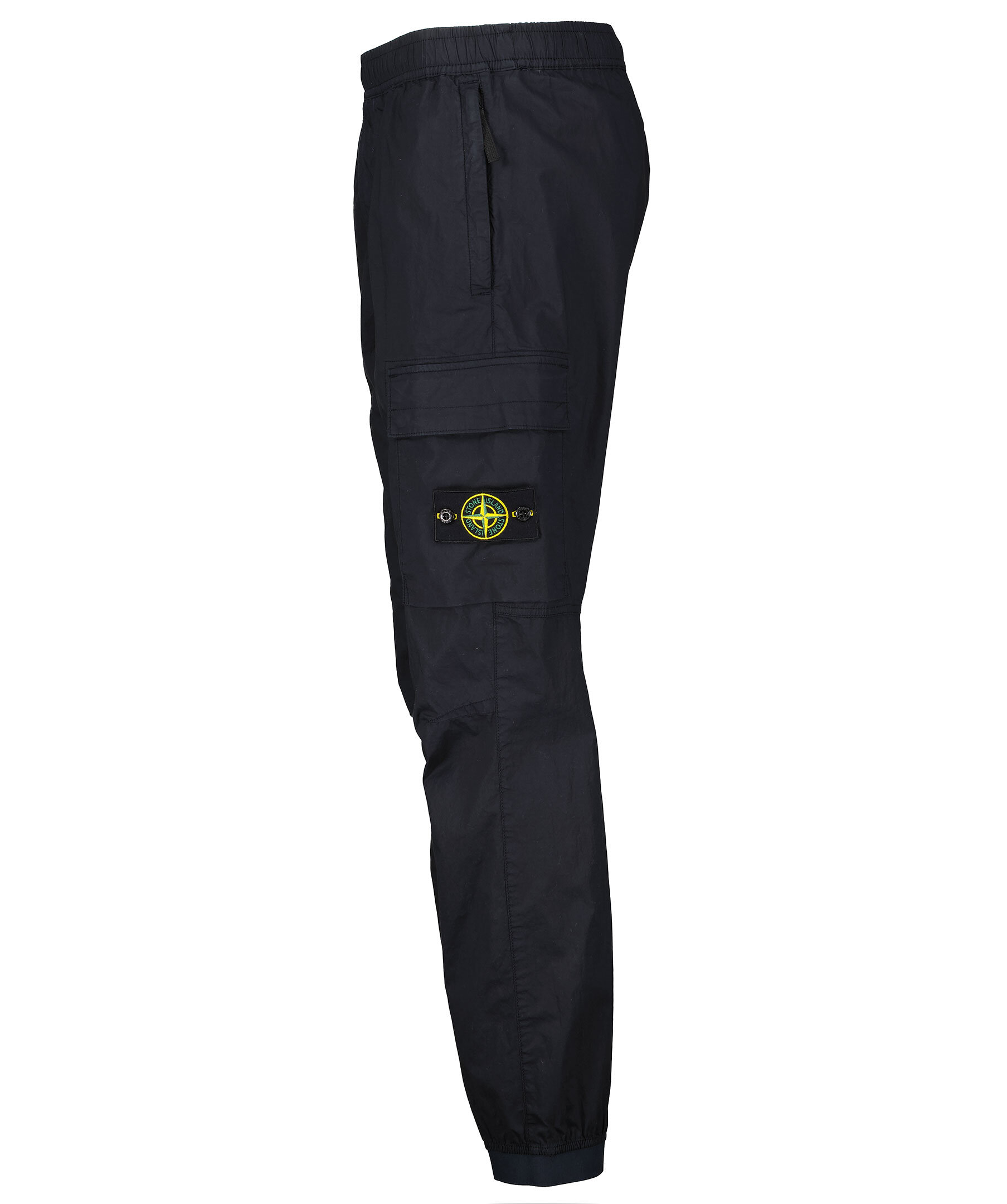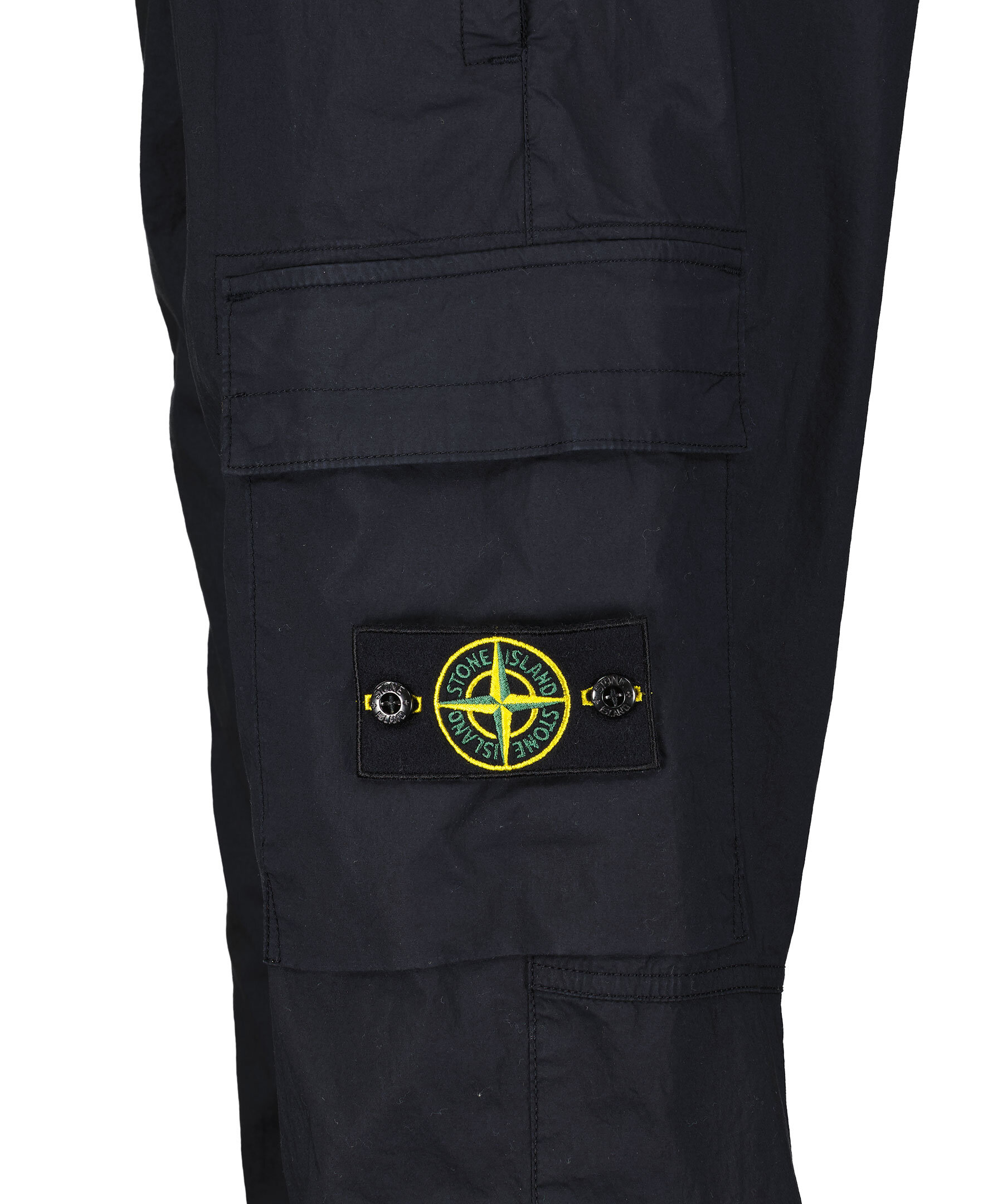 Svarta cargobyxor från Stone Island. Fyra fickor framtill, två som stängs med dragkedja, två med lock. En bakficka som stängs med knapp. Elastisk resår vid midjan, benslut. Gylf som stängs med dragkedja. Patch med logotyp på vänster benslut. Dragsko i midjan. Tillverkad i bomulls blandning.