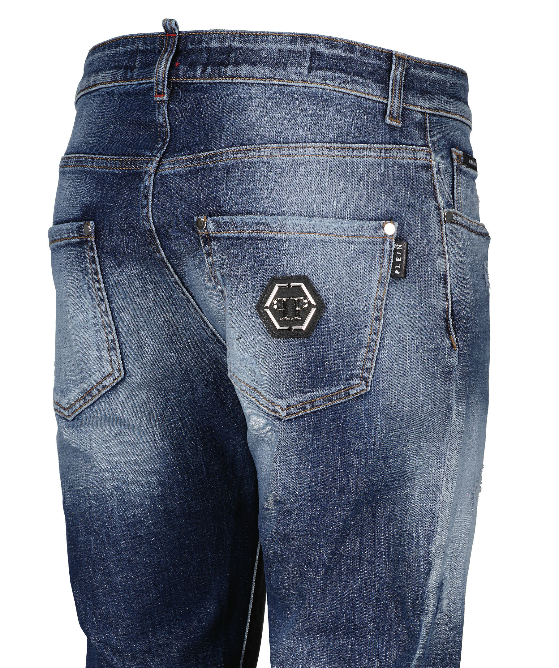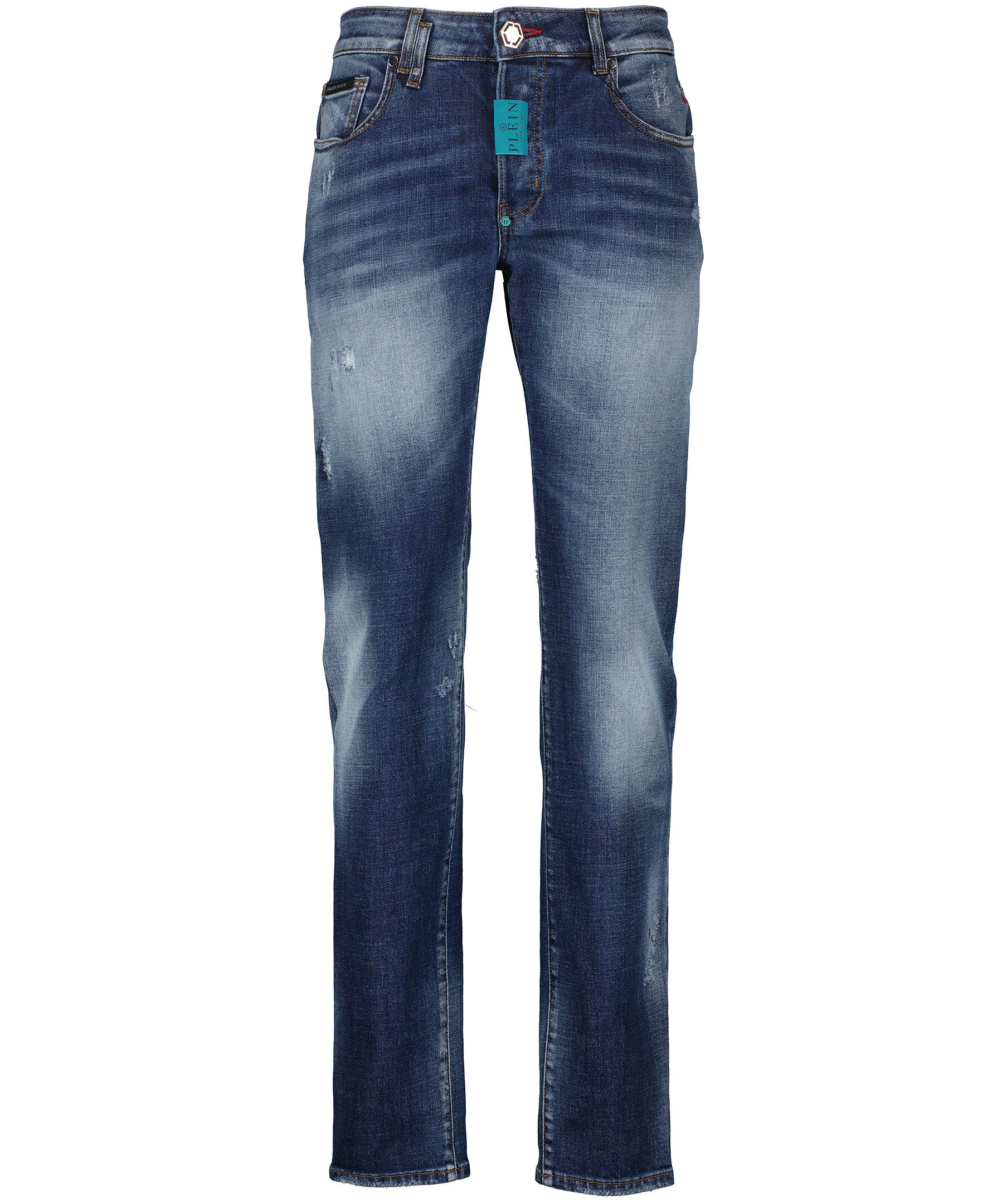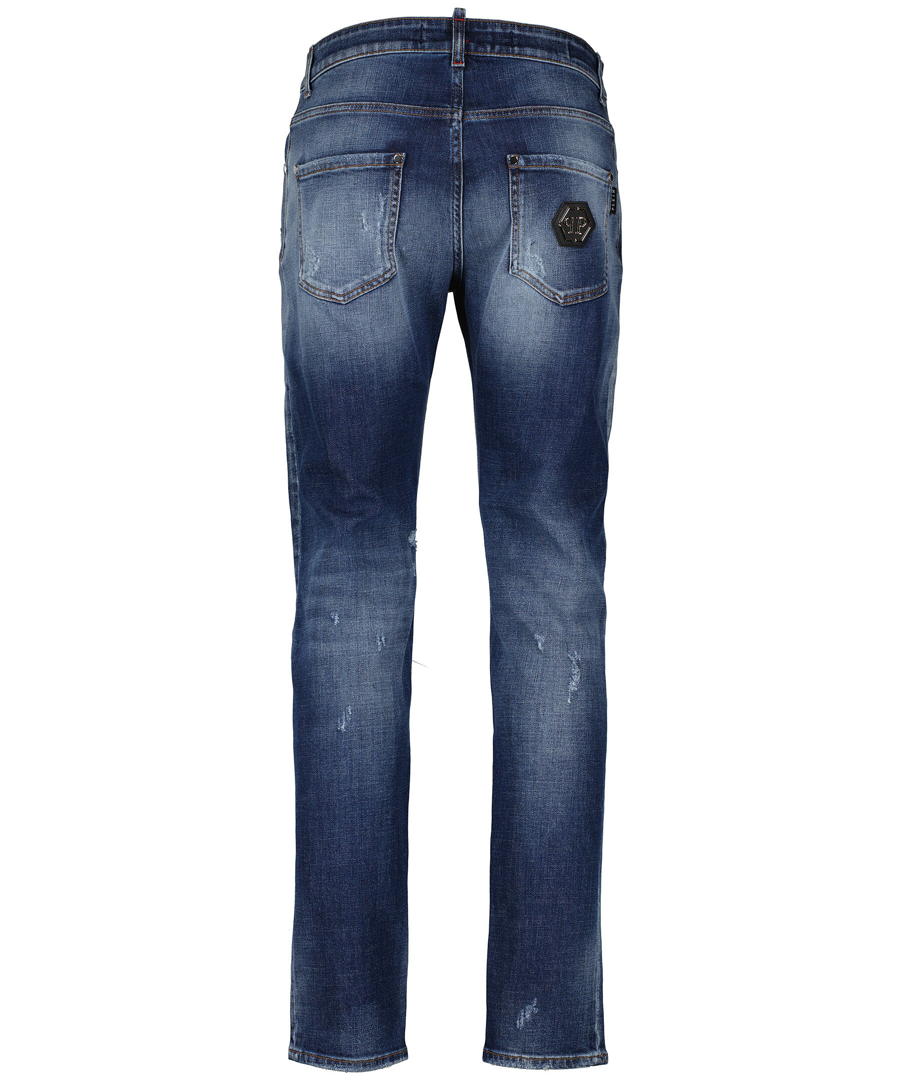 Blåa jeans från Philipp Plein. Stretch-stentvättade jeansbyxor med 5 fickor. Patch-logotyp med detalj i metall på baksidan. Enkel knapp-logotyp i metall i fram. Passform: Super Straight. Tyglappslogotyp vid gylfen. Tillverkade i en bomullsblandning.