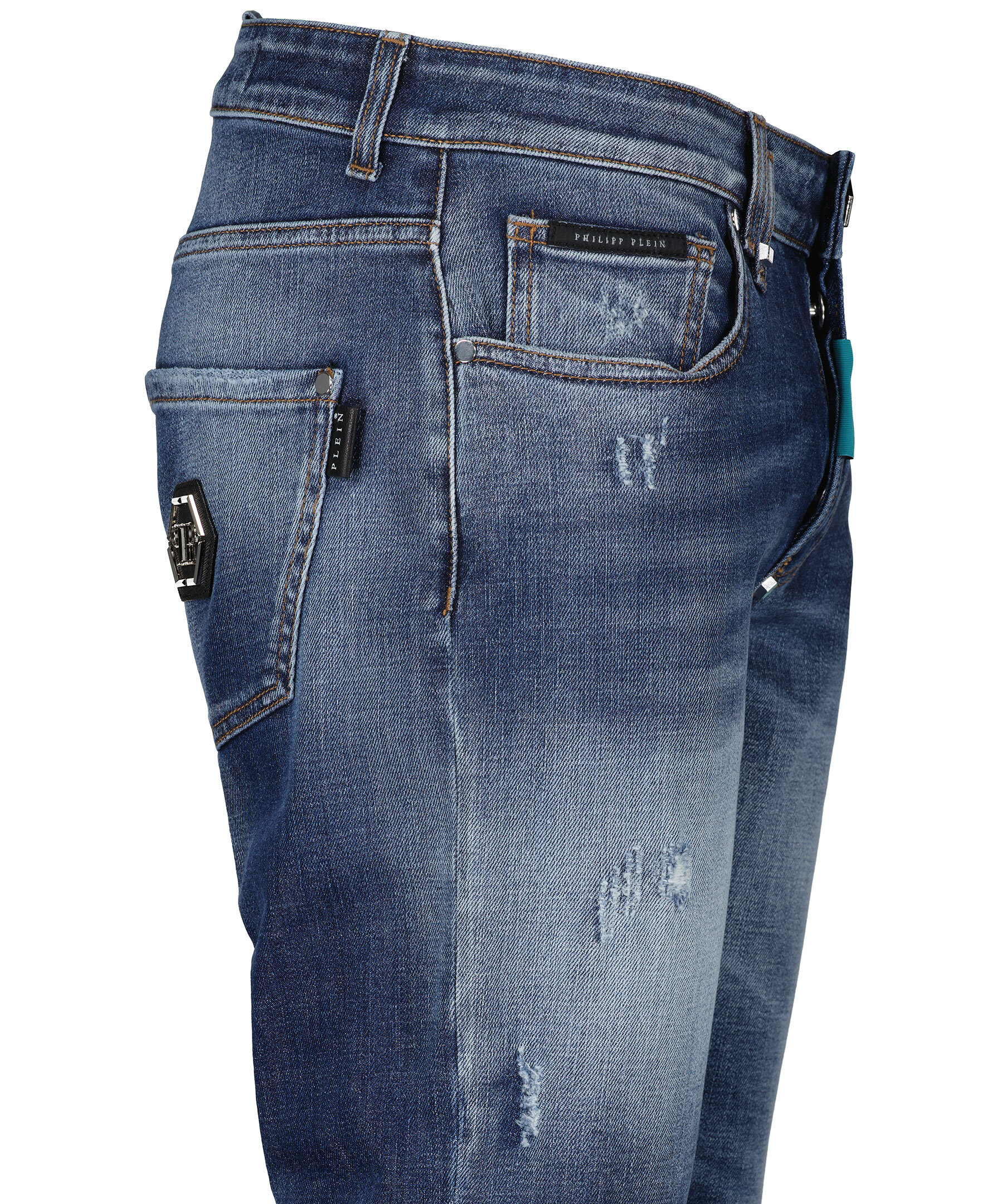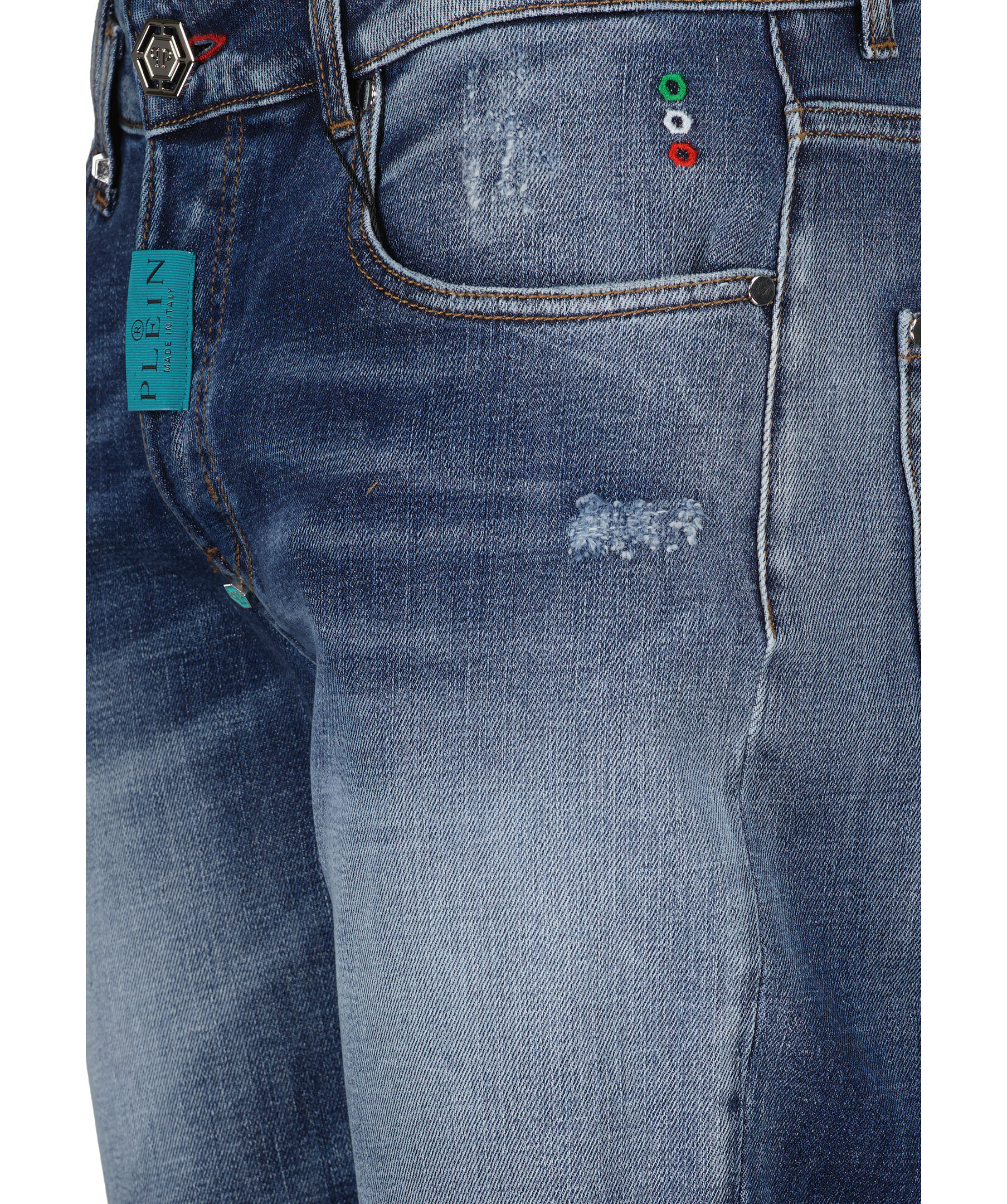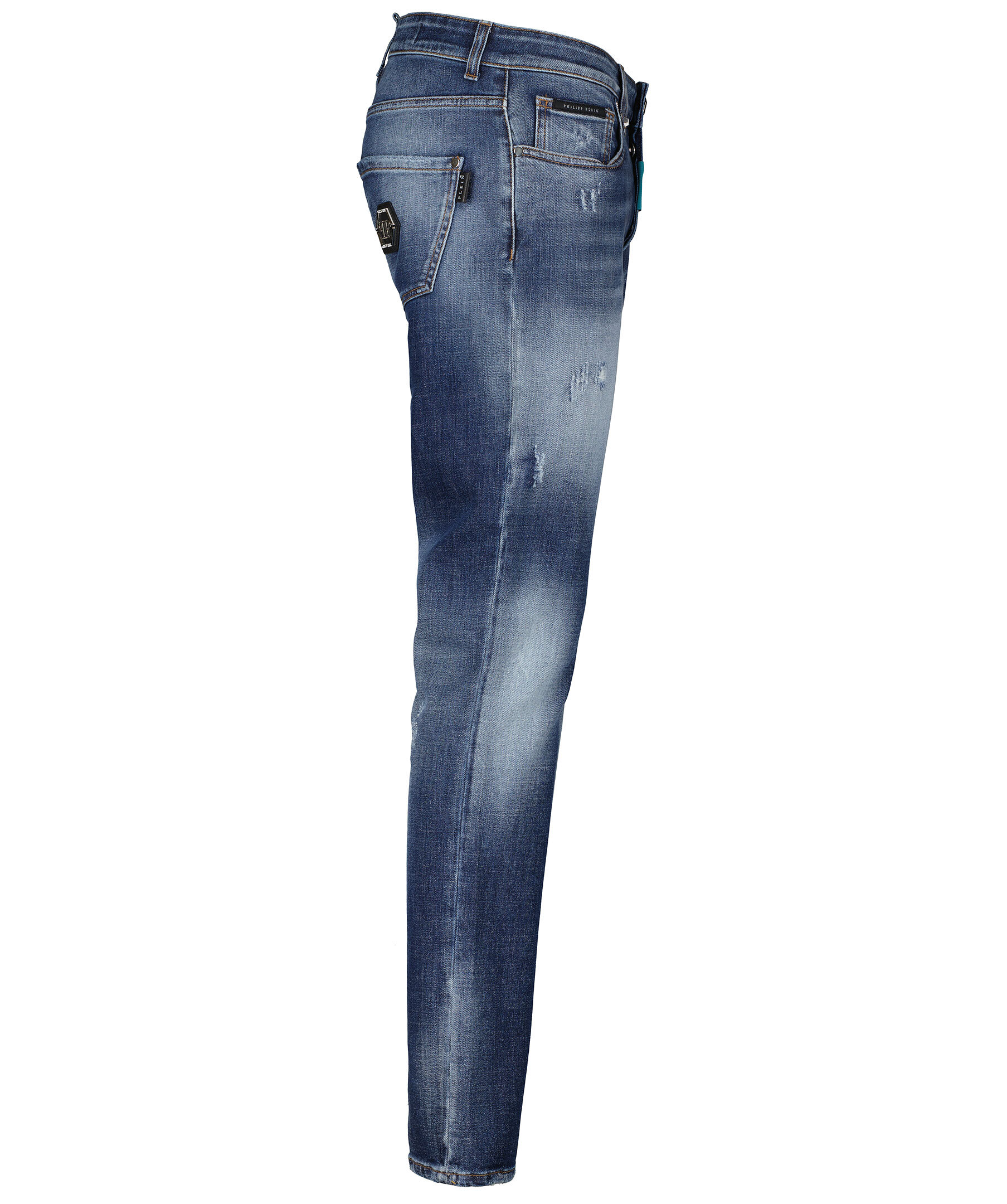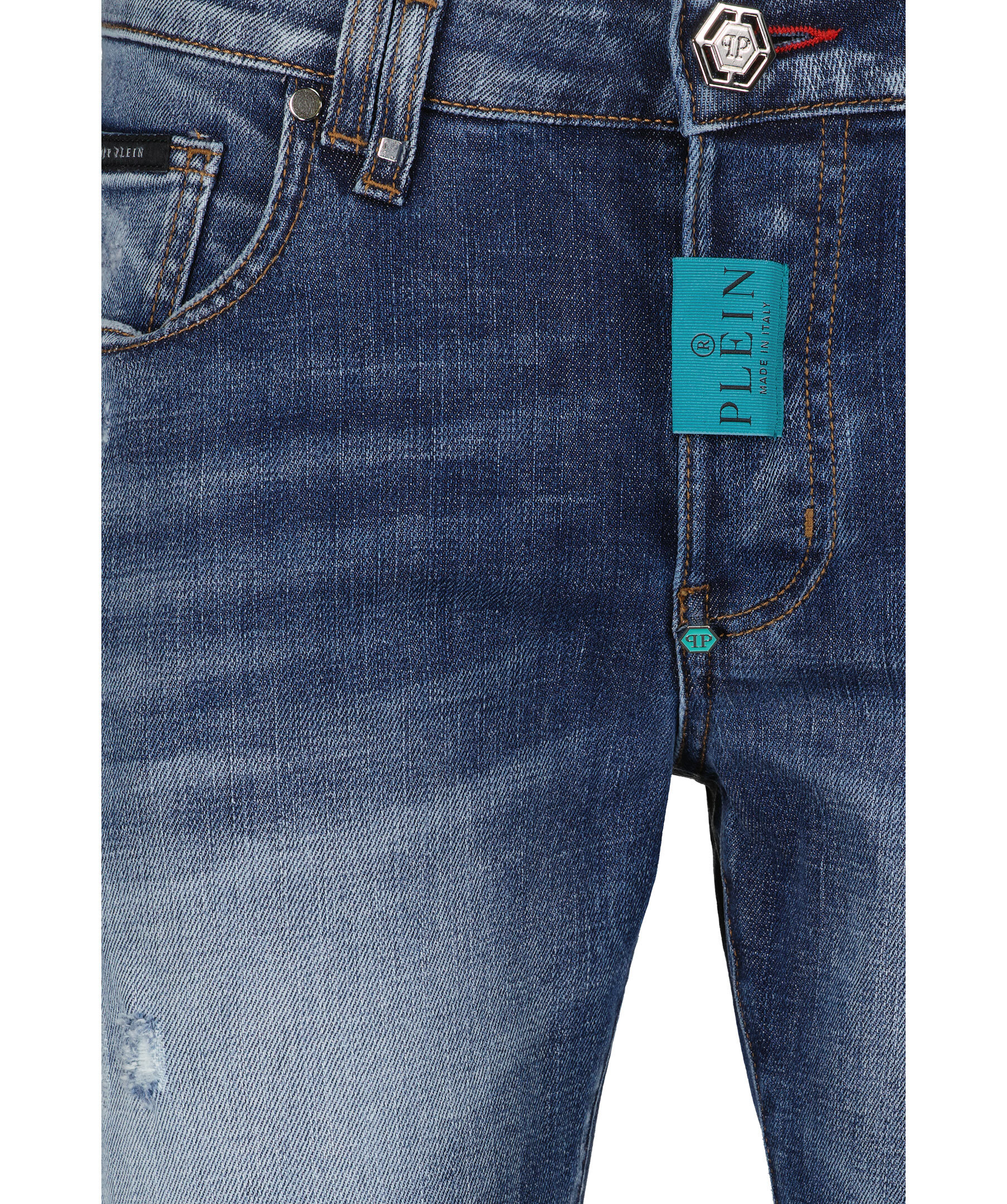 Blåa jeans från Philipp Plein. Stretch-stentvättade jeansbyxor med 5 fickor. Patch-logotyp med detalj i metall på baksidan. Enkel knapp-logotyp i metall i fram. Passform: Super Straight. Tyglappslogotyp vid gylfen. Tillverkade i en bomullsblandning.