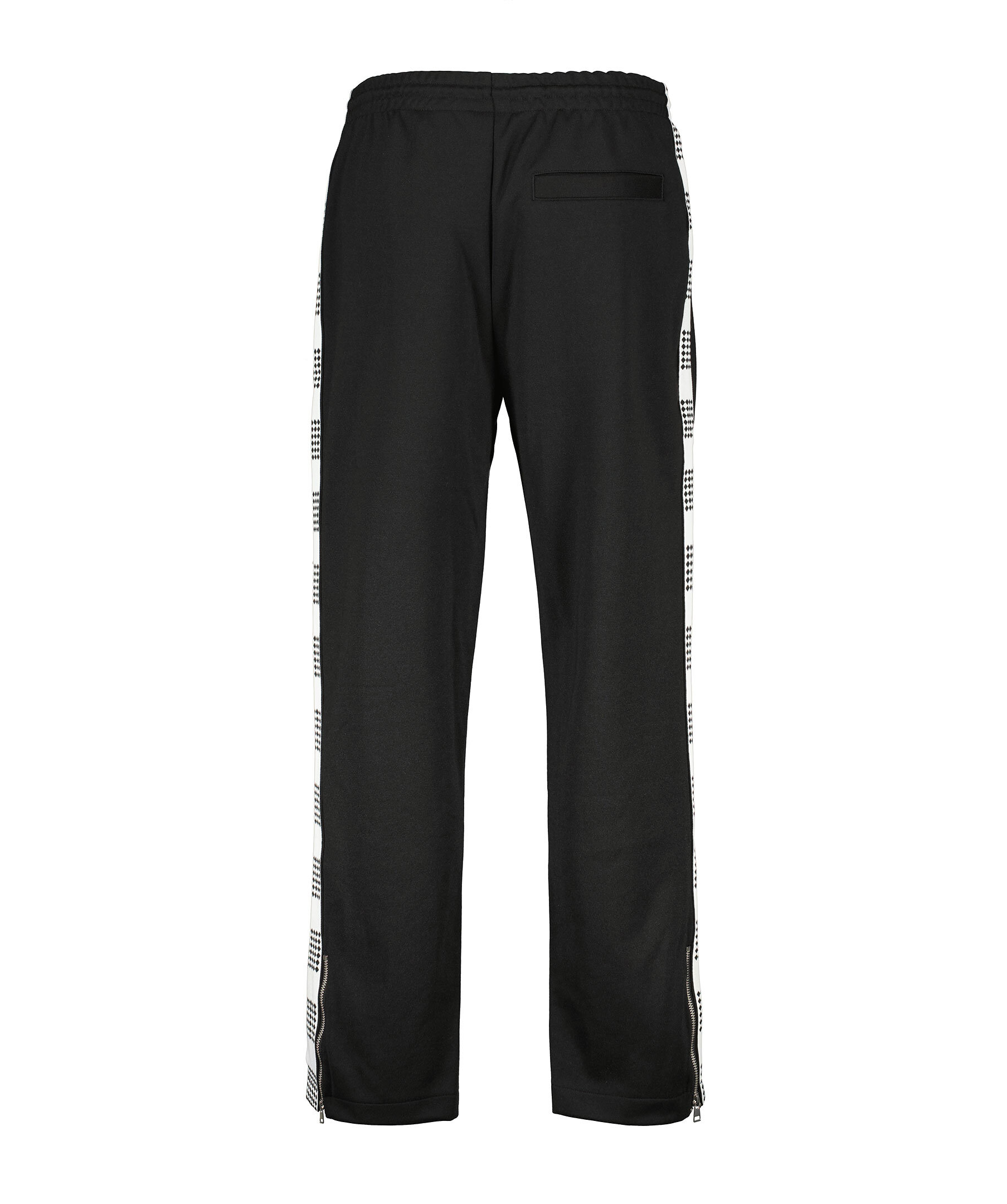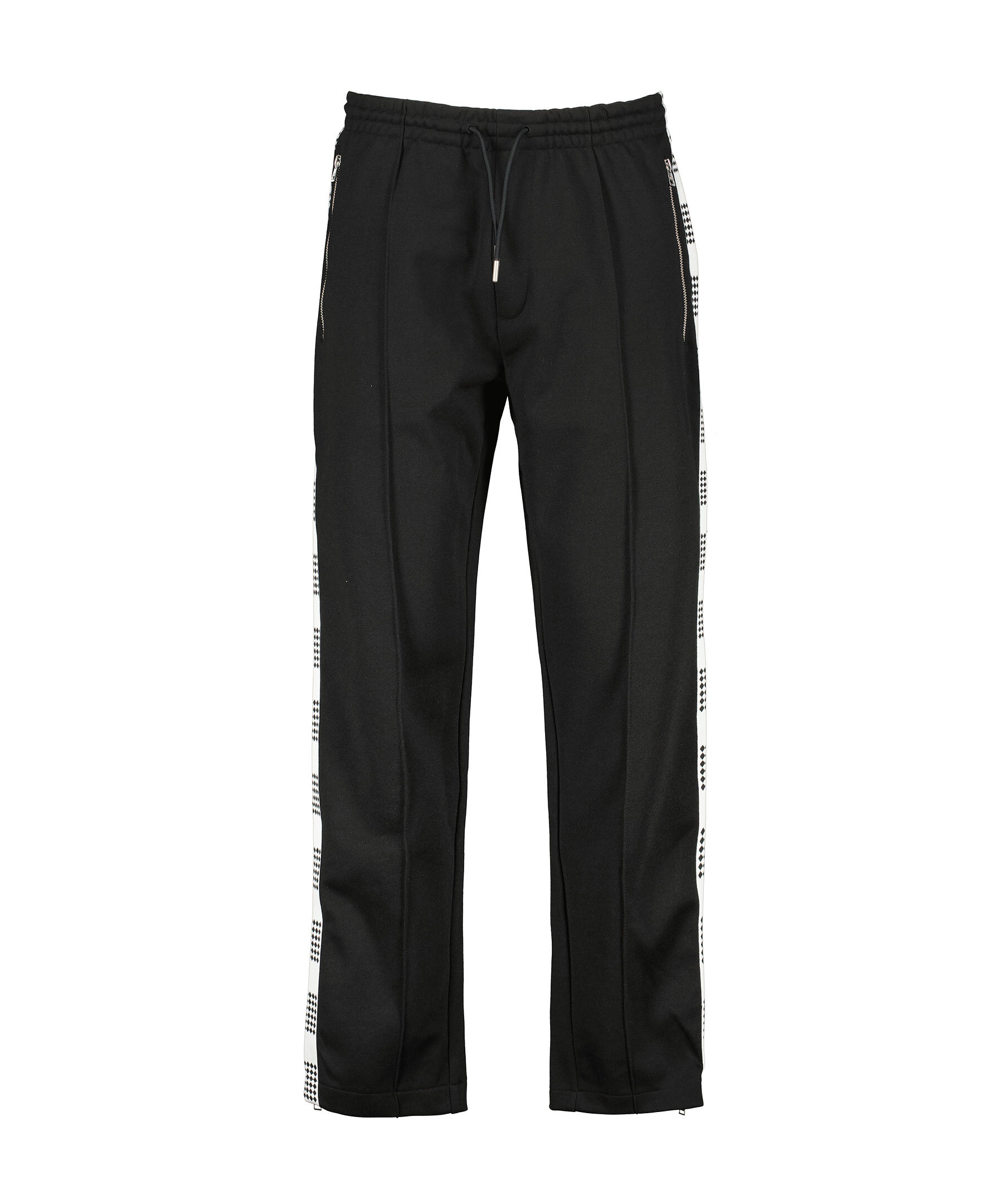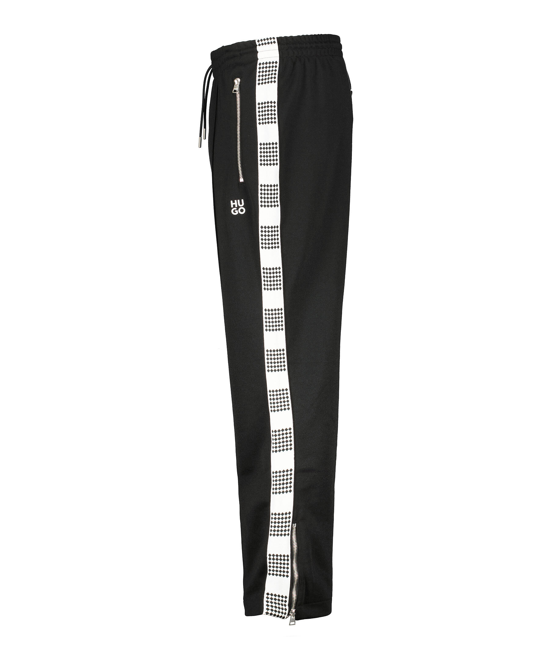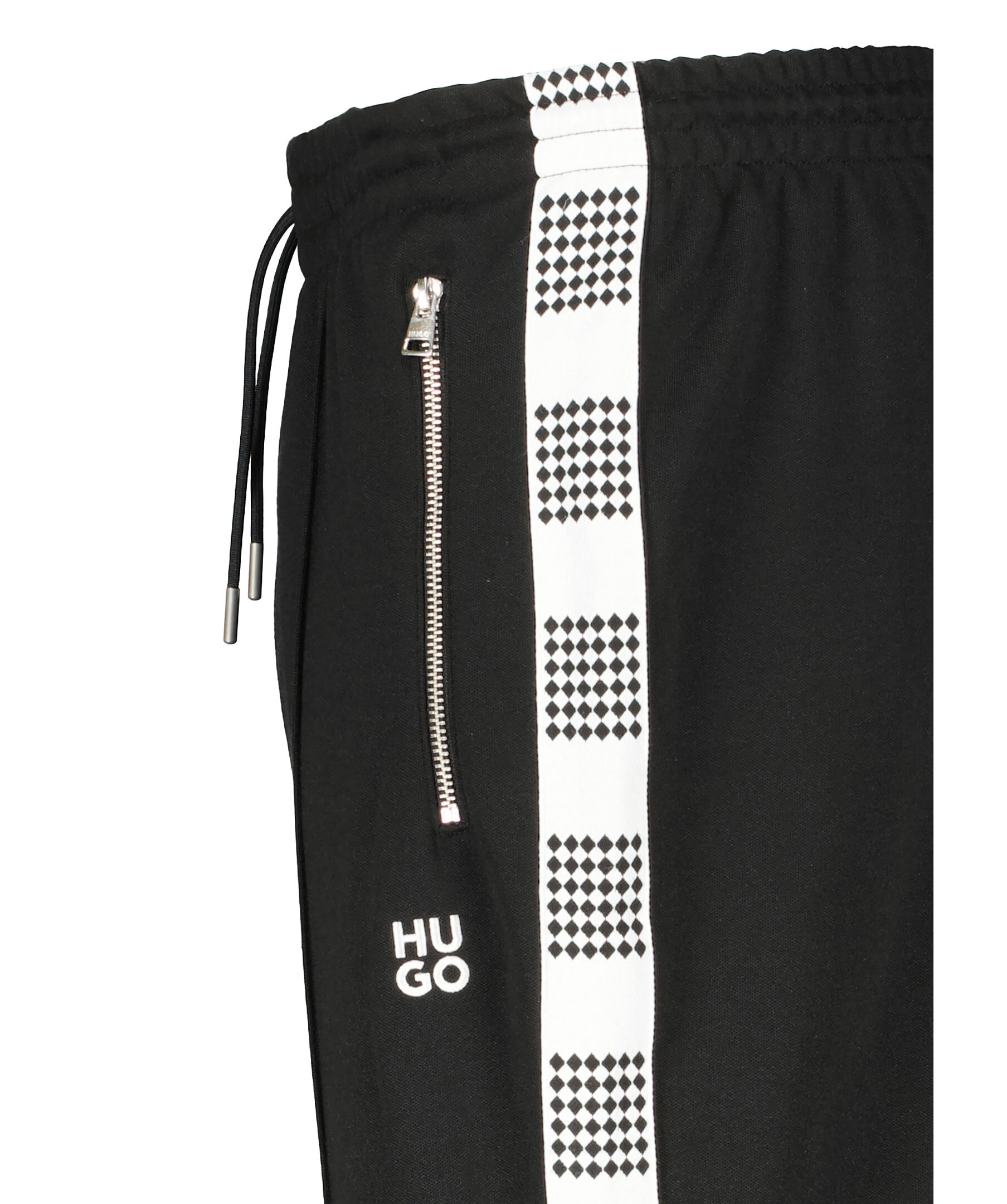 Svarta tracksuit byxor från Hugo. Byxorna har en vintage inspirerad look med mönster som löper längst med byxornas ytterkant. Resår i midjan med snörning. Två stycken sidofickor med dragkedja. Tillverkad av en bomullsblandning.