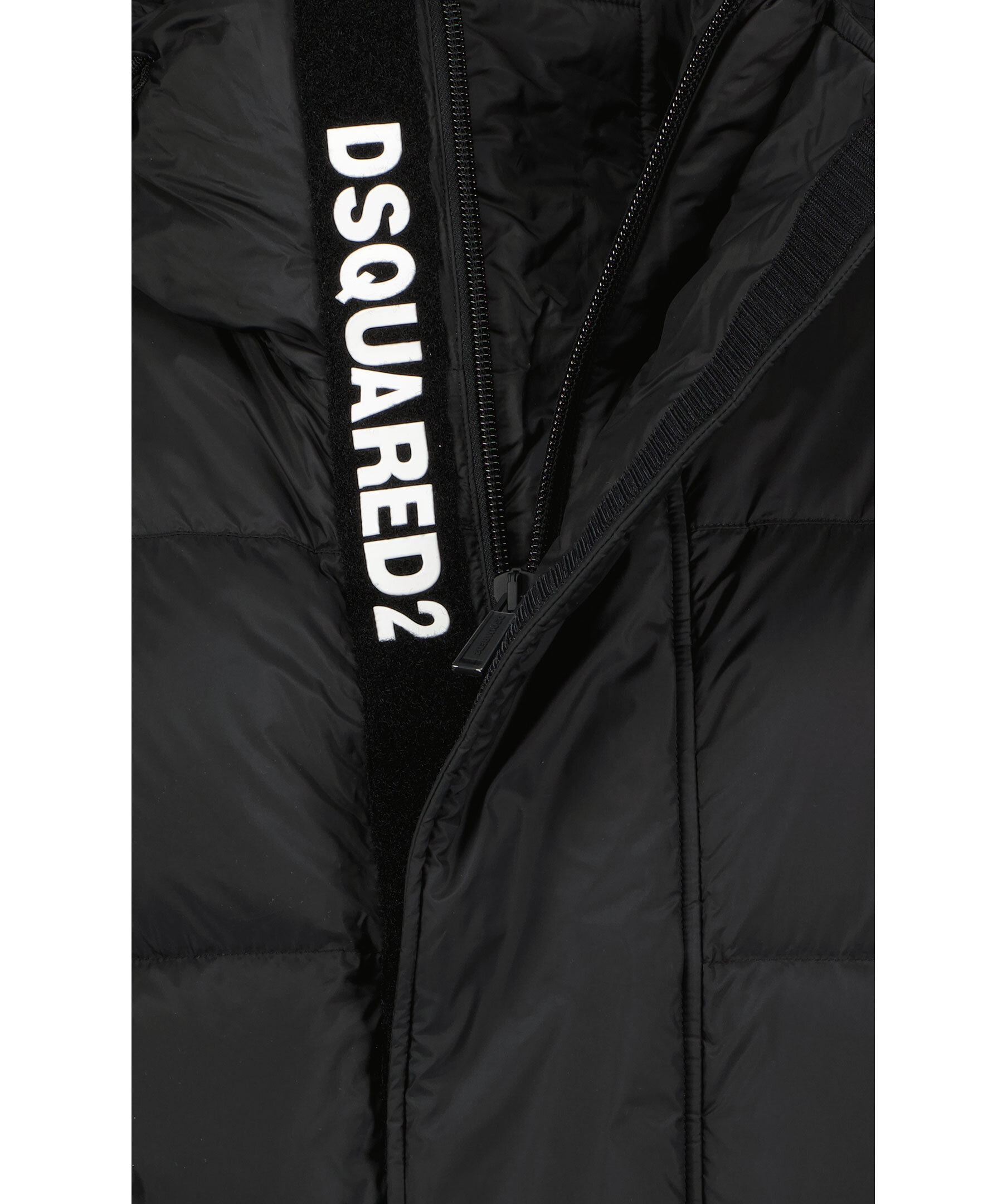 Svart dunjacka från Dsquared2. Stängs framtill med dragkedja och kardborre. Två fickor framtill som stängs med dragkedja. Luva och jackslut med dragsko. Ribbstickade muddar i ärmslut.