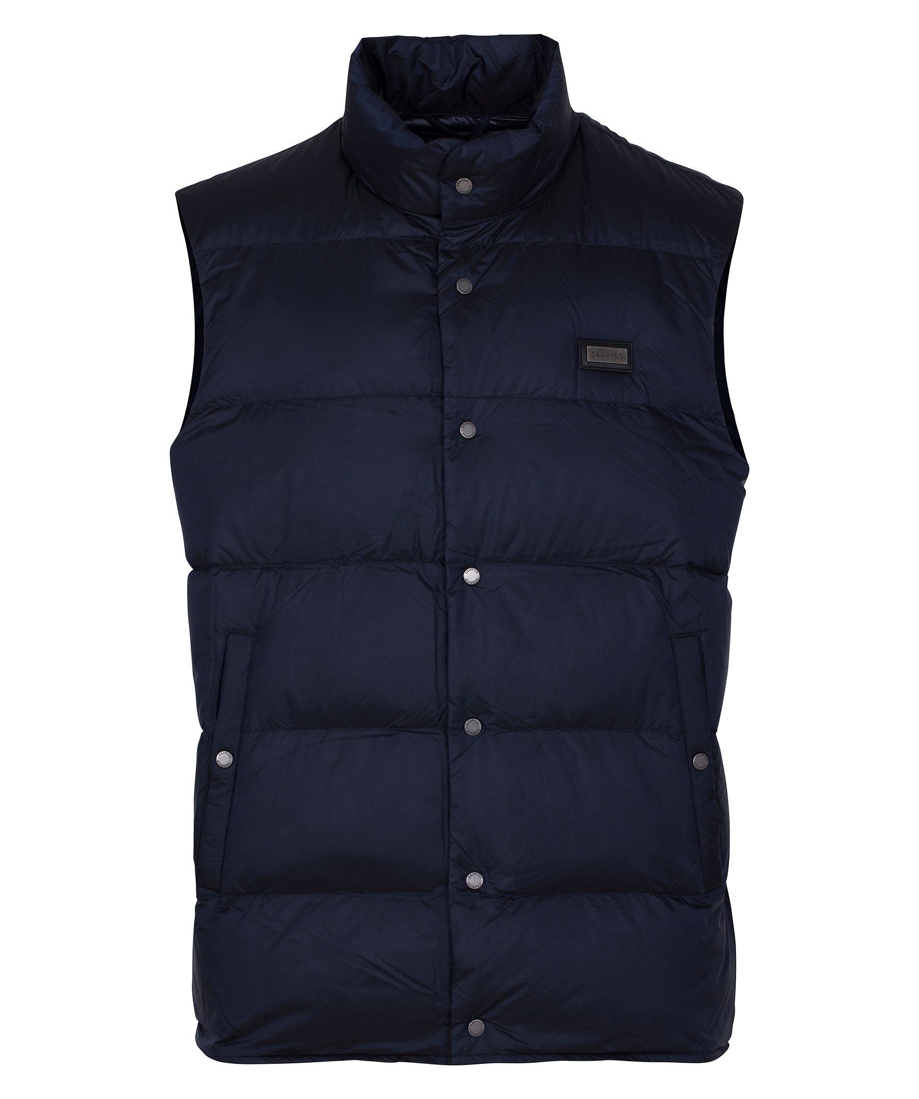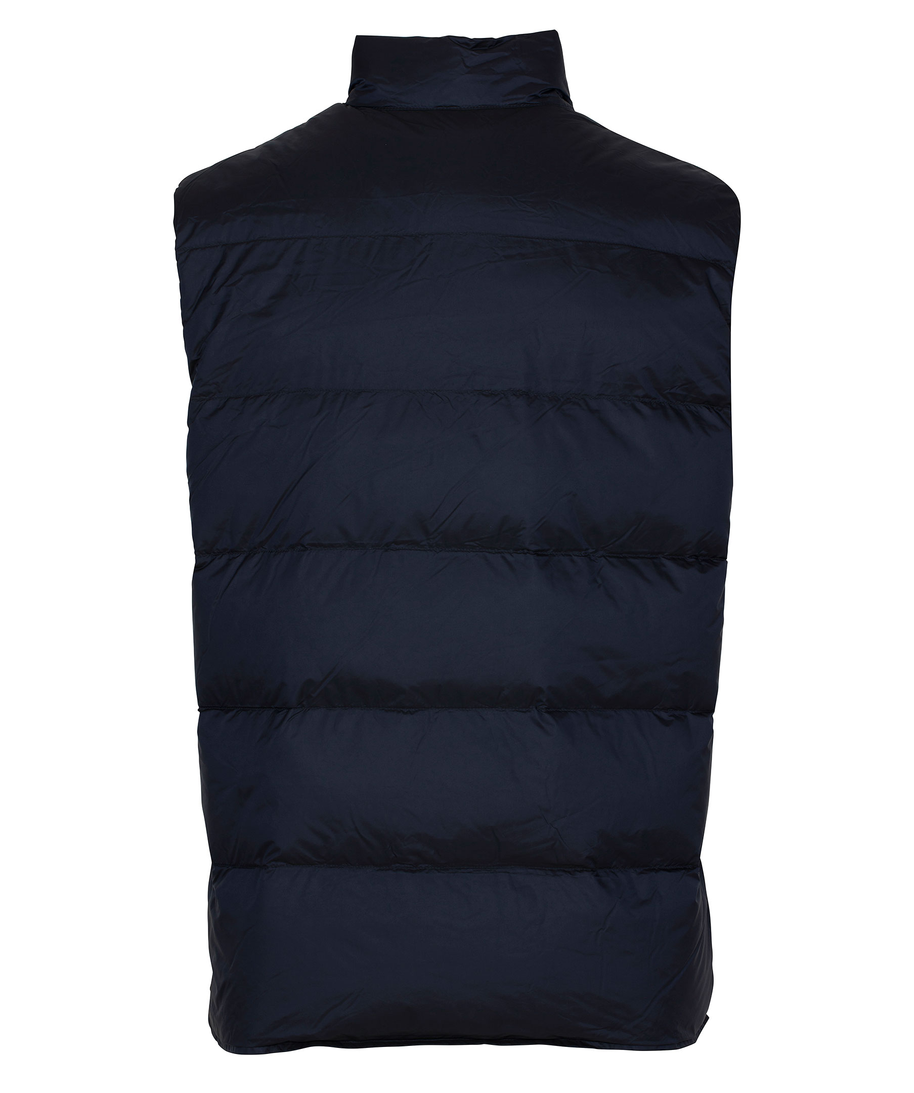 Marinblå väst i lättviktsdun från Cedrico. Tillverkad i nylon med fyllning av dun och fjäder. Stängs med trycknappar och har en hög krage. Två framfickor med knapp. Logotyp på bröstet.