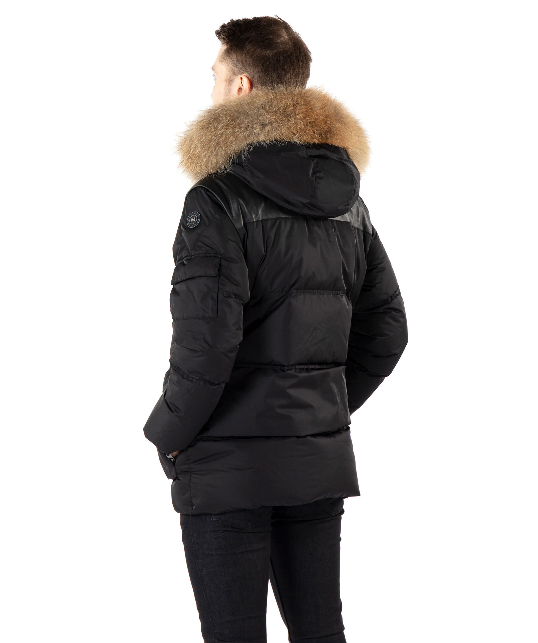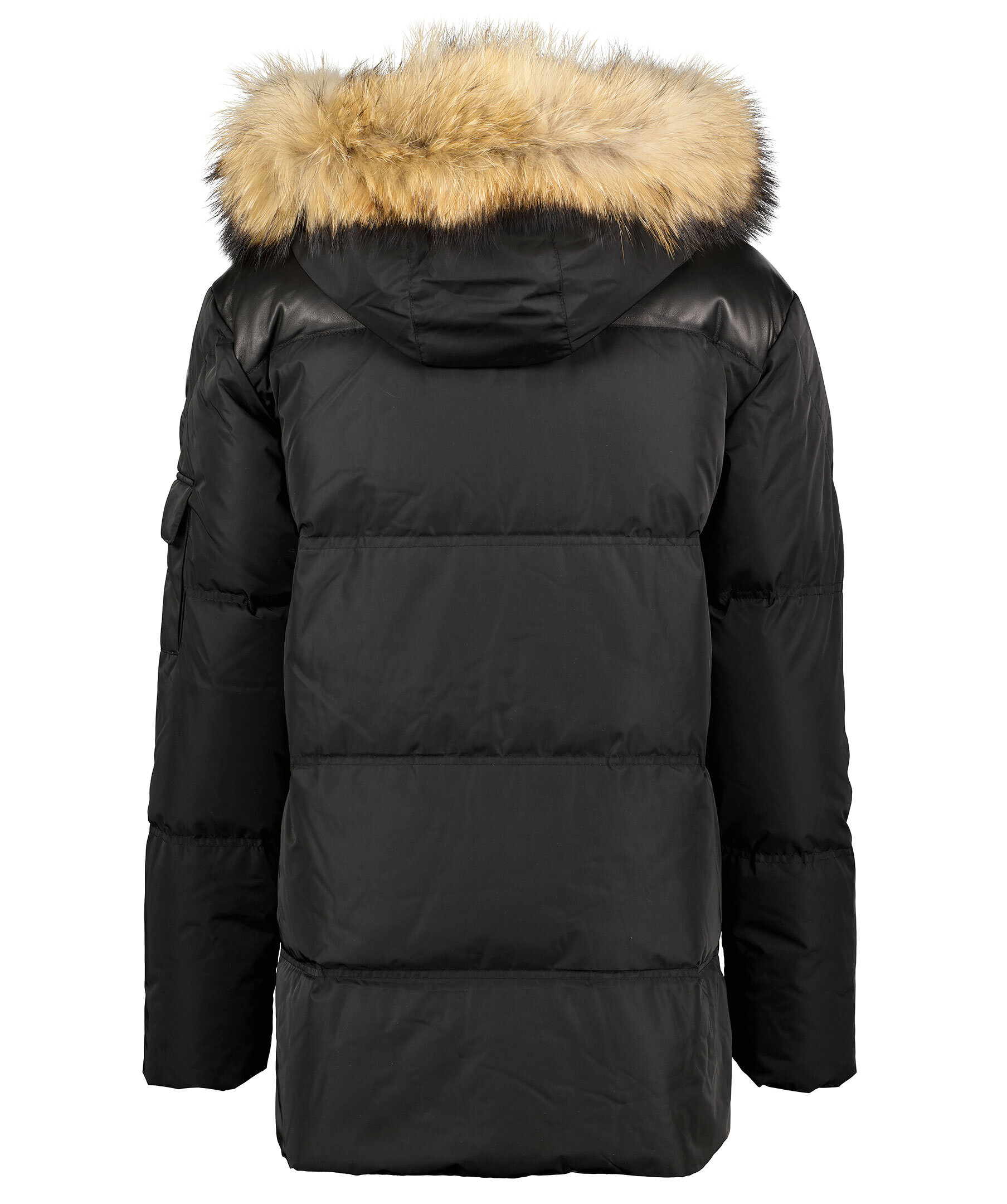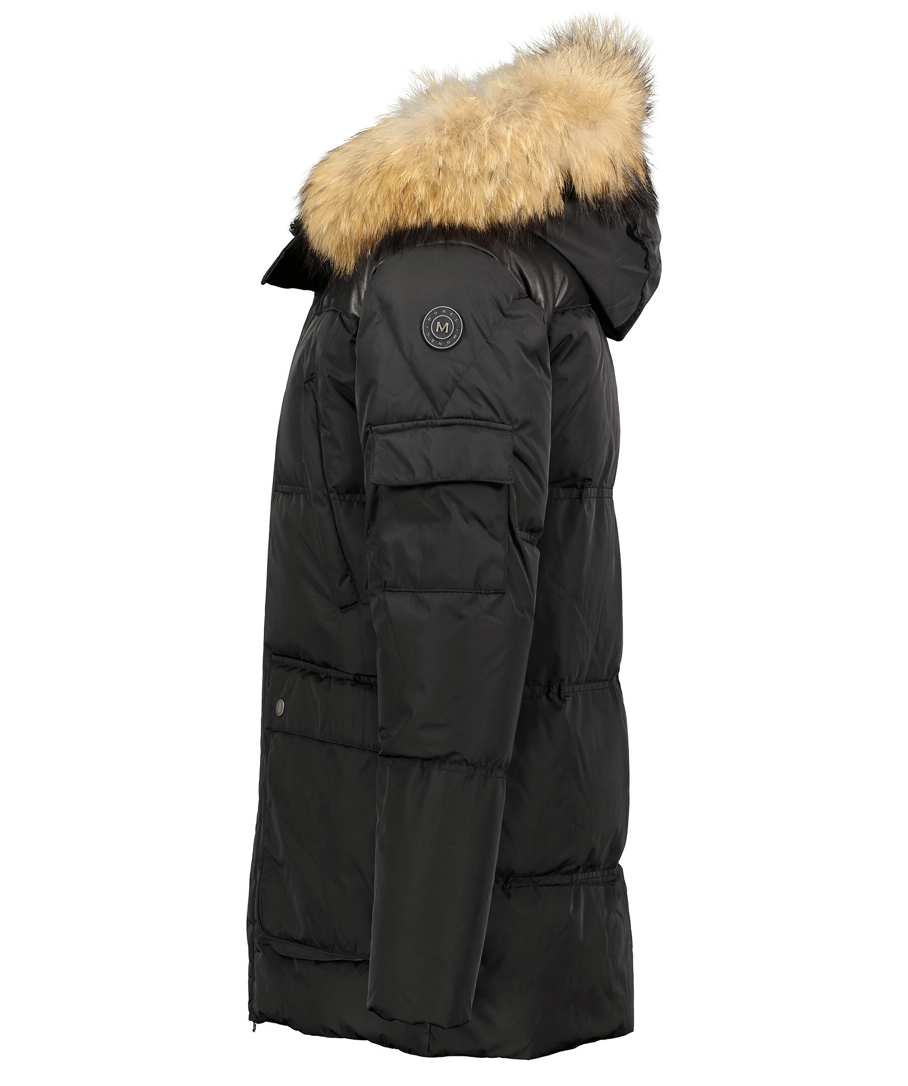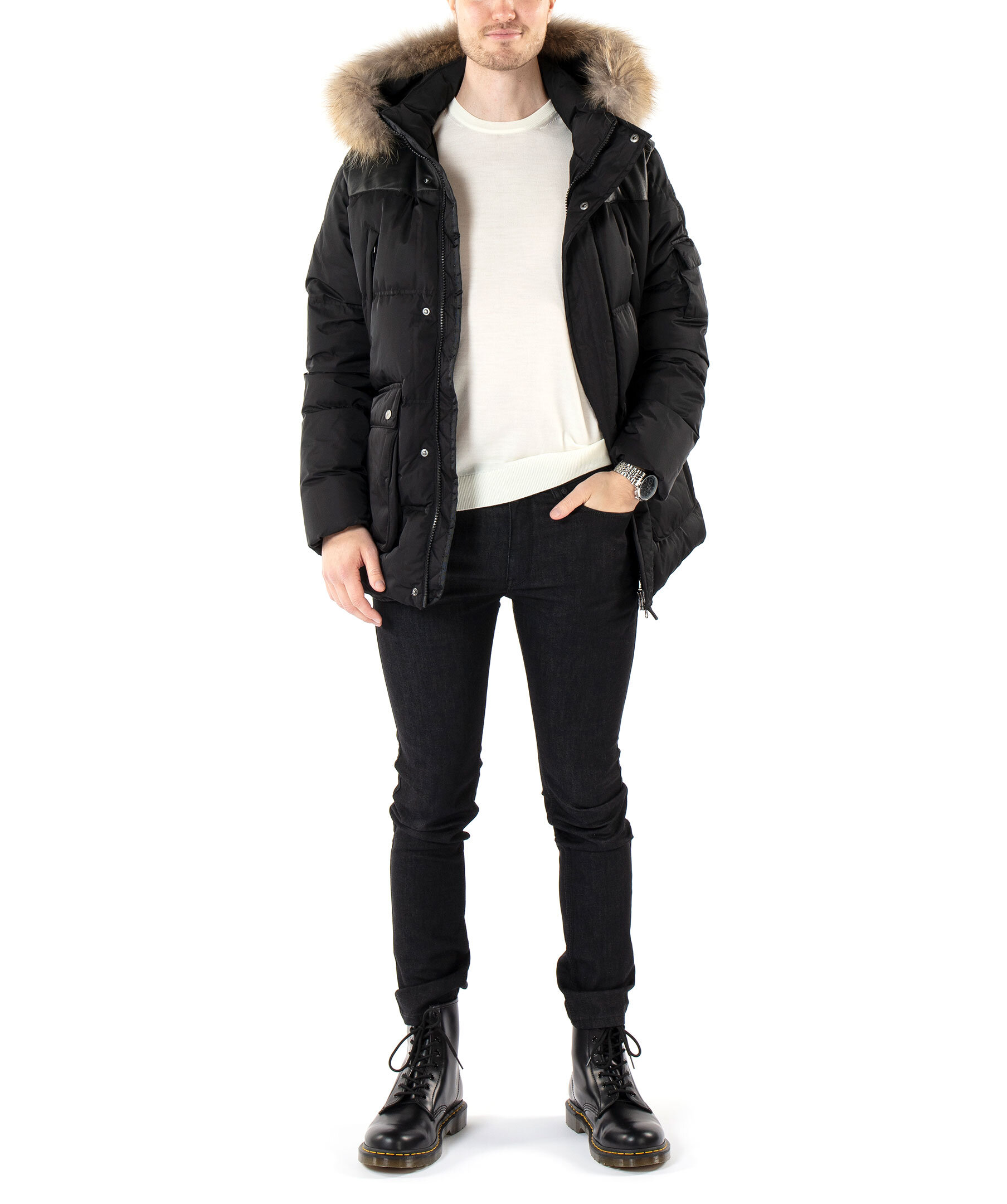 Svart, dunparkas med luva från Monel. Jackan har avtagbar luva samt naturfärgad pälskrage som även den går att ta bort. Jackan stängs med dold tvåvägsdragkedja och tryckknappar. Två fickor med ficklock och tryckknappar och två fickor bakom dem som stängs med dragkedja, två snedställda bröstfickor med dragkedja och två innerfickor. Ficka med ficklock och tryckknapp på vänster ärm samt patch i gummi med logotyp i metall ovanför. Svarta detaljer i läder ovanför bröstet och upptill på ryggen och muddar i ärmslut. Yttermaterial i 100% polyester och fyllning med dun. TIPS! Ånga pälsen för att få den stor och fluffig. Modellen är 188cm lång och har på sig storlek M.