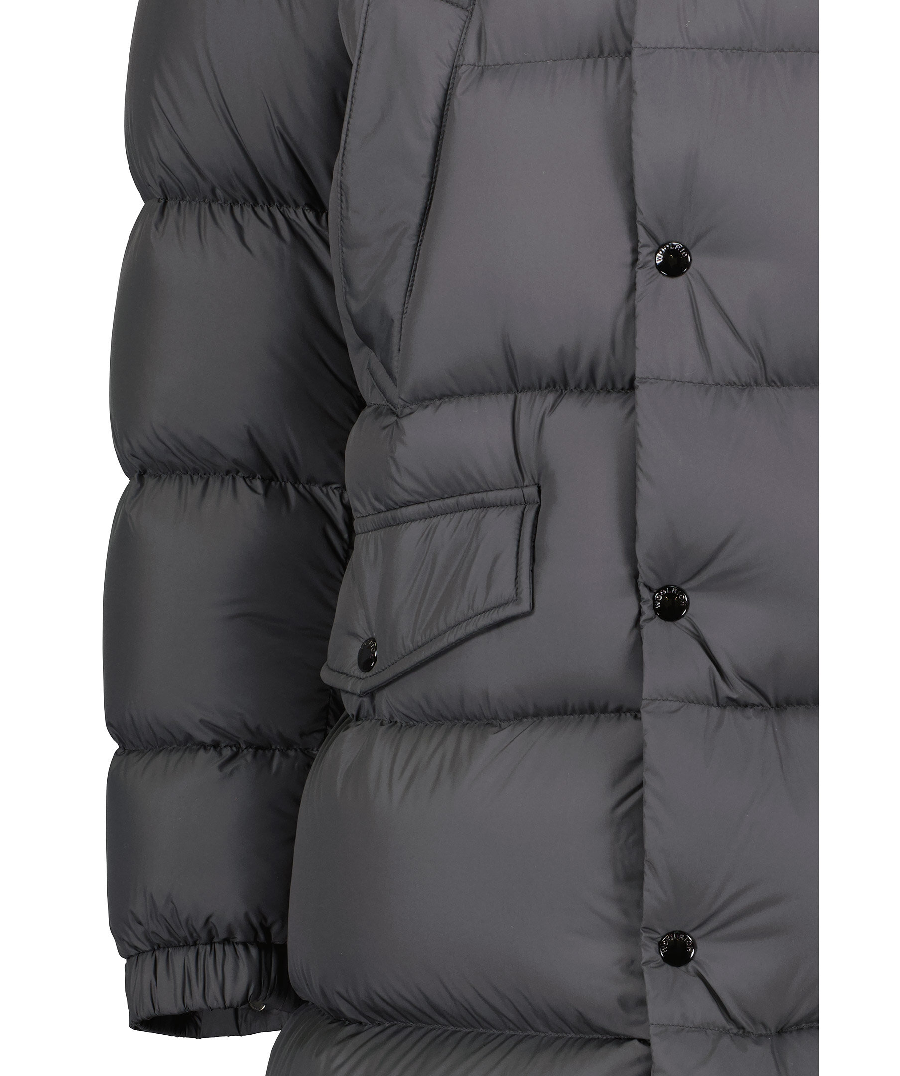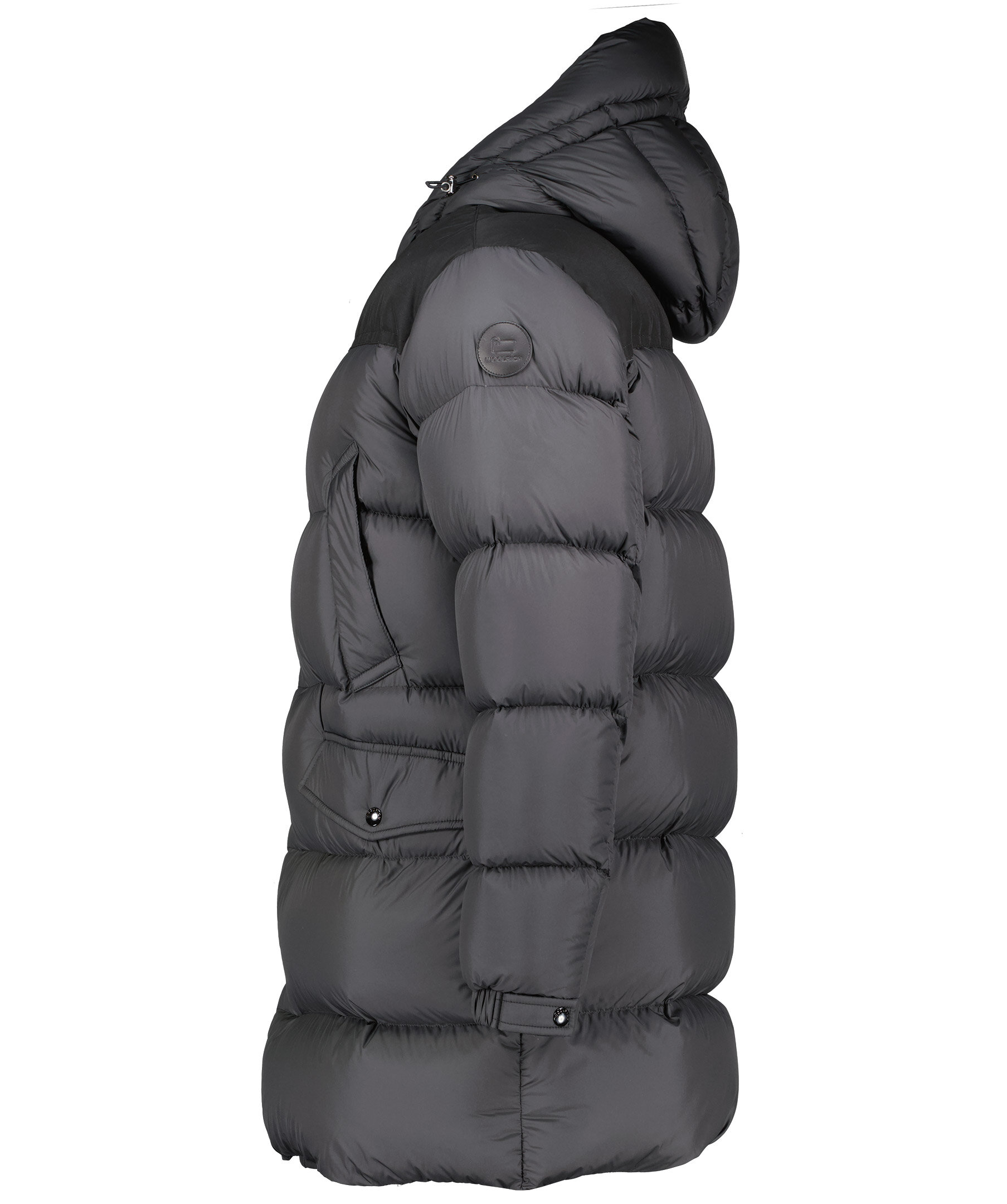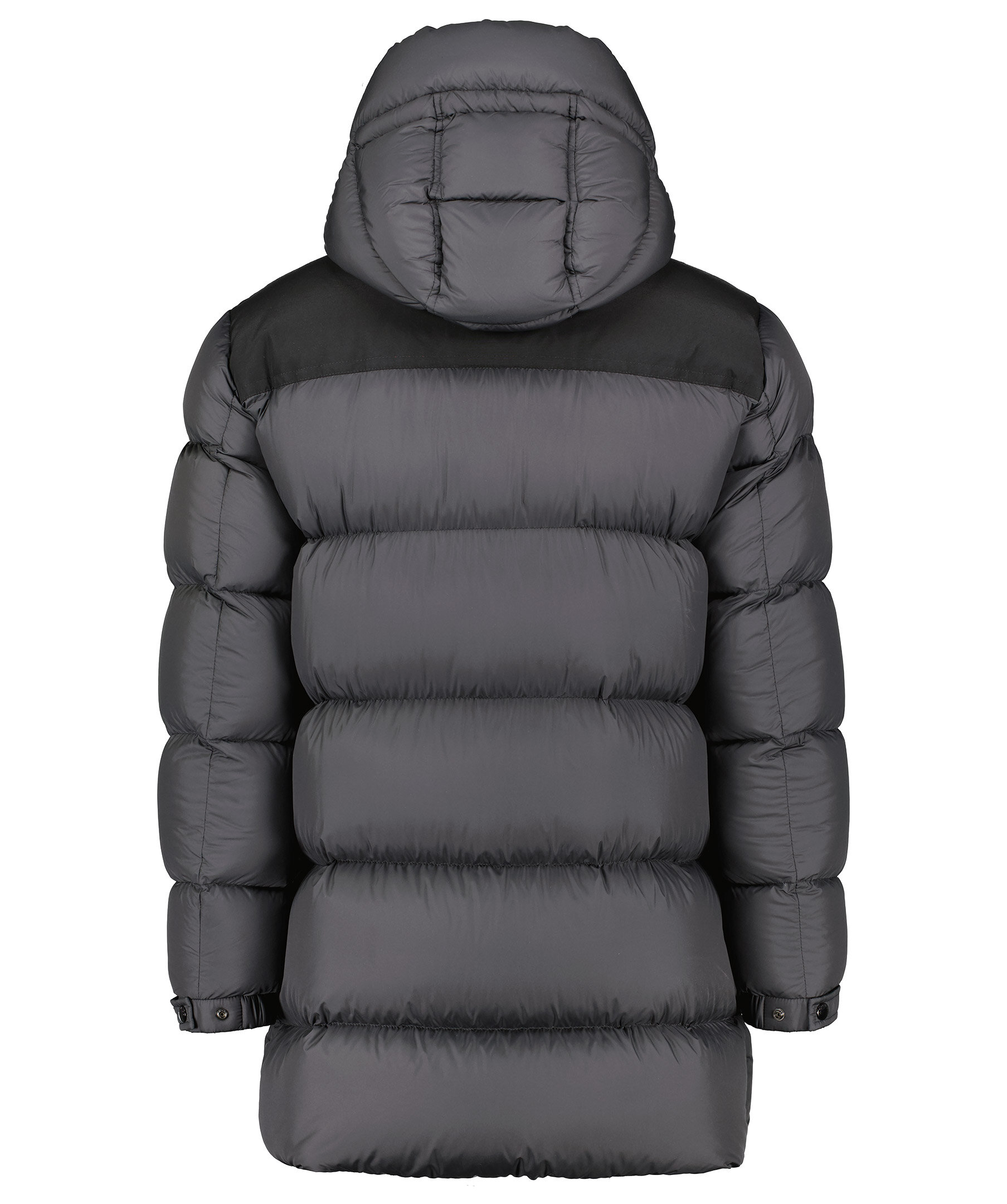Svart dunparkas som stängs framtill med knappar och tvåvägsdragkedja. Fyra fickor framtill som stängs med tryckknappar. Innerficka som stängs med dragkedja. Luva med dragsko. Resår vid ärmslut. Panel med vävt material vid axlarna.