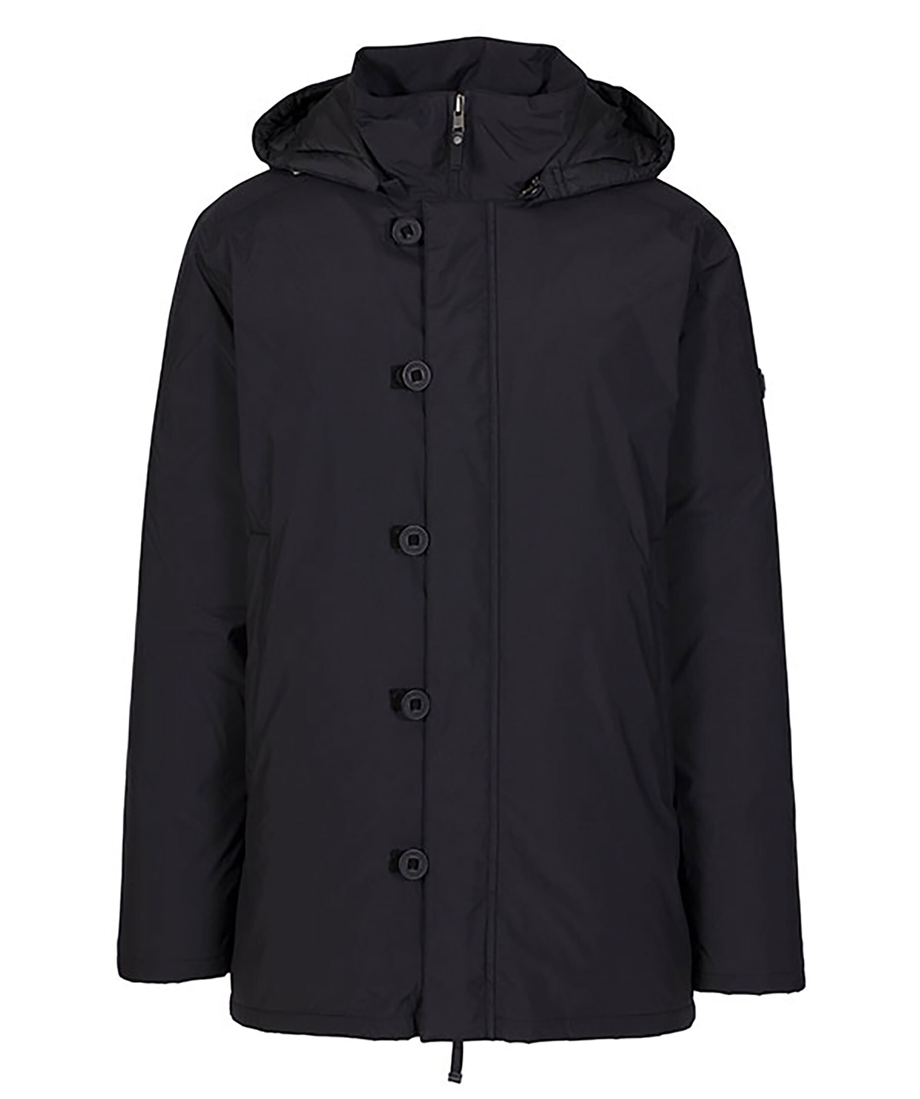 Svart dunjacka från Cedrico. Tillverkad i polyester med dunfyllning. Avtagbar luva, två fickor fram, knappar framtill, lammskinnsdetaljer.