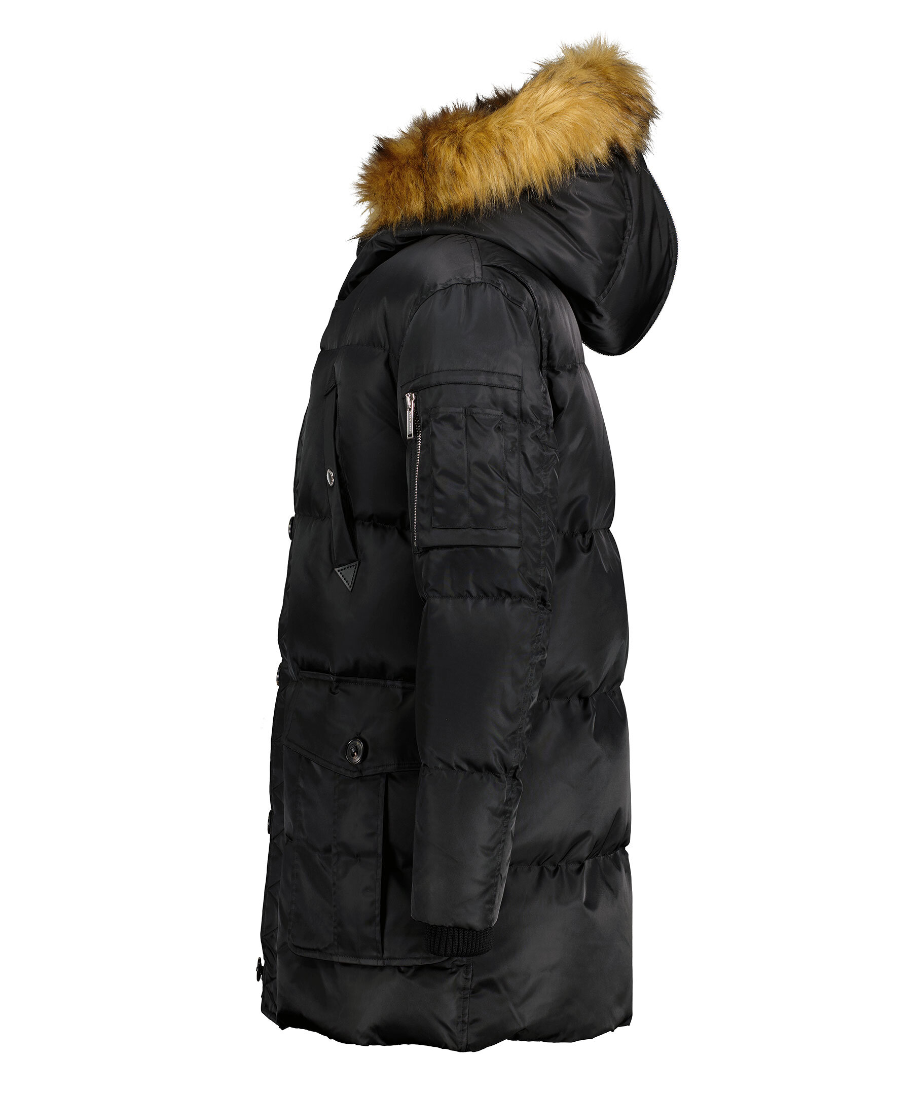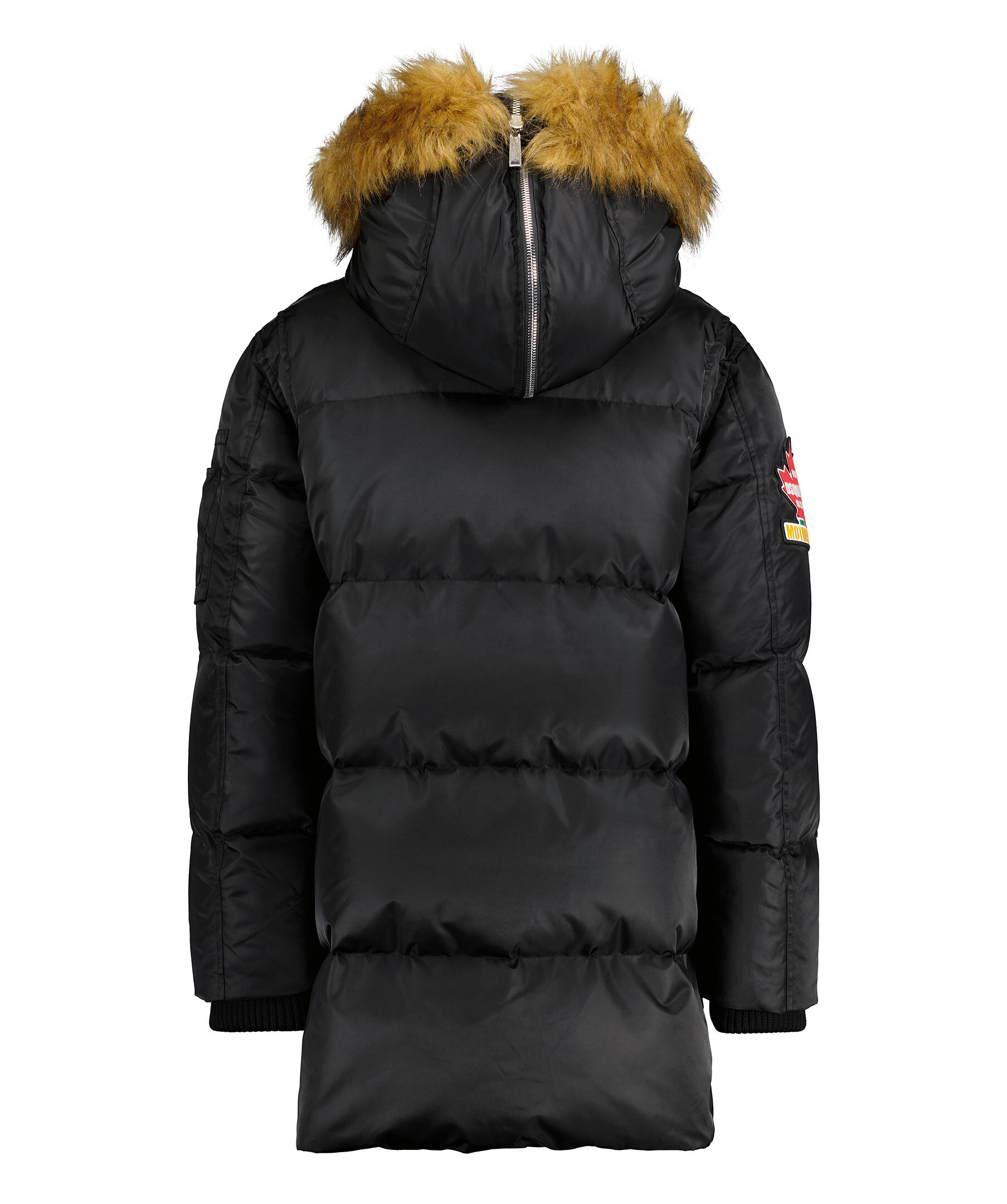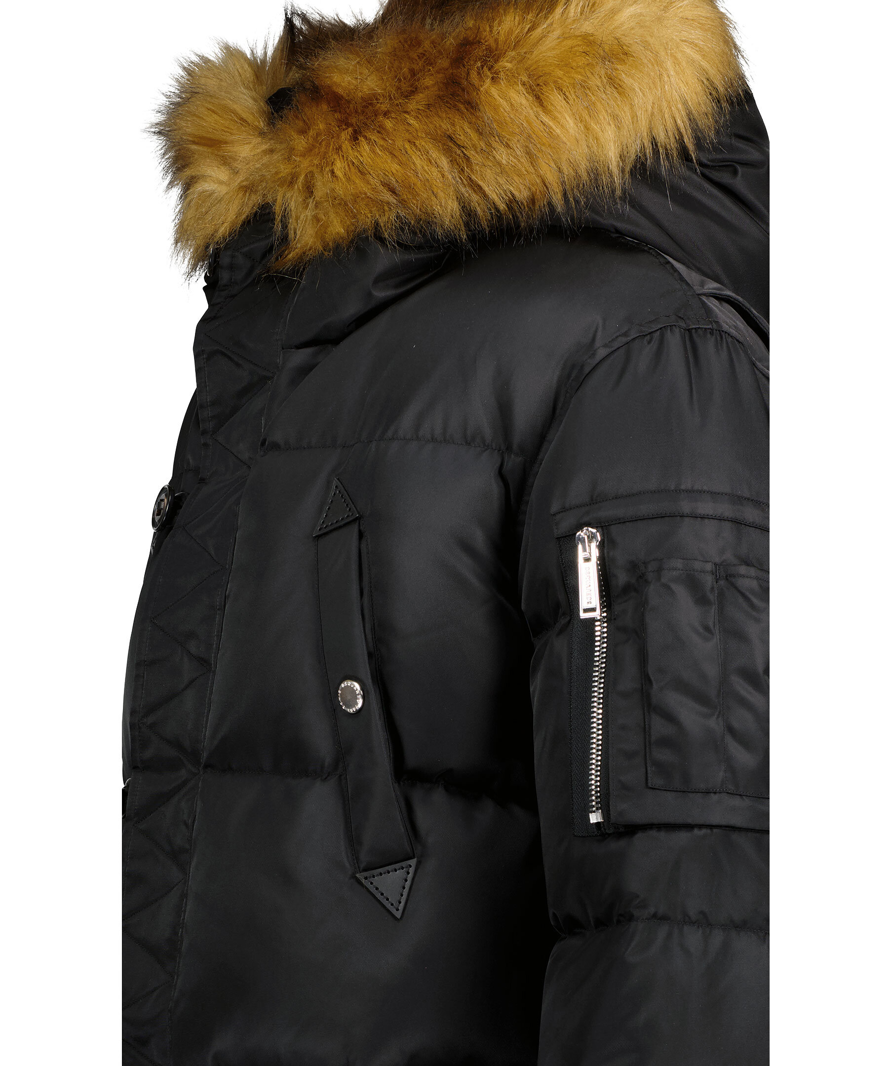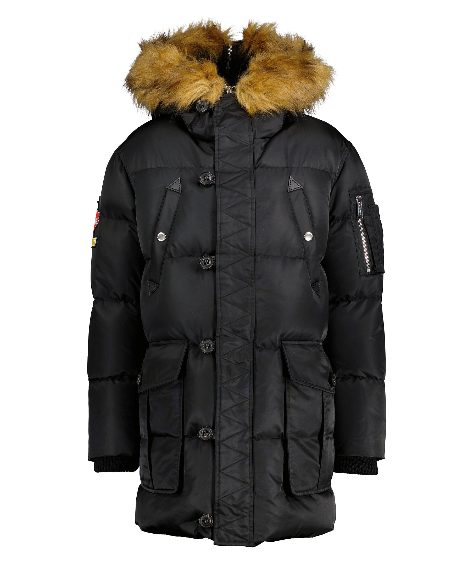 Svart puffer parka jacka med huva från Dsquared2. Jackan stängs med dold tvåvägsdragkedja och knappar. Två bröstfickor med knapp samt två vanliga fickor med knapp. En ficka med dragkedja på vänster ärm samt pennfickor. Stor patch logotyp på höger ärm. Tillverkad i polyamide.
