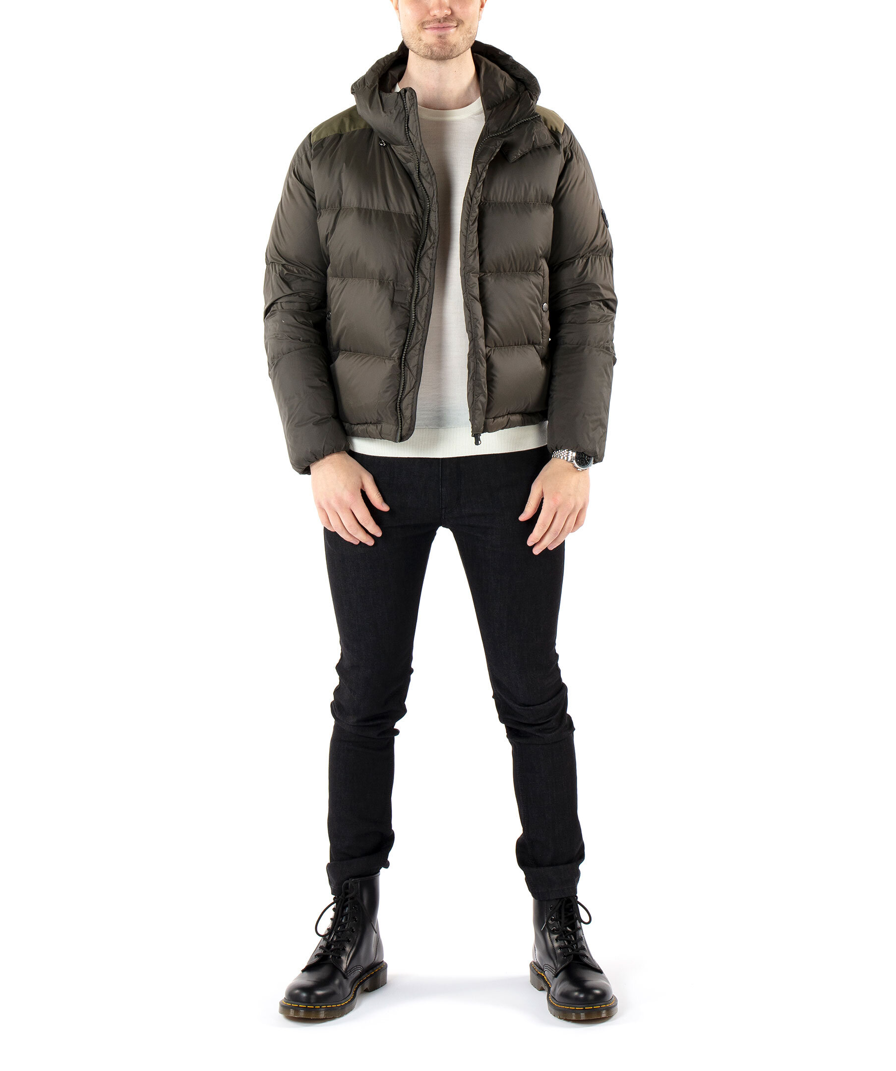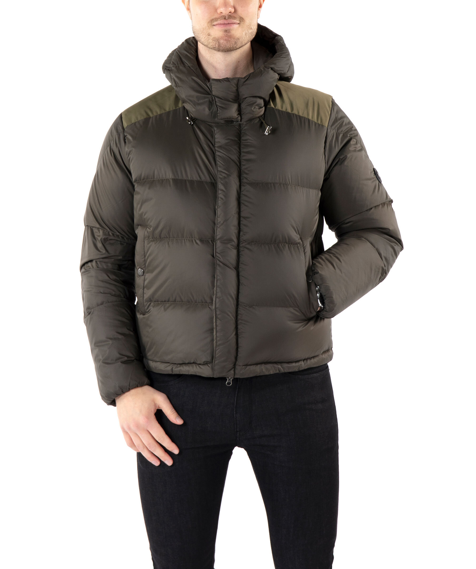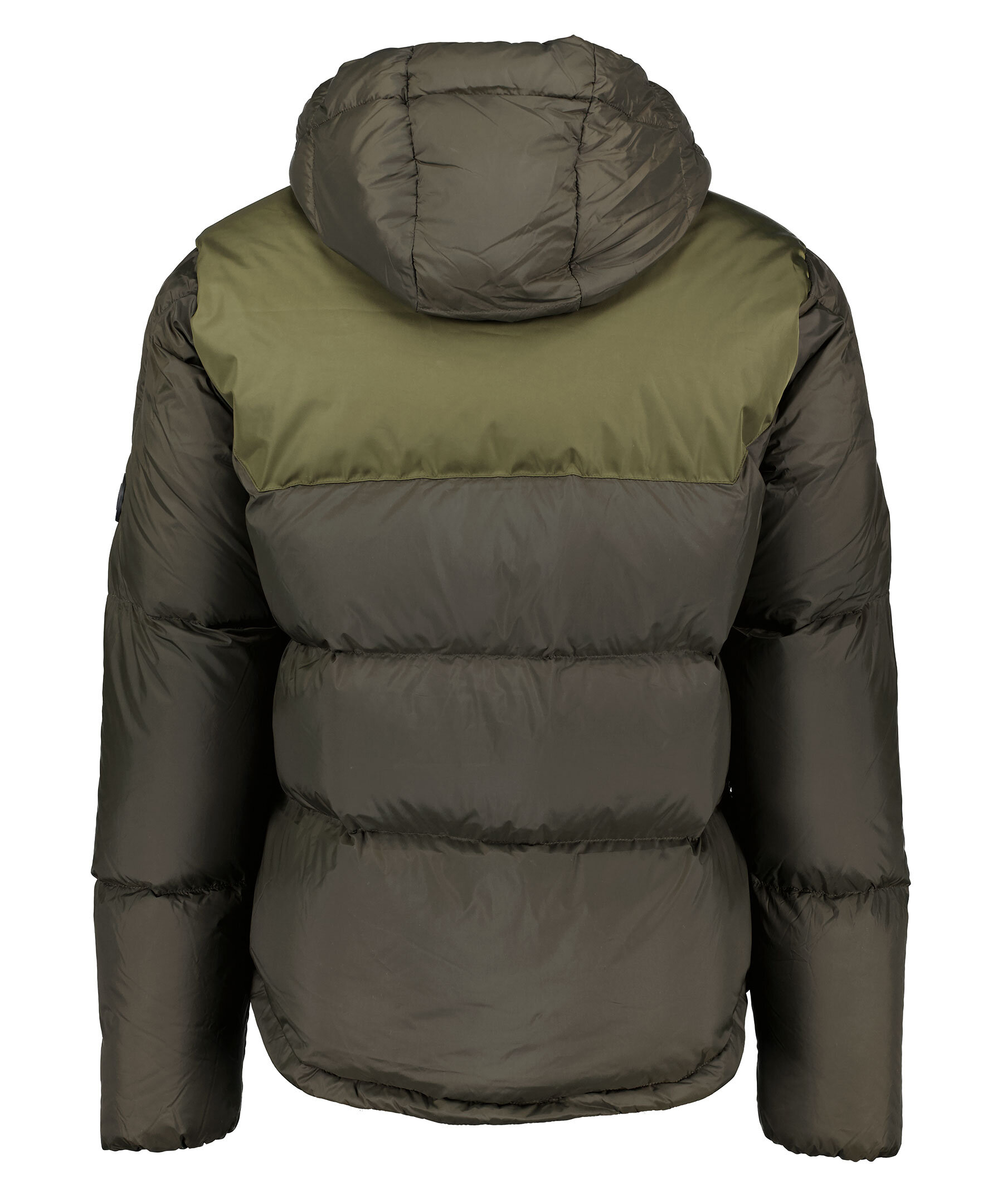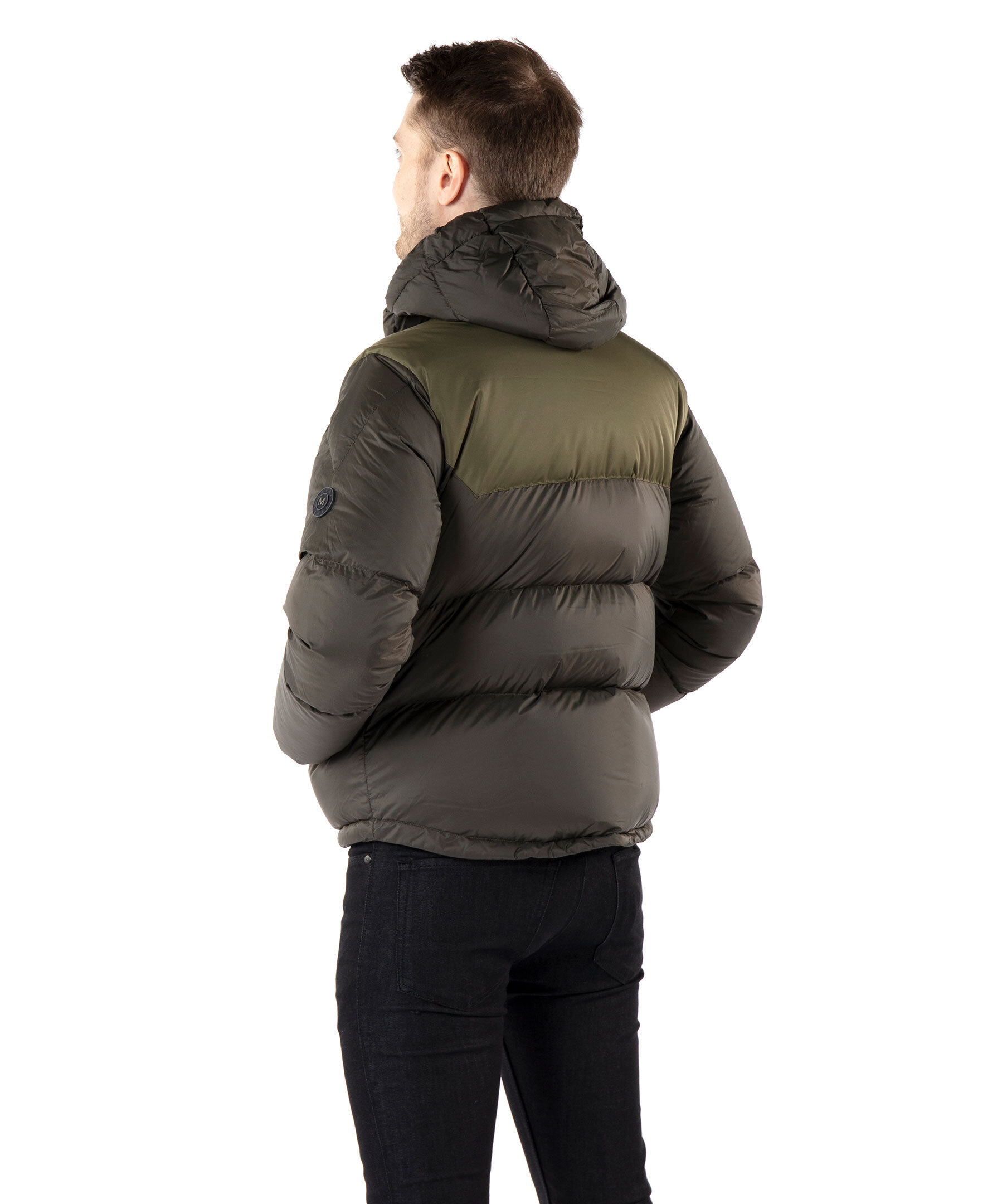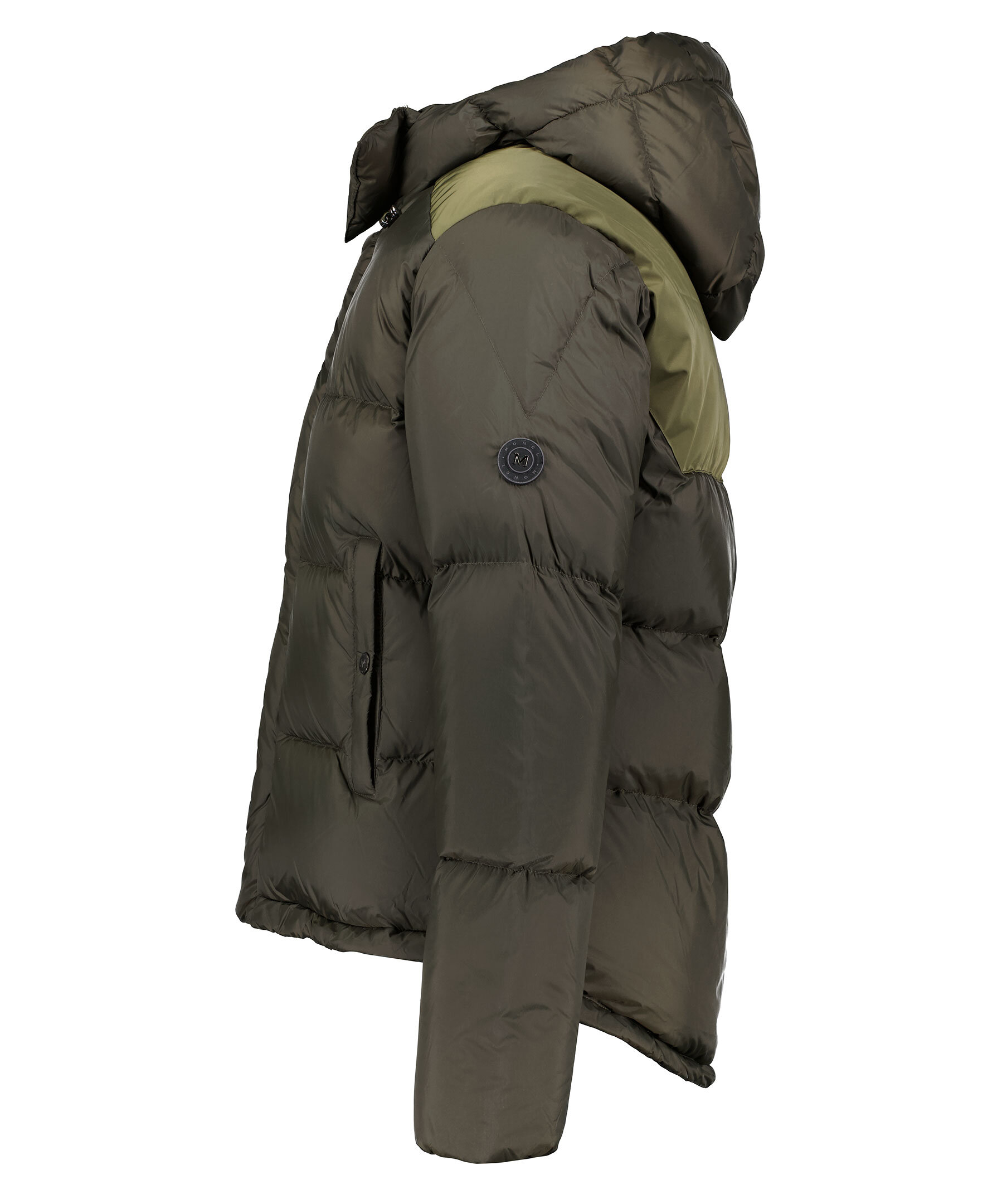 Kort, skogsgrön puffer med dunfyllning från Monel. Stängs framtill med tvåvägsdragkedja och magneter. Luva med dragsko. Vävda paneler i ljusare grönt över axlarna och på ryggen. Två fickor framtill som stängs med tryckknappar, två innerfickor med dragkedja. Gummerad patch med logotyp i metall på vänster ärm. Dragsko i jackslut. Modellen är 188cm lång och har på sig storlek M.