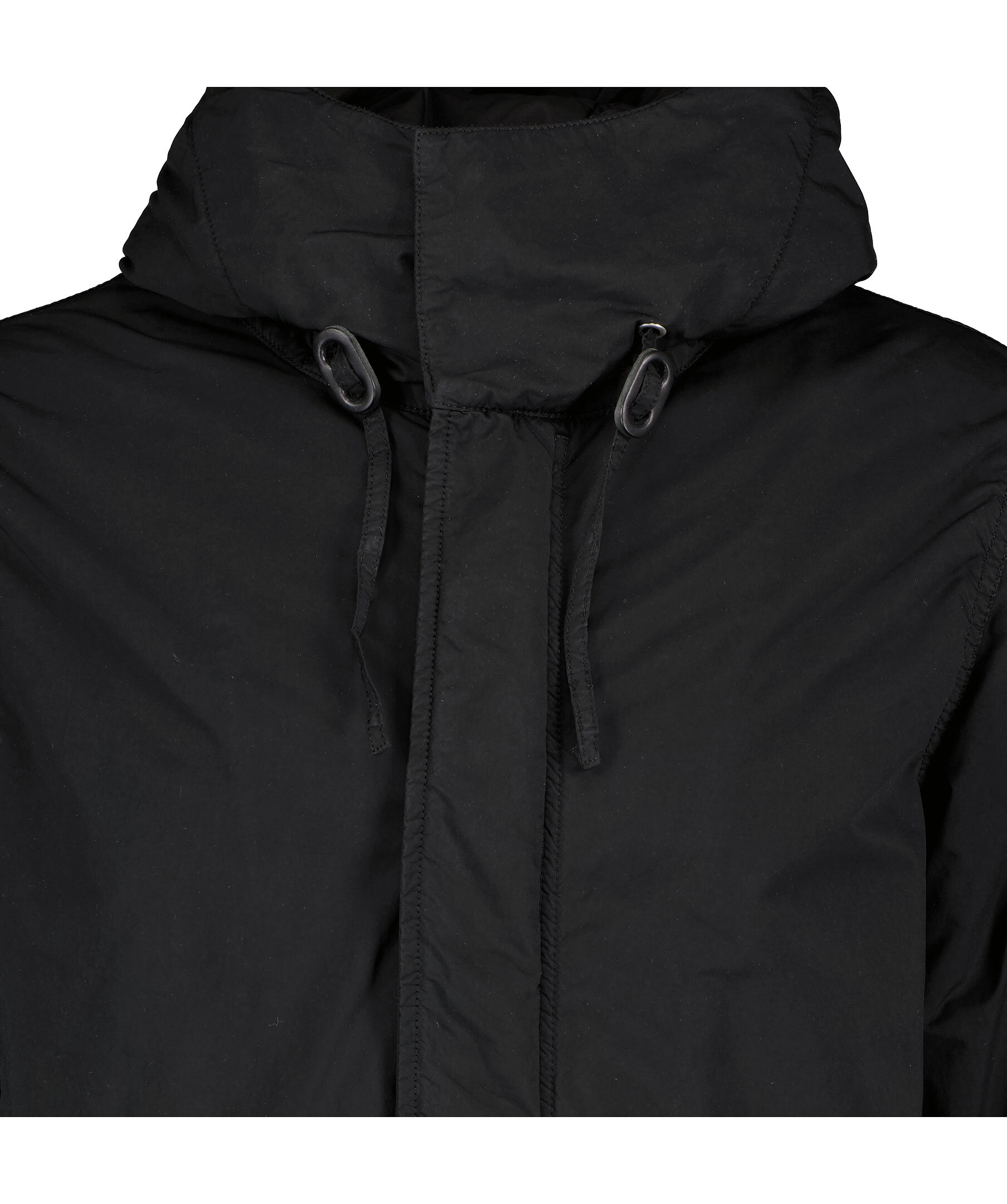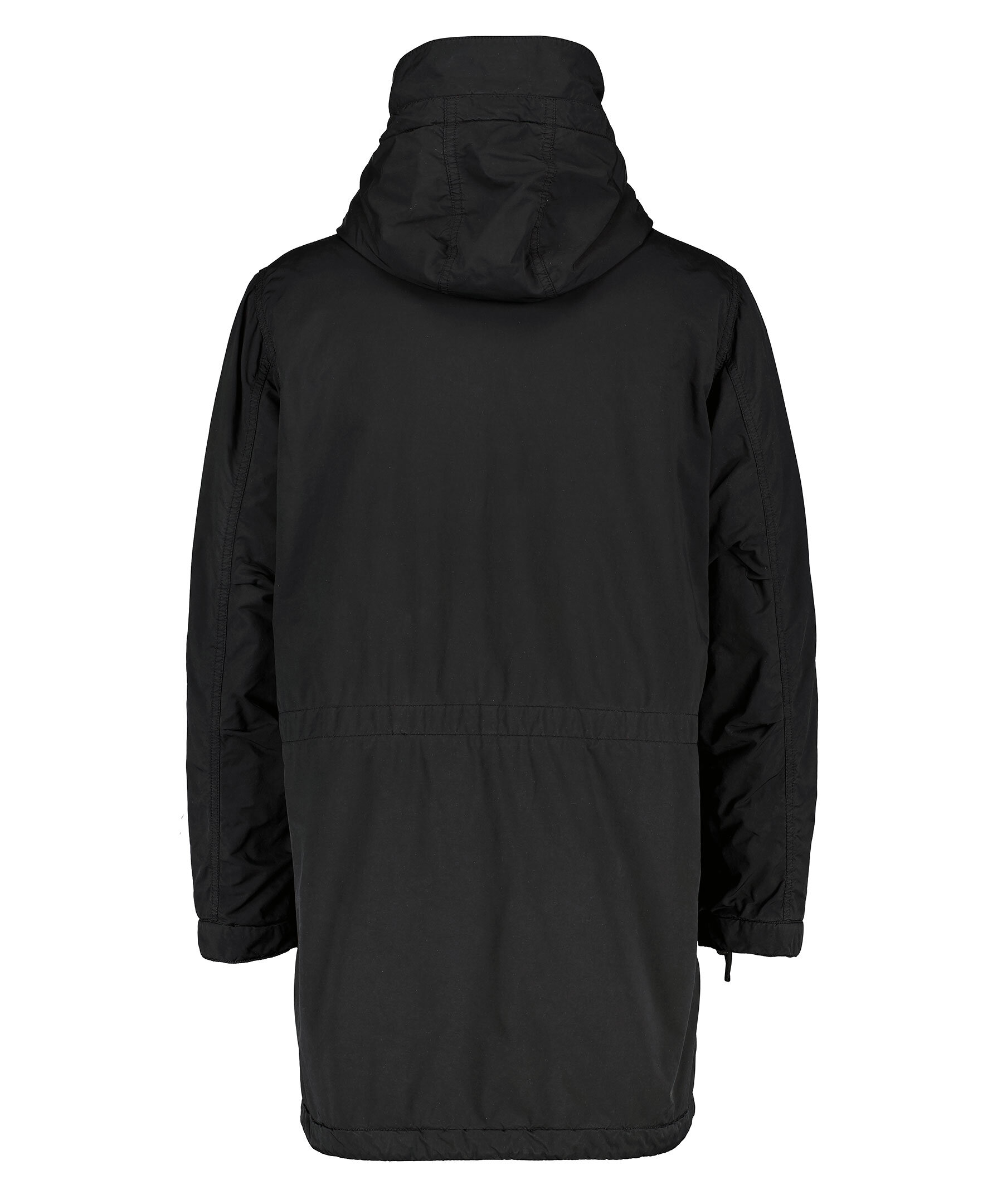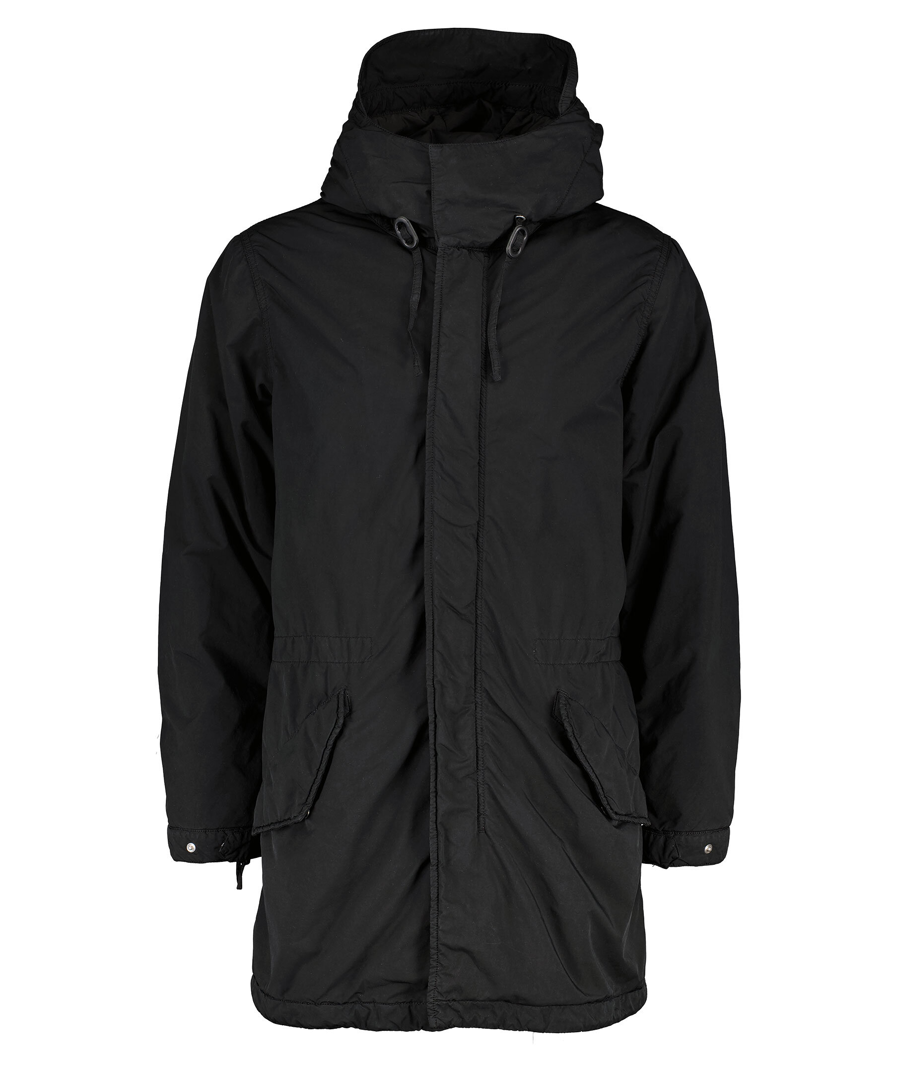 Svart, lång parkas jacka från Aspesi. Tillverkad i en polyester- och polyamidblandning. Jackan är plaggfärgad och vattenavvisande. Vadderad med ultratermiskt vadd. Vindtät lock, ej avtagbar huva och fickor med lock. Dragkedja och dold tryckknapp med vindtät flik. Dragkedja anpassad med mikroinjicerad Aspesi-logotyp. Dragsko vid plaggslut. Normal passform.