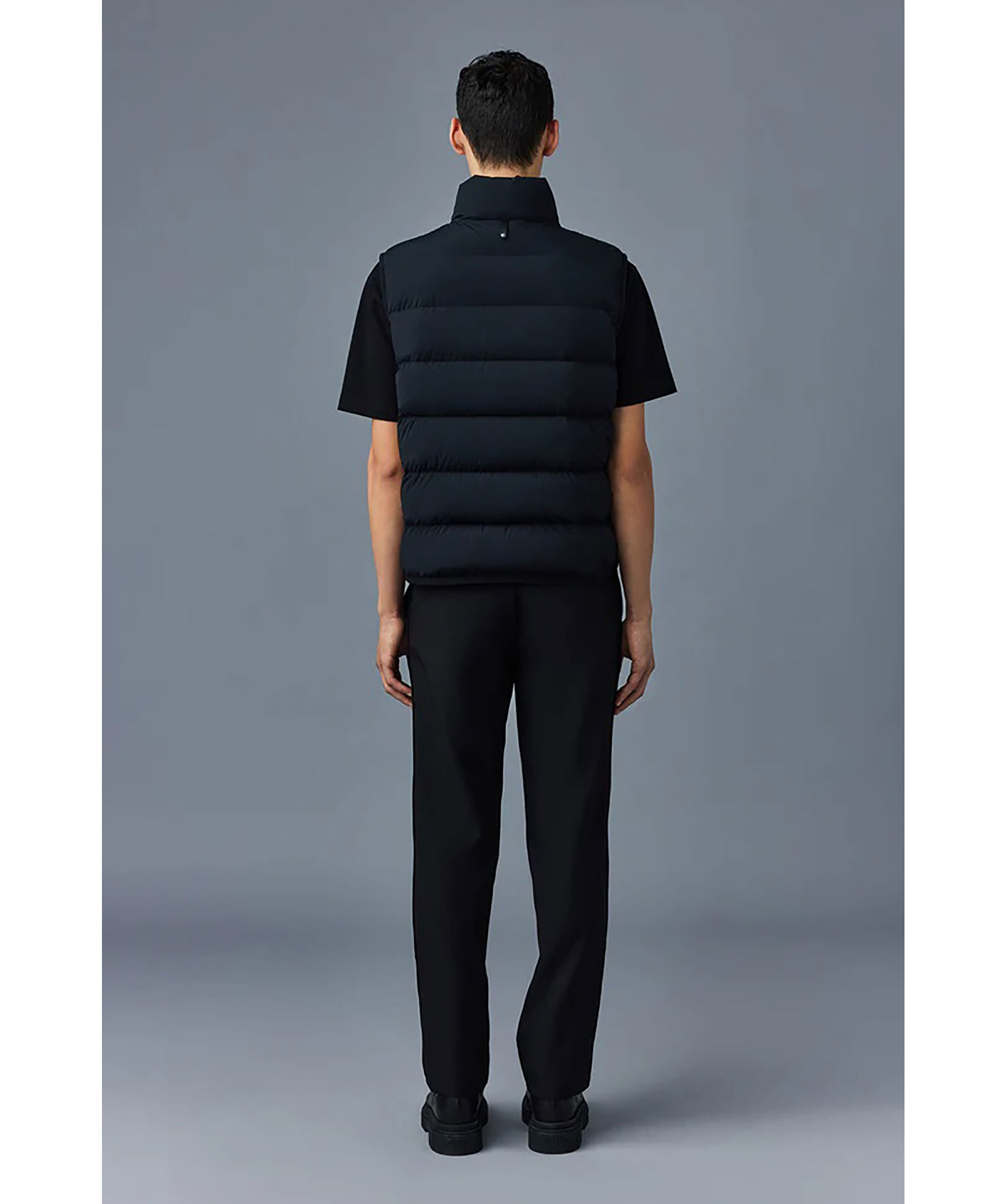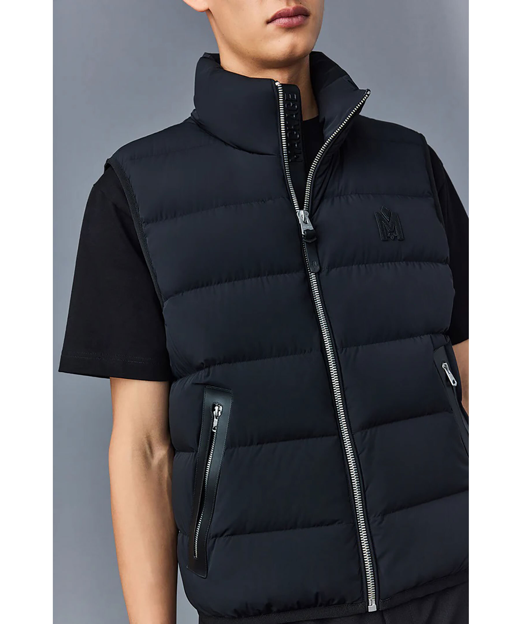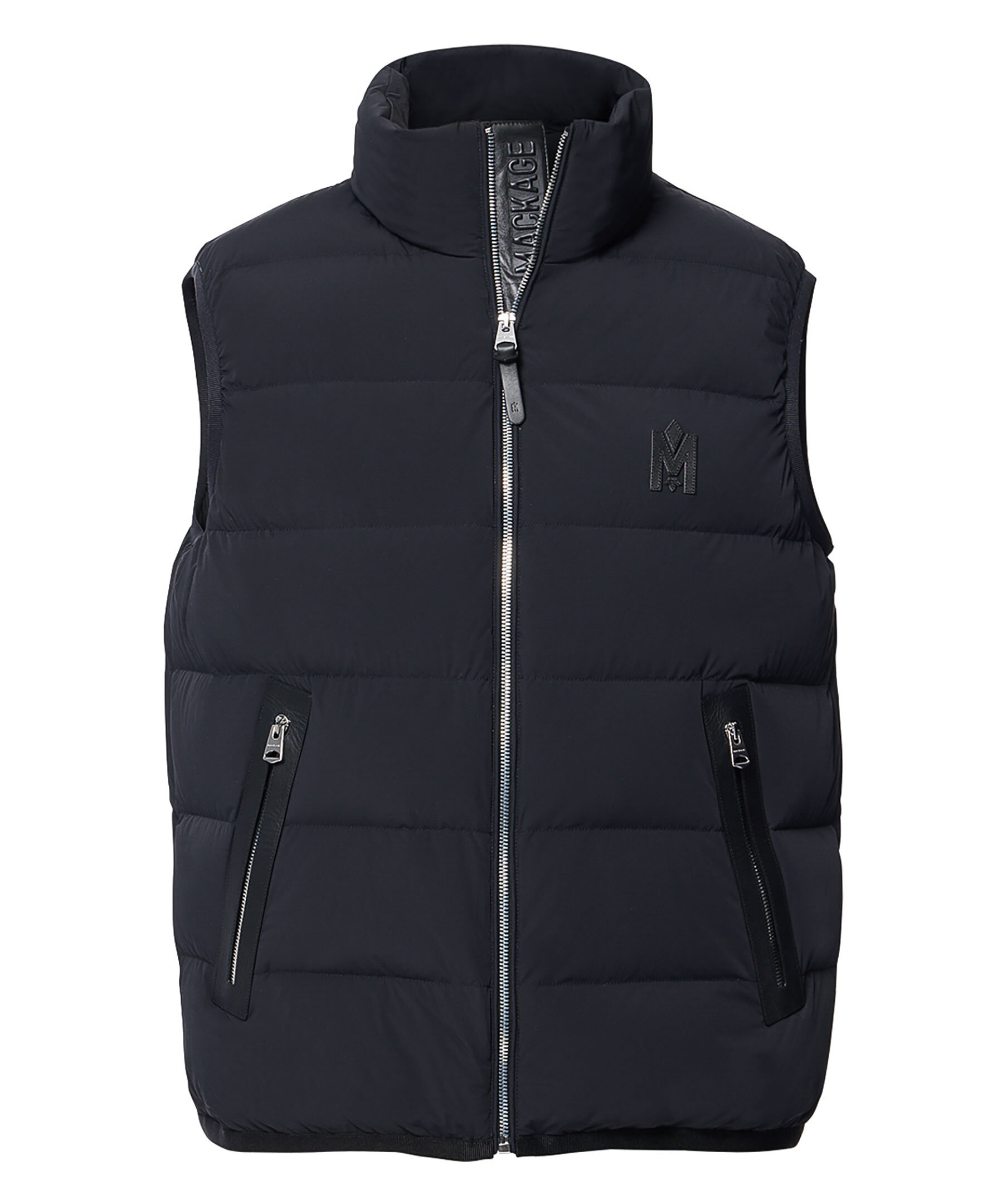Svart, lätt dunväst från Mackage. Hög krage och dragkedja med läderslå framtill. Quiltad med dunfyllnig och tyg i 2-vägs stretch som är vattenavvisande. Fickor i midjan med dragkedja som har kanter i läder. Tunn, elastisk mudd i nederkant och ärmhål. Ett M i läder broderat fram på vänster sida av bröstet. Längd från axel till nederkant: 66,04 cm.