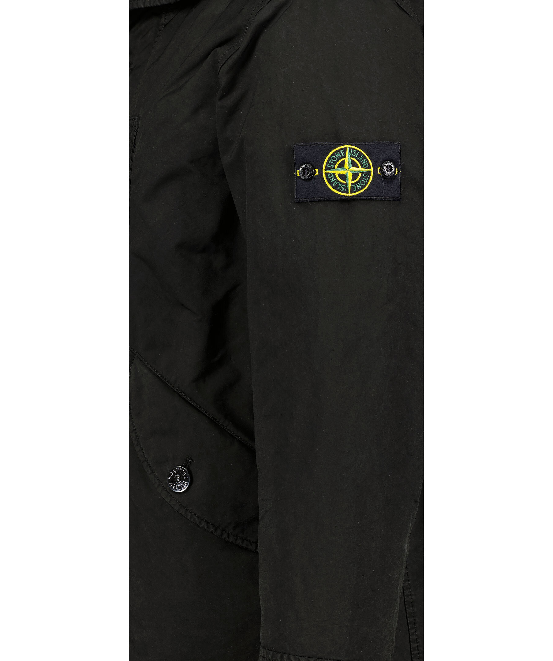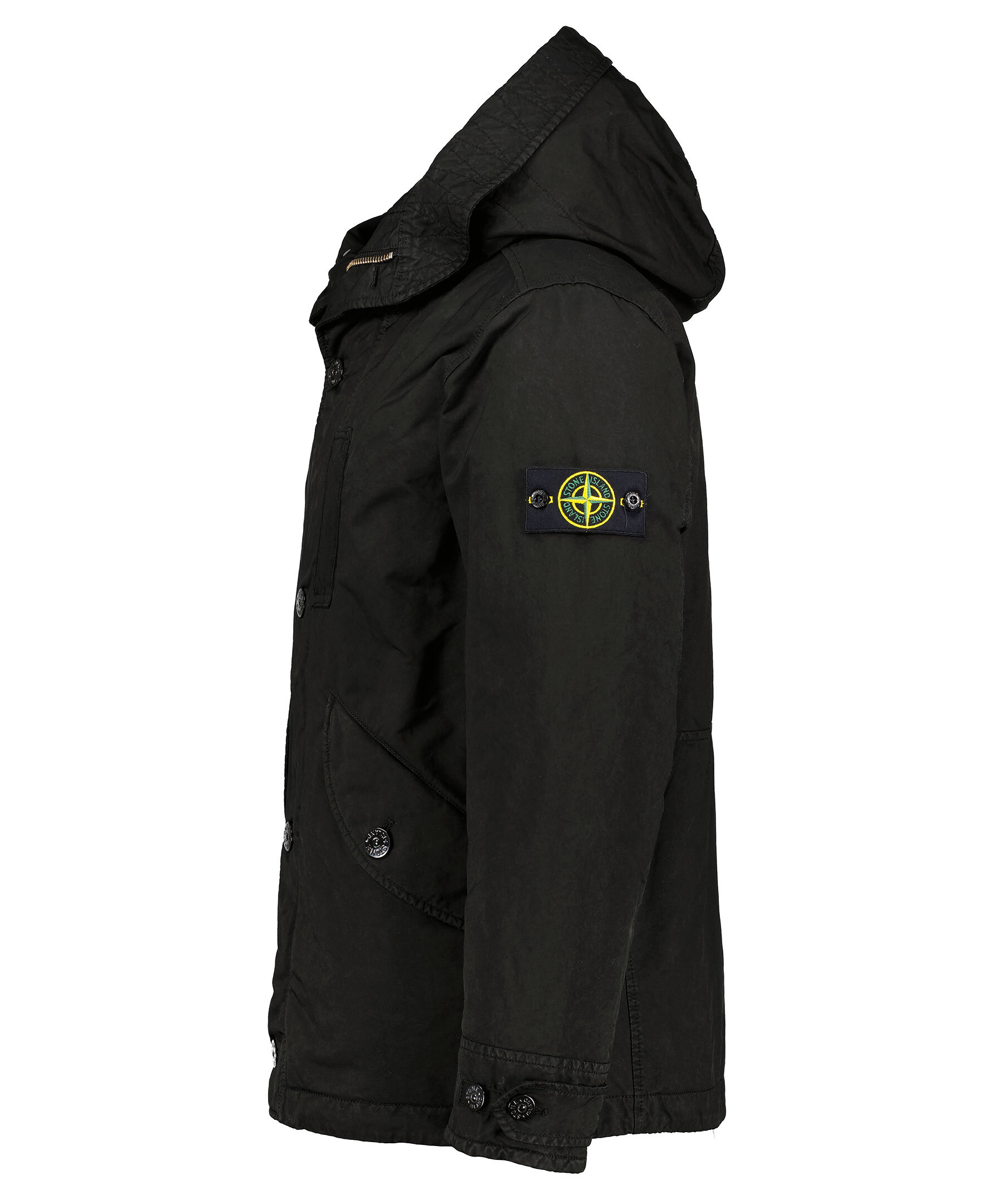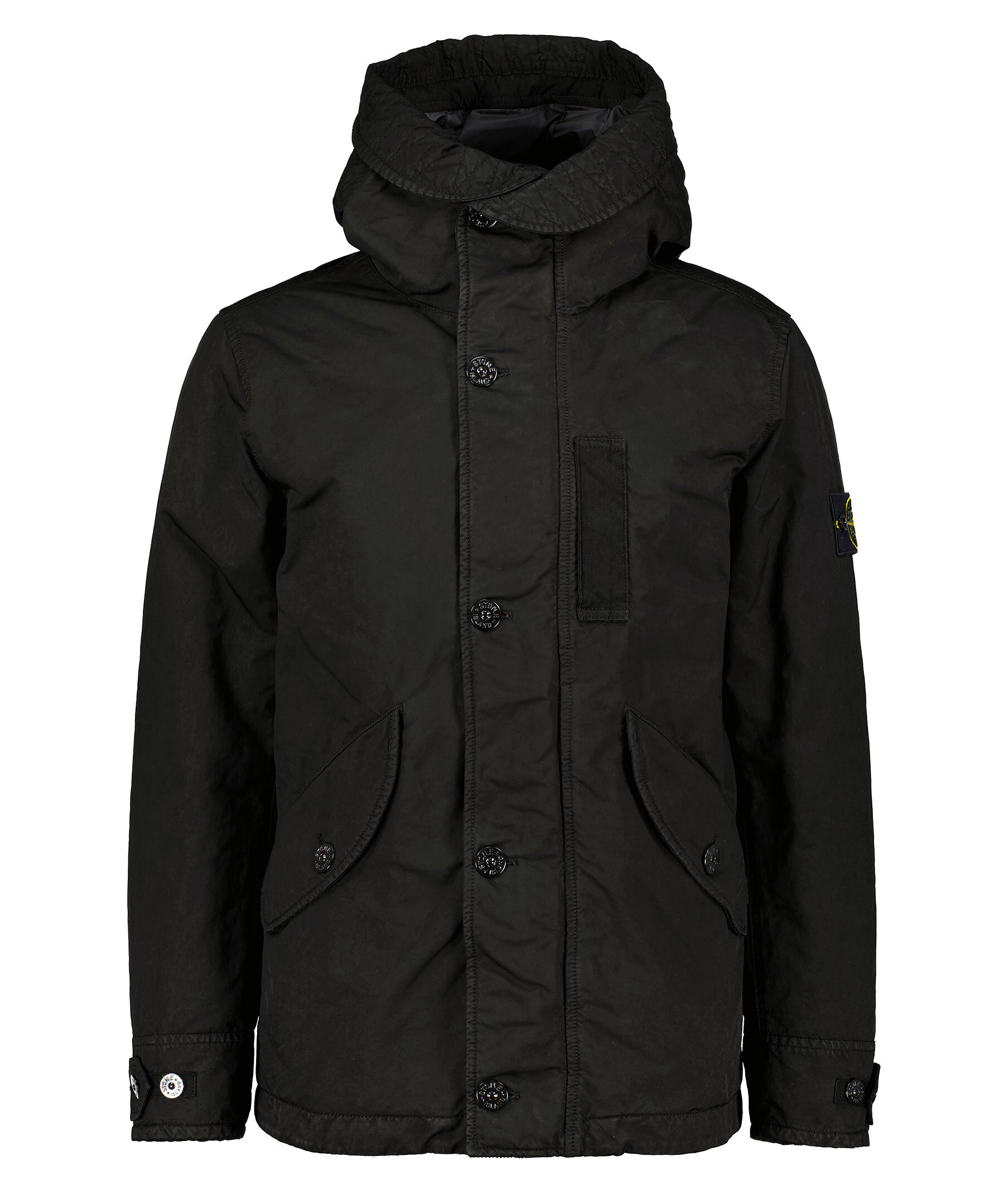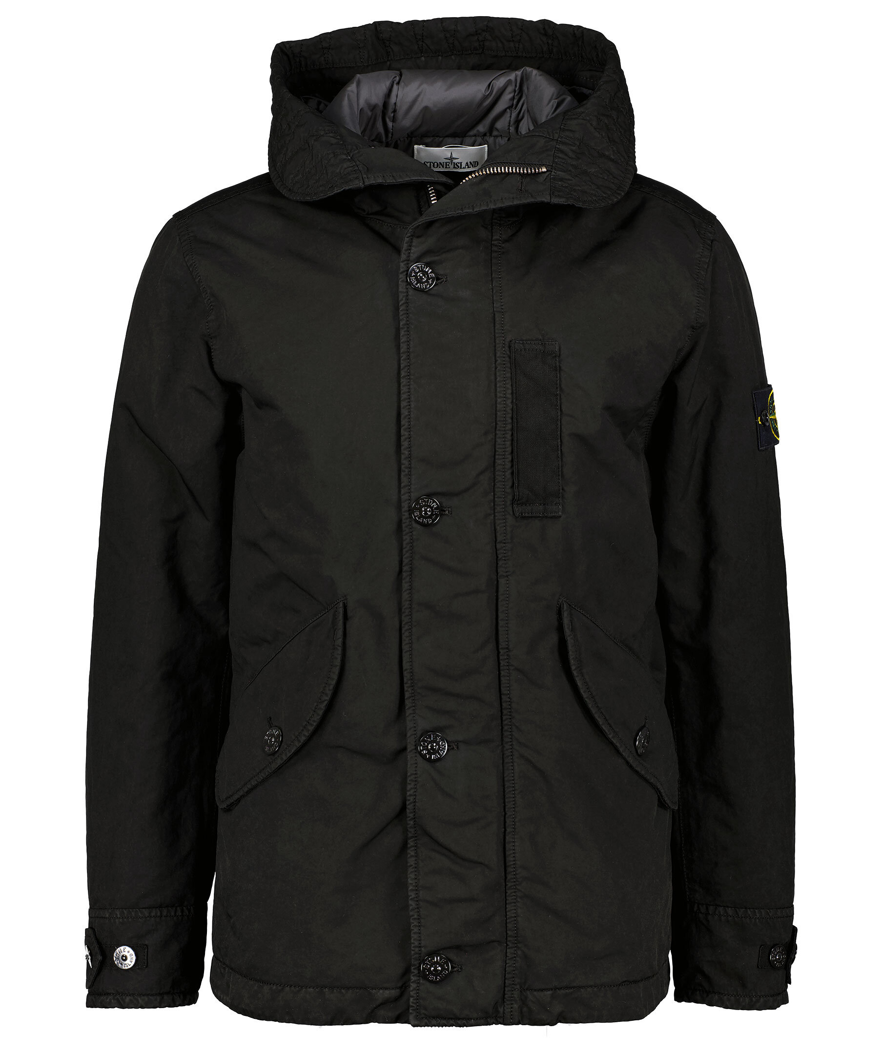 Svart dunjacka från Stone Island. Stängs framtill med tvåvägsdragkedja och knappar. Bröstficka på vänster sida som stängs med tryckknappar. Två fickor framtill som stängs med lock och knappar. Justerbara ärmslut.