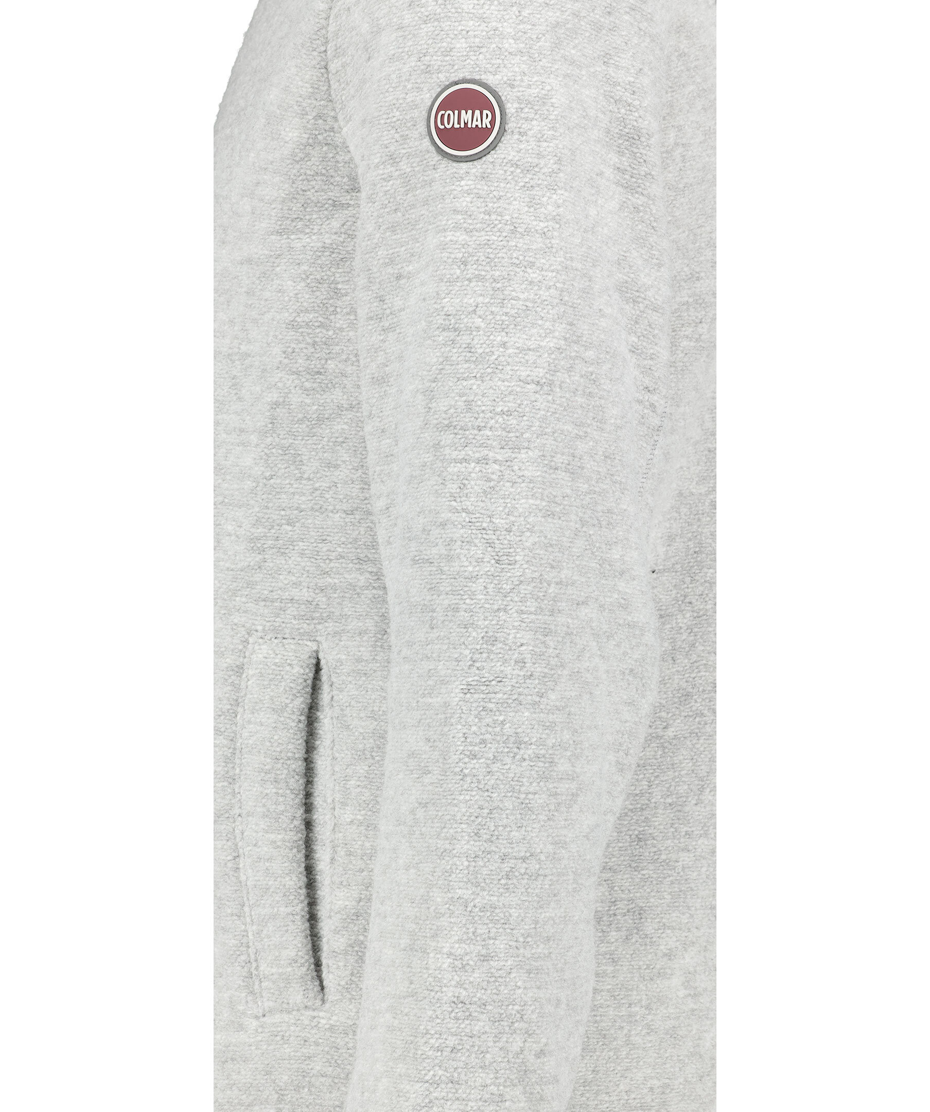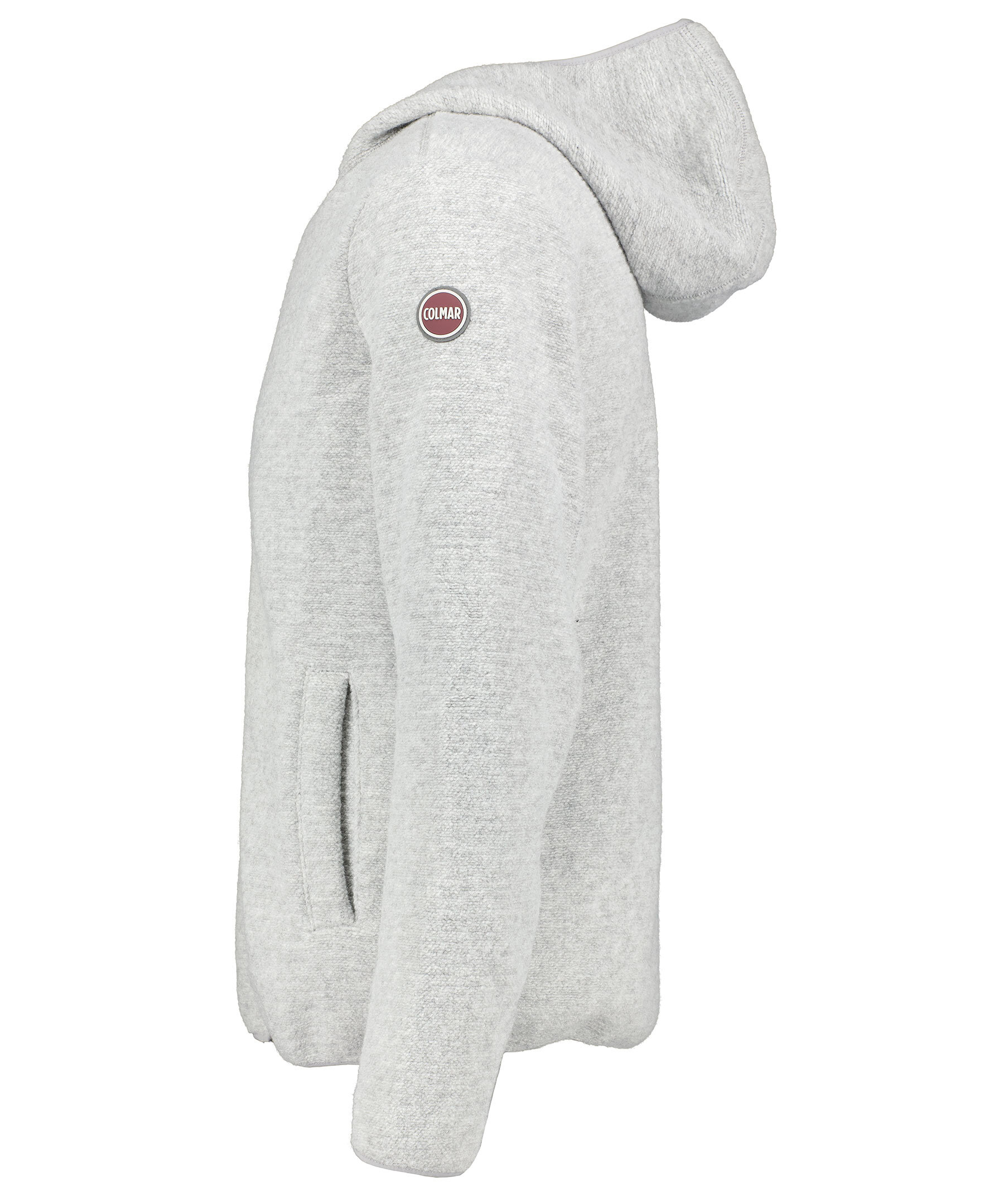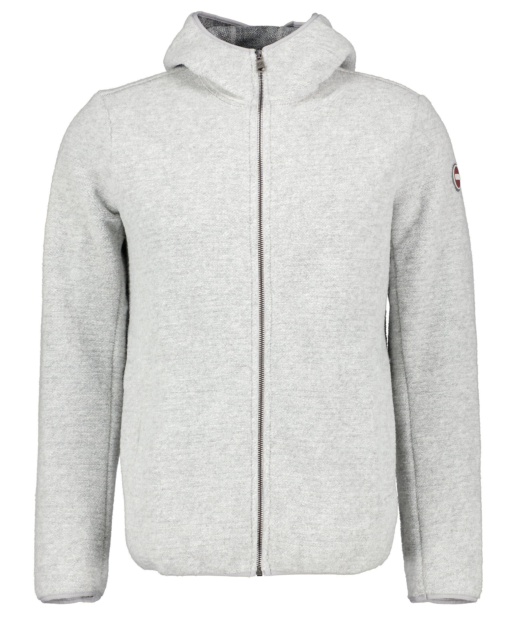 Grå melerad hoodie med dragkedja fram från Colmar. Tillverkad i ullblandning. Elastiskt band på ärmslut, plaggslut och på luvan. Öppna sidofickor, normal passform och logotyp applicerad på vänster ärm.
