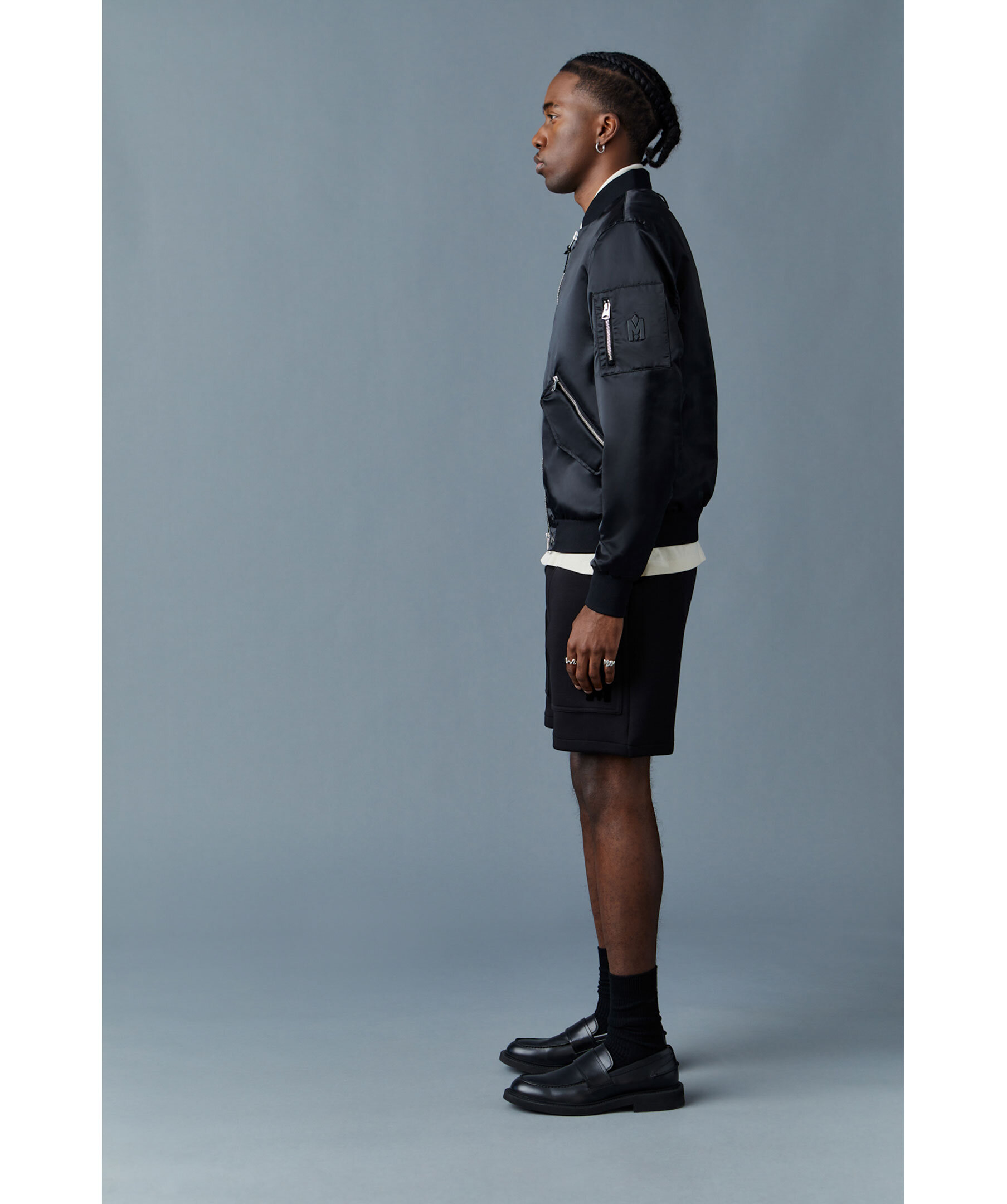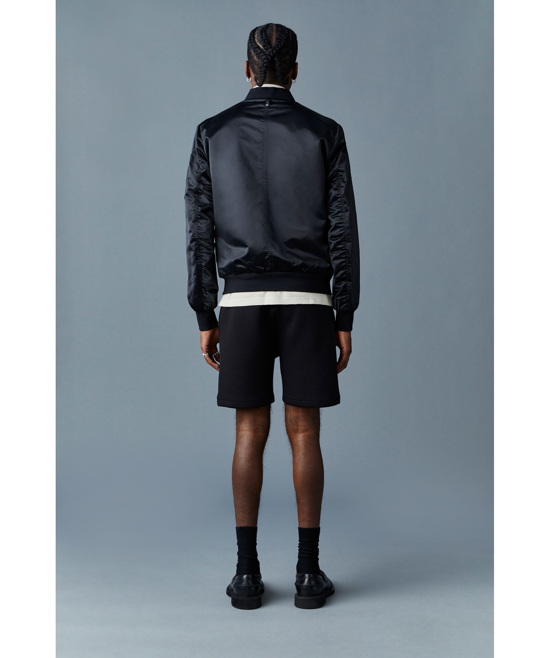 Svart bomberjacka i ett glansigt satintyg från Mackage. Ribbstickad bomberkrage, ärmslut och fåll. Stängs med en tvåvägs dragkedja och har fickor med ficklock och tryckknapp samt en ficka bakom med dragkedja på båda sidorna fram. Patchficka med dragkejda och logotyp i matt, svart metall ovanpå fickan på den vänstra ärmen.