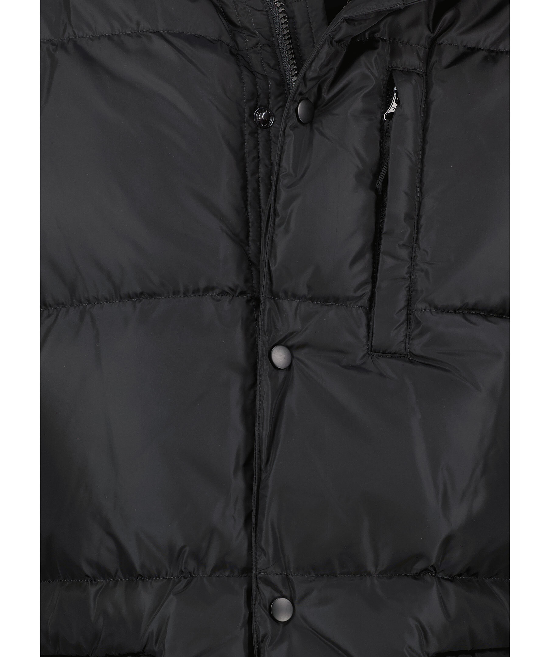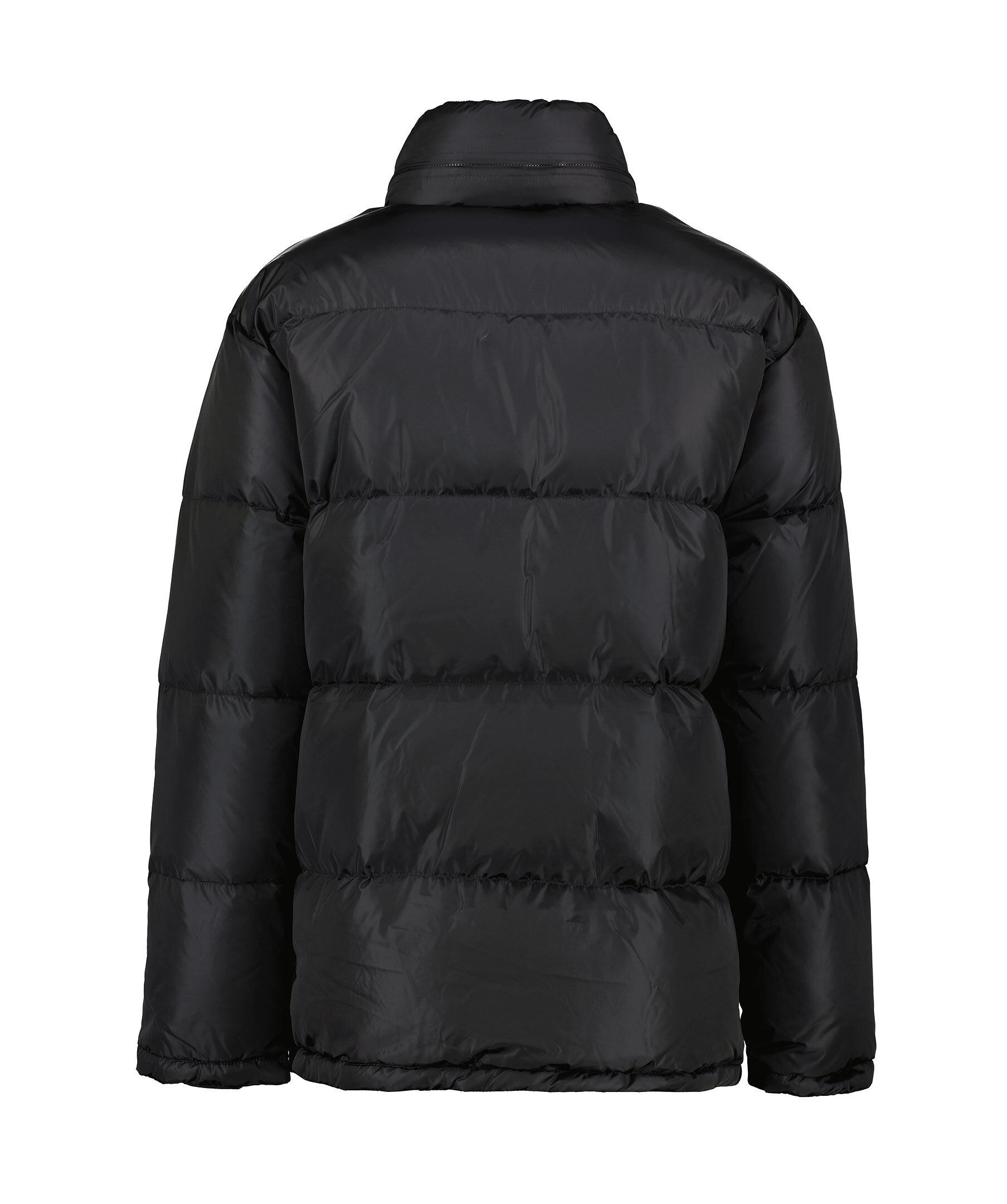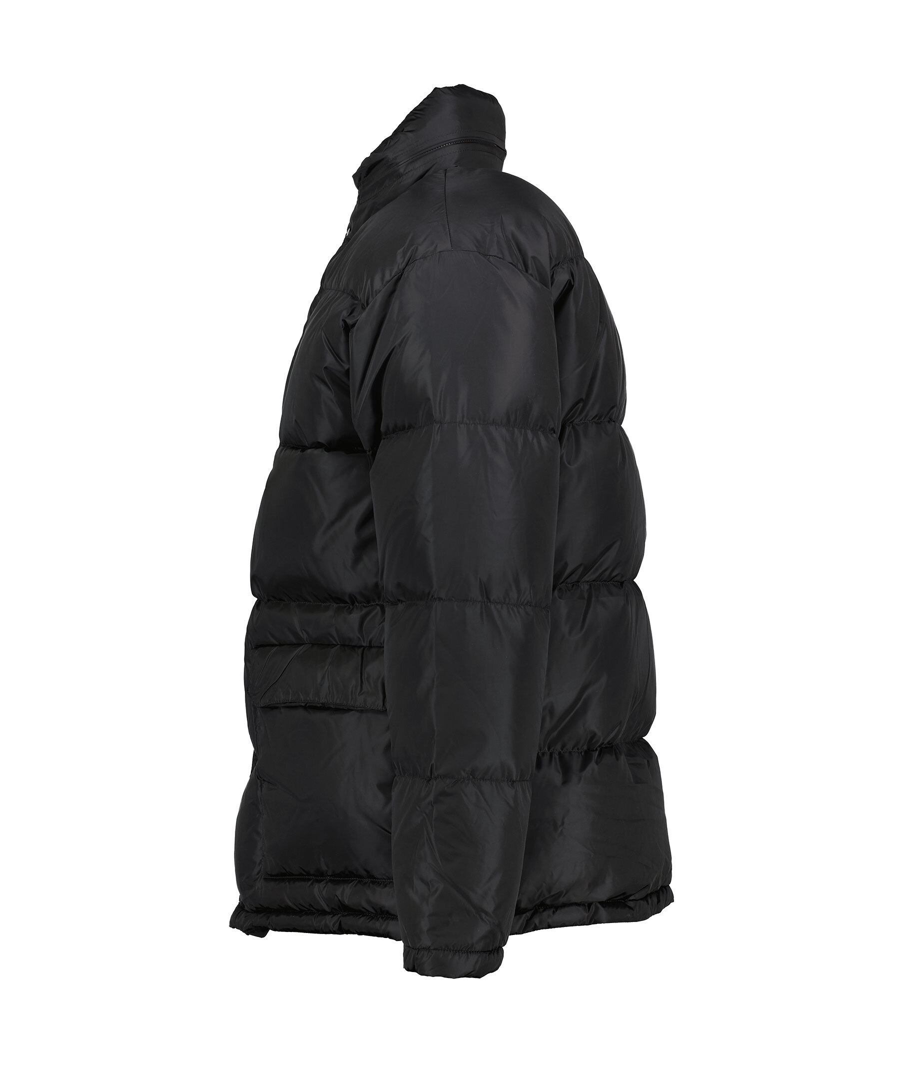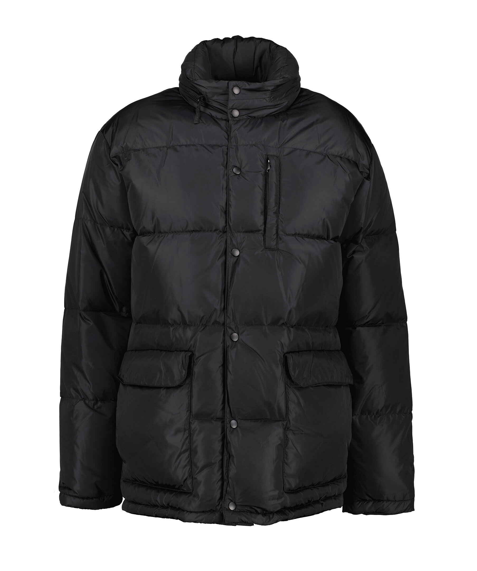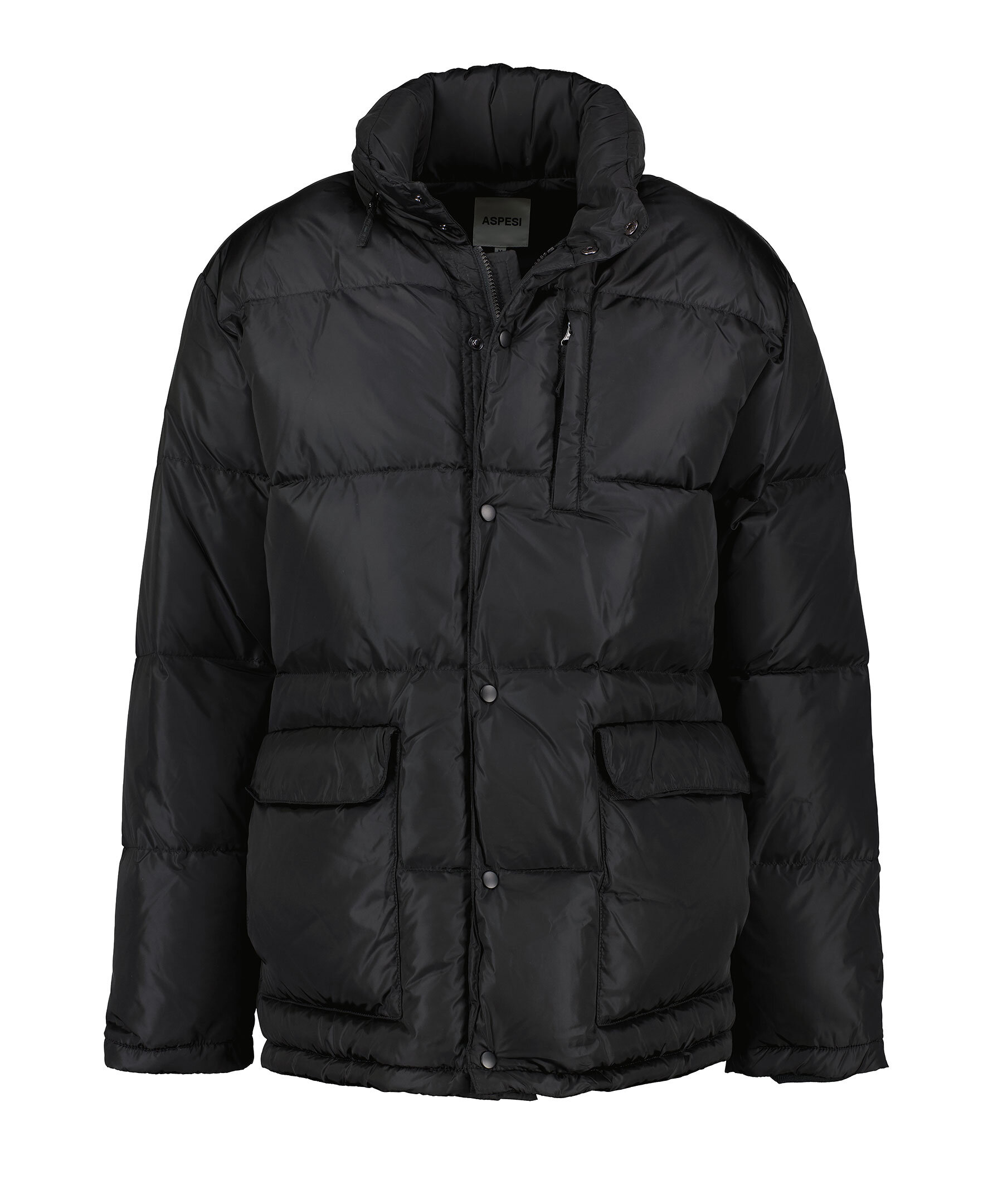 Svart pufferjacka från Aspesi. Jackan stängs med dold tvåvägsdragkedja och tryckknappar och har dold huva som enkelt stoppas in i kragen. Två sidfickor med lock och kardeborrestängning samt en bröstficka med dragkedja. Tillverkad i polyamid.