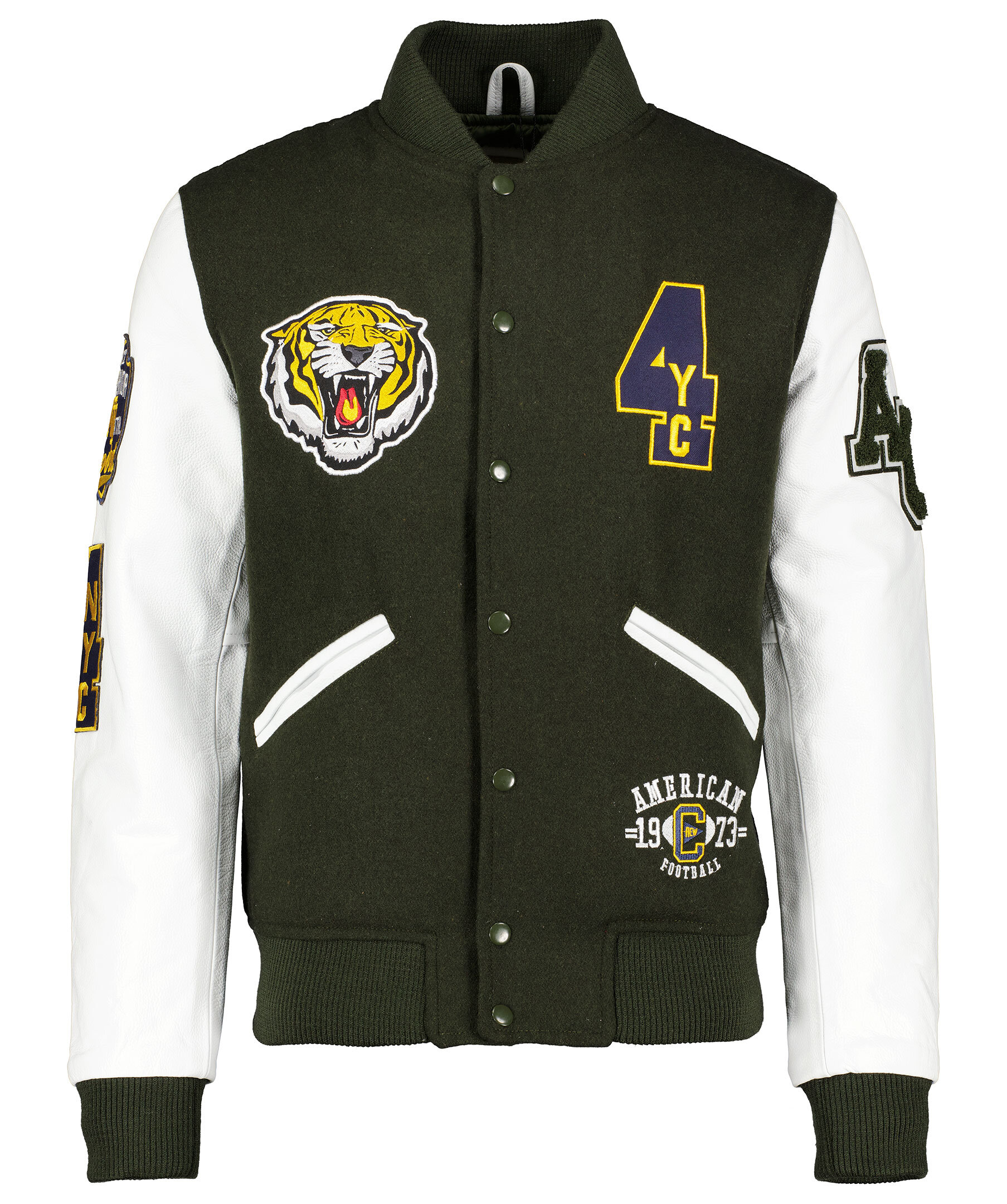 Mörkgrön, vit varsity jacka från American College. Broderad patches på jackans framsida och stort broderi på ryggen. Stängs framtill med dragkedja och tryckknappar. Jackans framsida och baksida är tillverkade i ull, ärmar i läder. Patch med textil logotyp. Två snedställda fickor framtill i läder. Elastiska muddar vid kragen, ärm- och plaggslut. Jackan är i unisex modell.