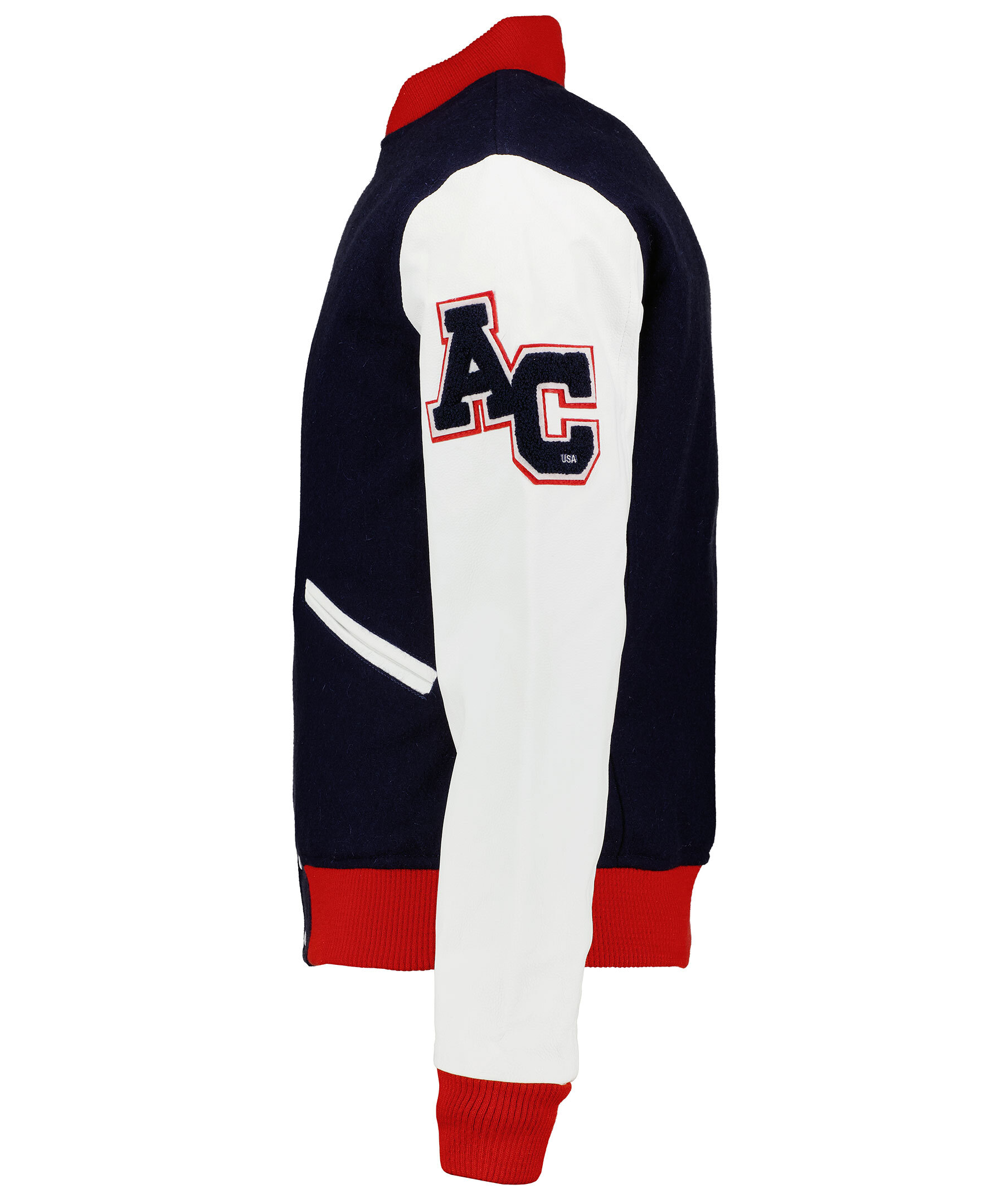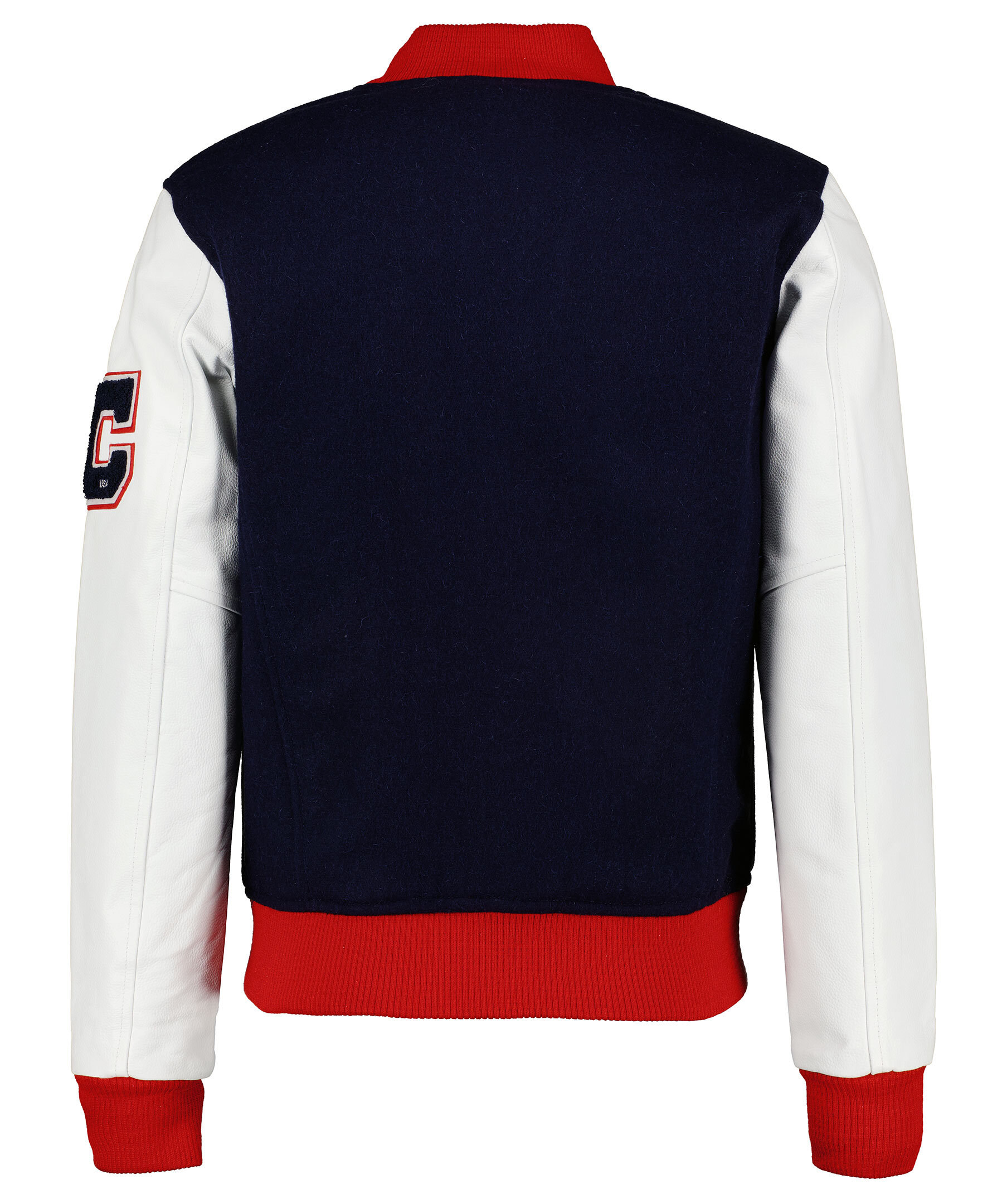 Mörkblå, vit och röd varsity jacka från American College. Stängs framtill med dragkedja och tryckknappar. Jackans framsida och baksida är tillverkade i ull, ärmar i läder. Patch med textil logotyp. Två snedställda fickor framtill i läder. Elastiska muddar vid kragen, ärm- och plaggslut. Jackan är i unisex modell.