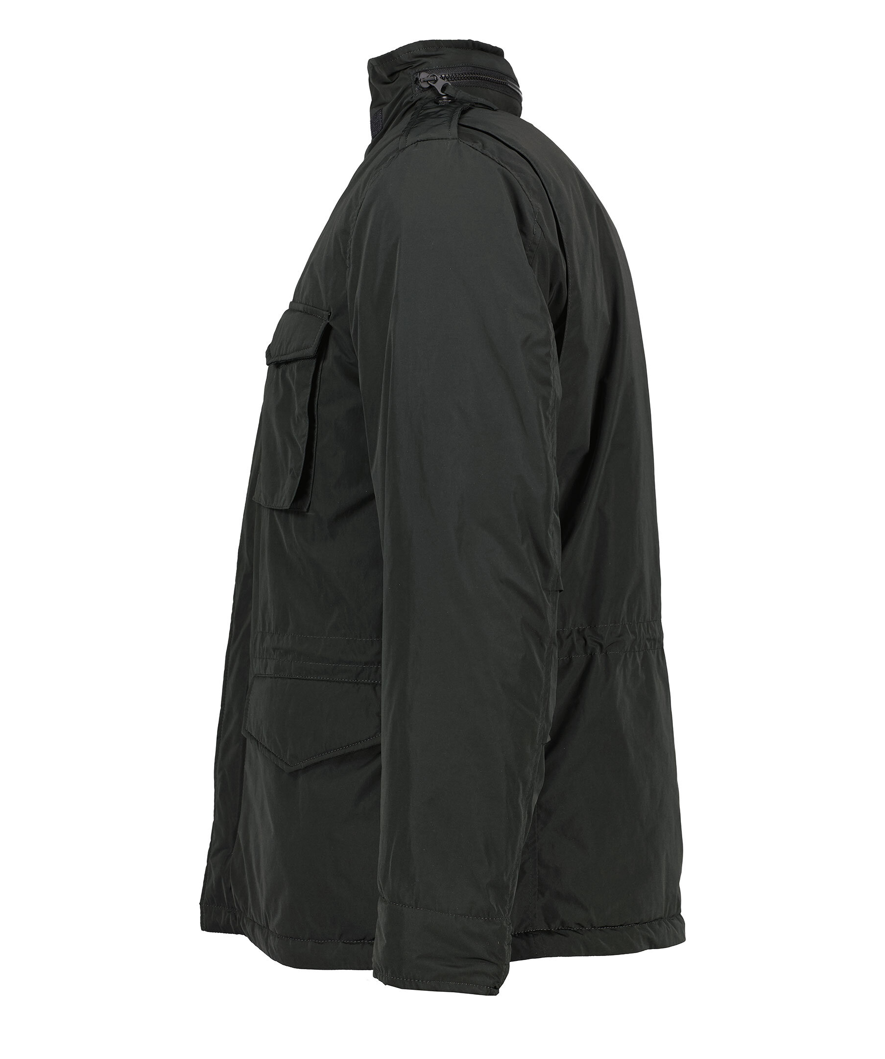 Svart jacka från Aspesi. Jackan är gjord i ett vattenavvisande yttertyg och fodrad med dunliknade nylon för extra värme. Dold luva i kragen. Två bröstfickor och två framfickor med ficklock. Stängs med dragkedja och tryckknappar. Dragsko i midjan på insidan av jackan. Perfekt till den kalla hösten eller en svalare vinter.