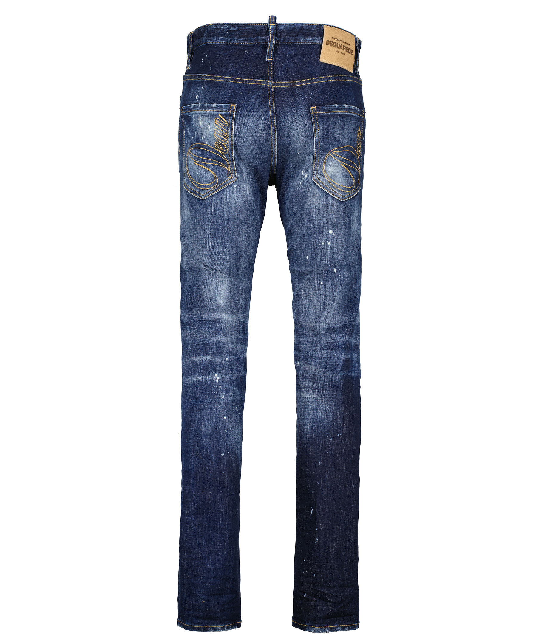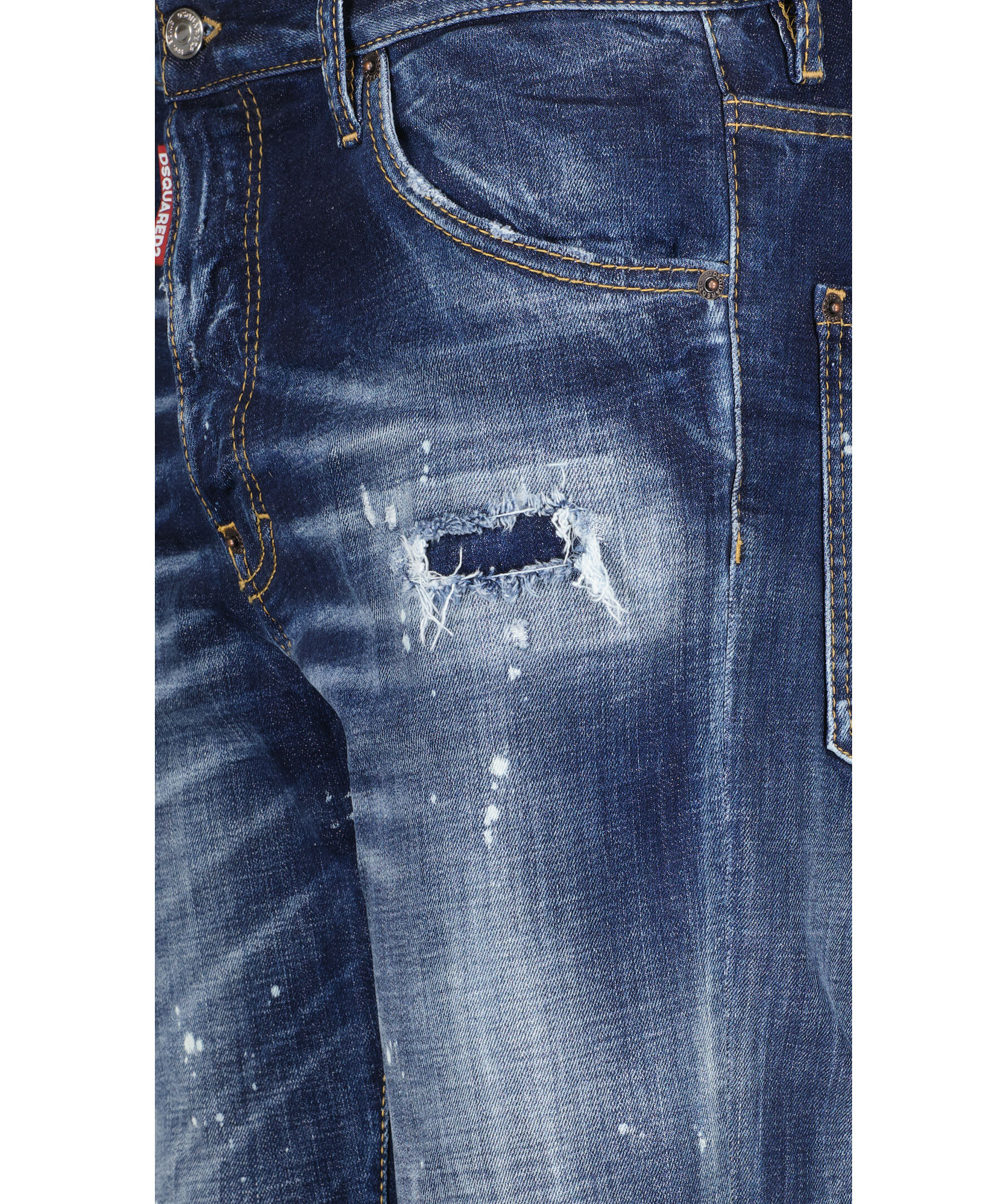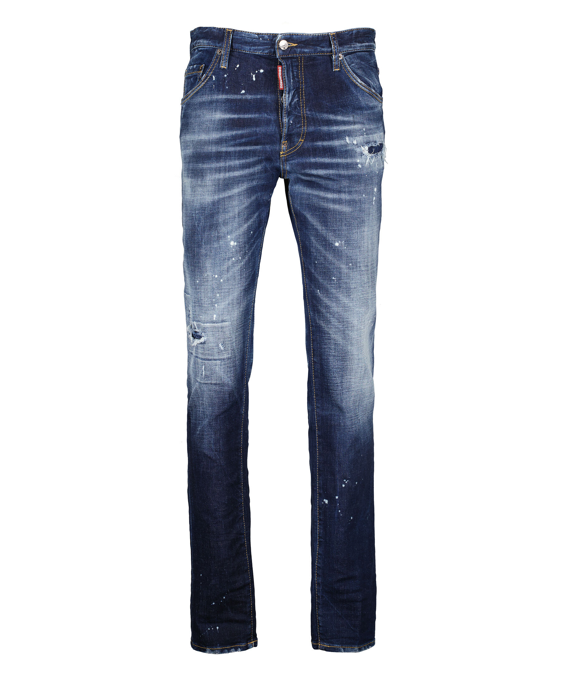 Blå jeans i slim fit modell från Dsquared2. Fem fickor, hällor för bälte i midjan. Medvetet blekta och slitna partier över hela byxan. Broderad logotyp på bakfickorna. Patch i läder med embossad logotyp. Dolda knappar i gylfen och är tillverkade i bomull med stretch.