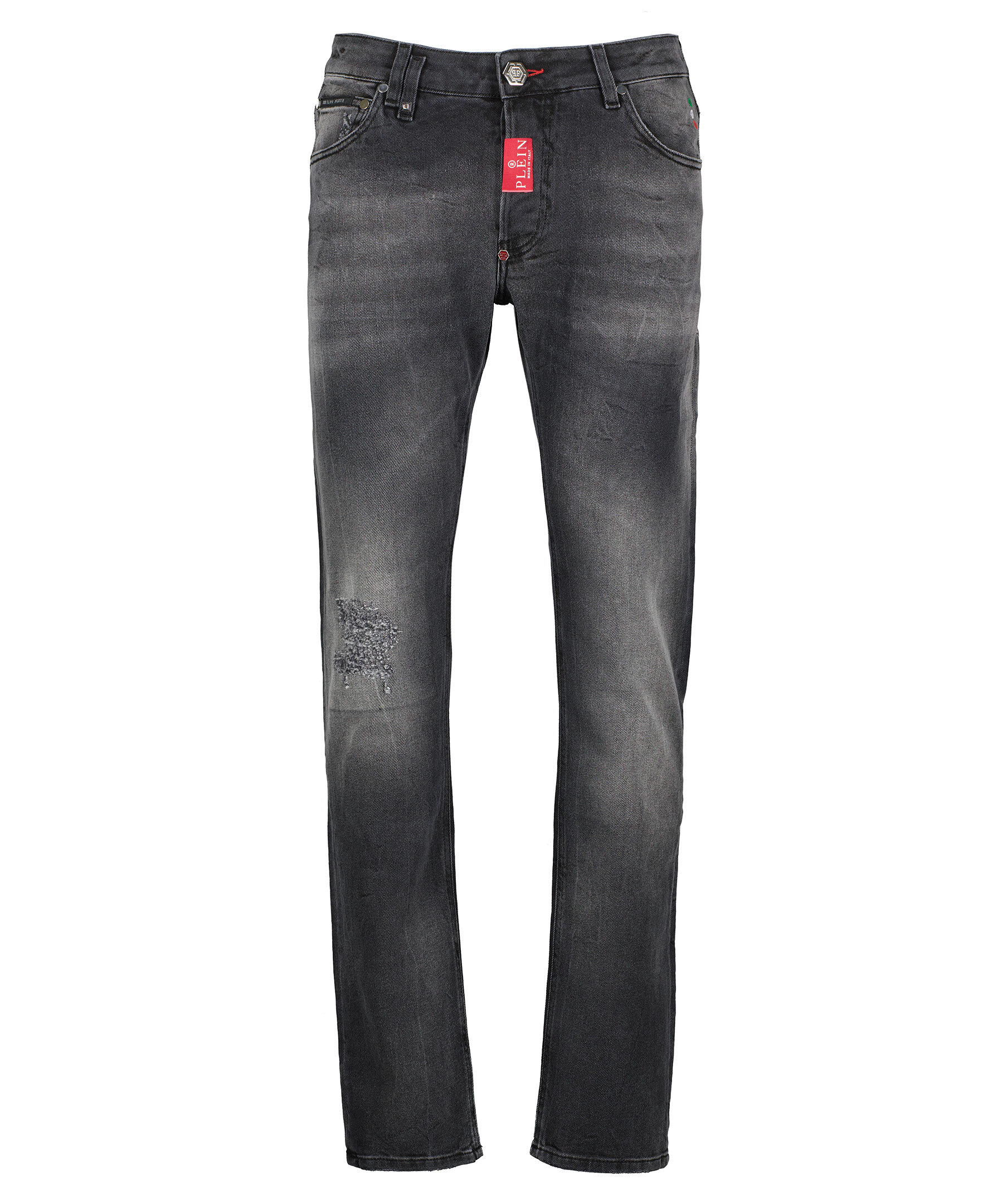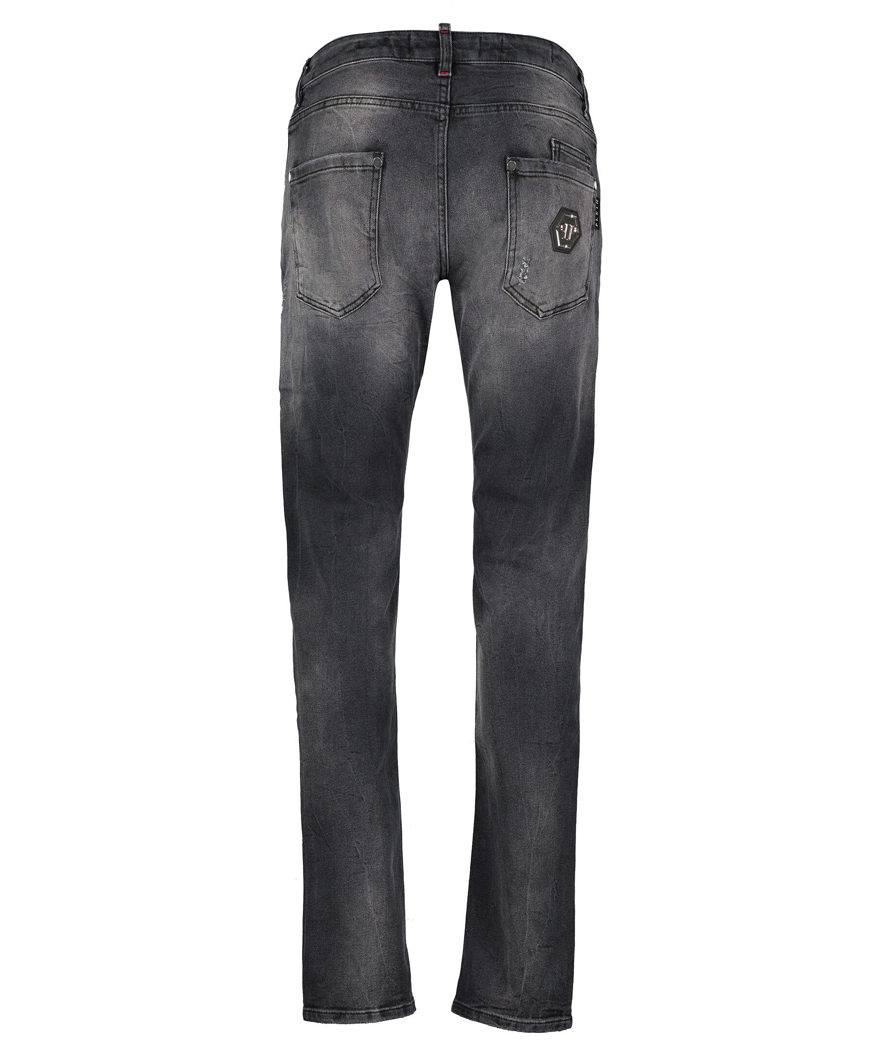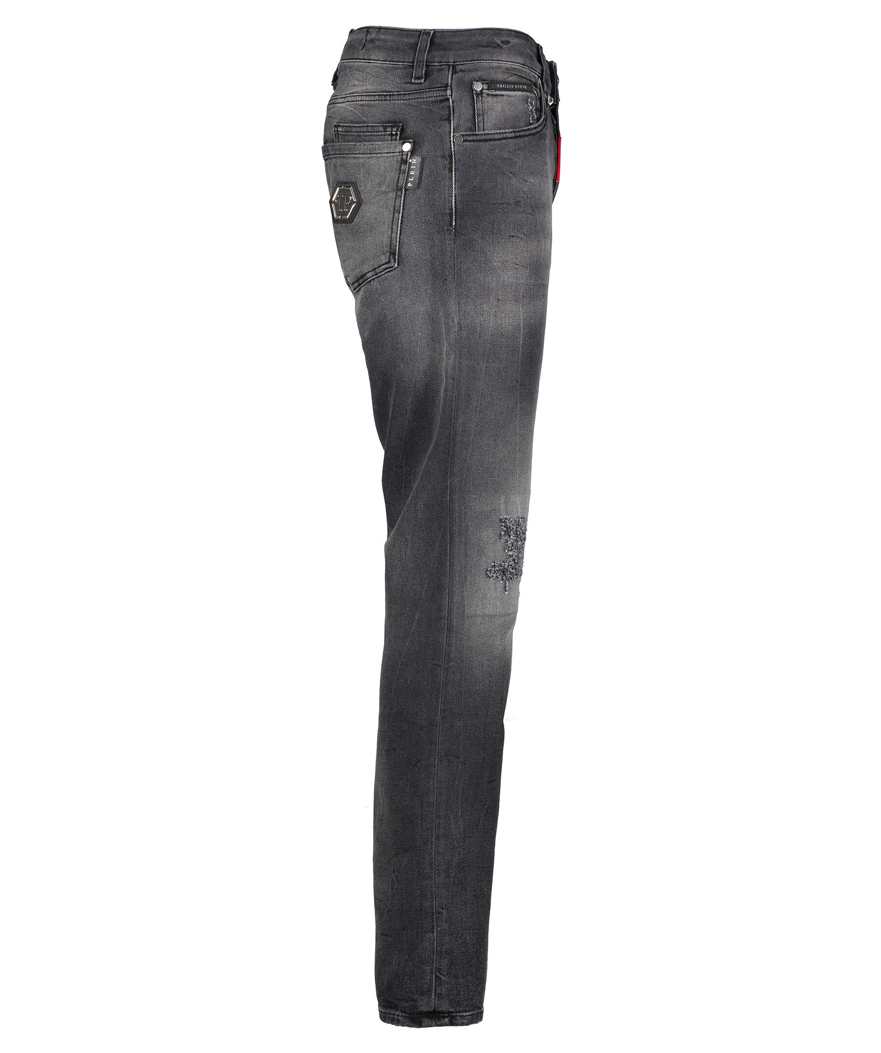Mörkgrå, tvättade jeans i smal och rak modell från Philipp Plein. Slitna detaljer, stor patch med logotyp i silverfärgad metall på den ena bakfickan och har 6 fickor och hällor i midjan. Dold knappgylf och en synlig knapp längst upp med emblem. Liten logotyp på den lilla fickan fram och en röd patch med logotyp på gylfen. Tillverkade i bomull med stretch.