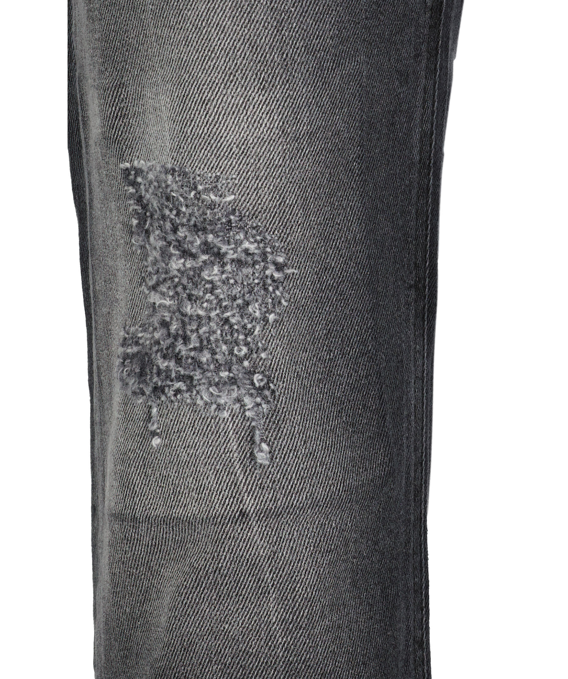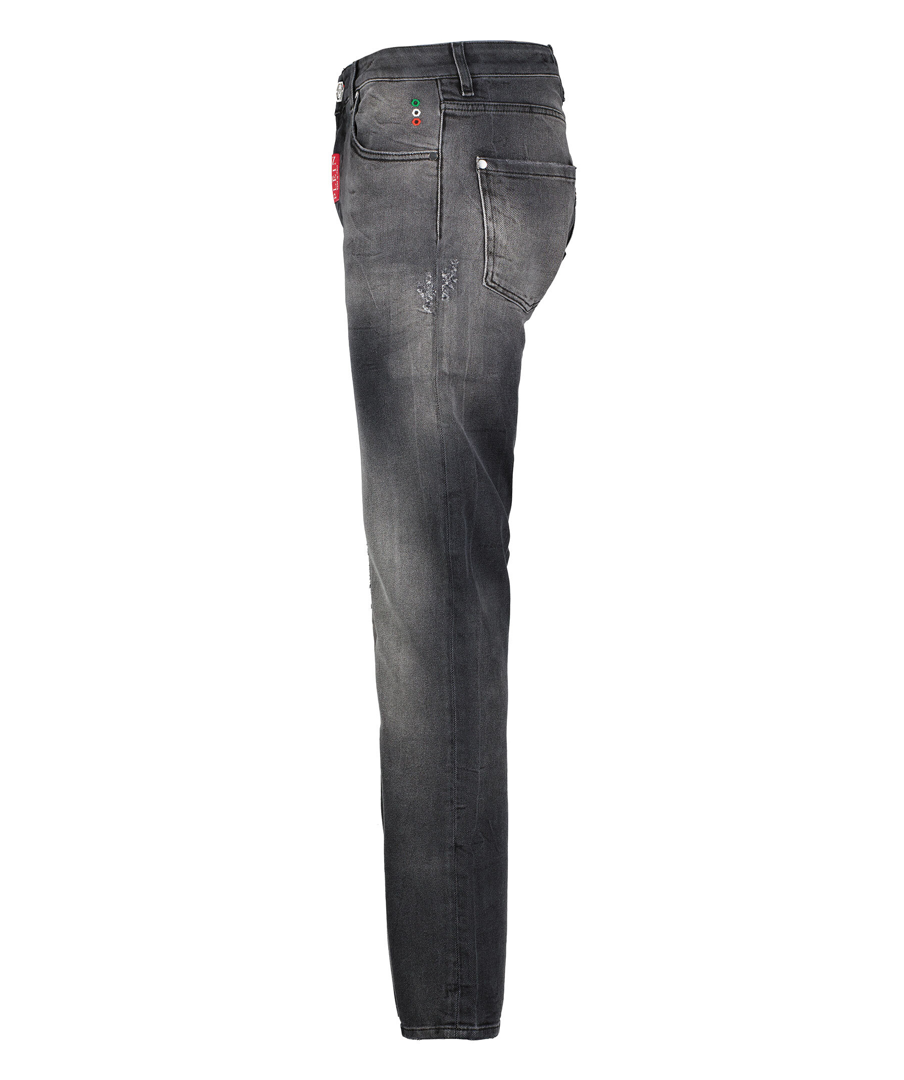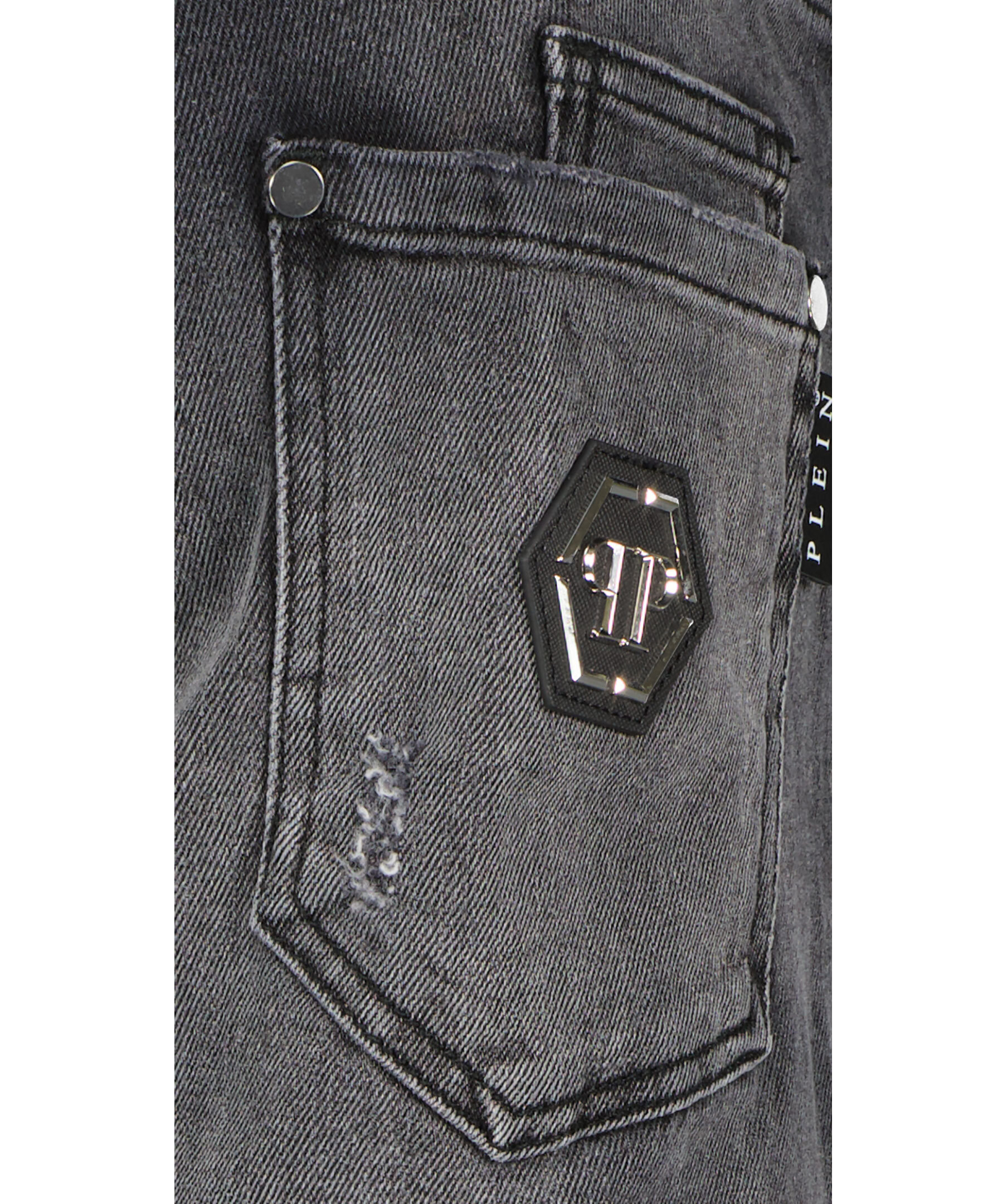 Mörkgrå, tvättade jeans i smal och rak modell från Philipp Plein. Slitna detaljer, stor patch med logotyp i silverfärgad metall på den ena bakfickan och har 6 fickor och hällor i midjan. Dold knappgylf och en synlig knapp längst upp med emblem. Liten logotyp på den lilla fickan fram och en röd patch med logotyp på gylfen. Tillverkade i bomull med stretch.