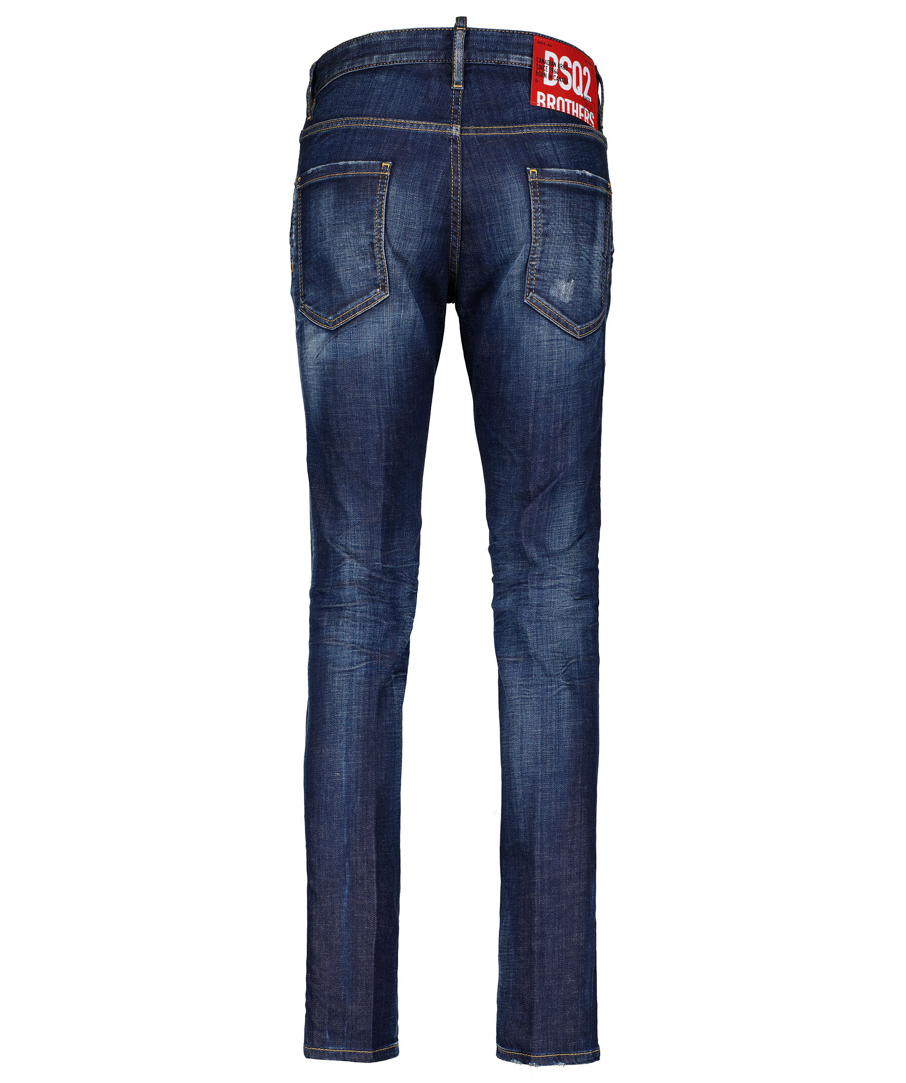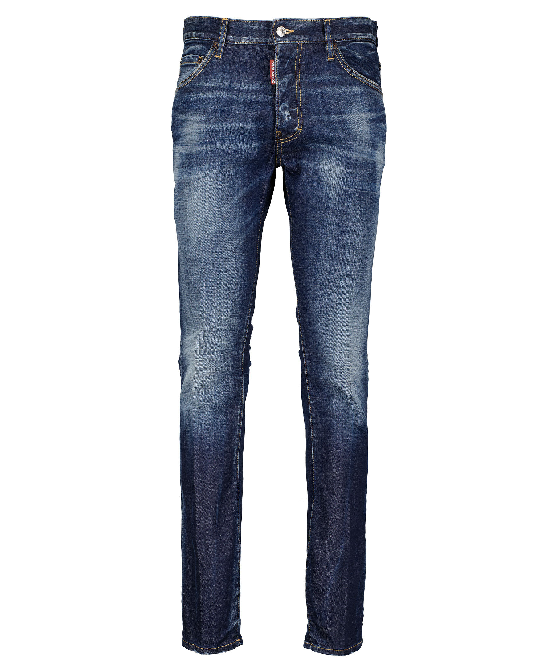 Blå jeans från Dsquared2. Fem fickor, hällor för bälte i midjan. Medvetet slitna och har färgstänk över hela byxan. Stor patch över bakfickan, knappar i gylfen. Tillverkade i bomull med stretch.