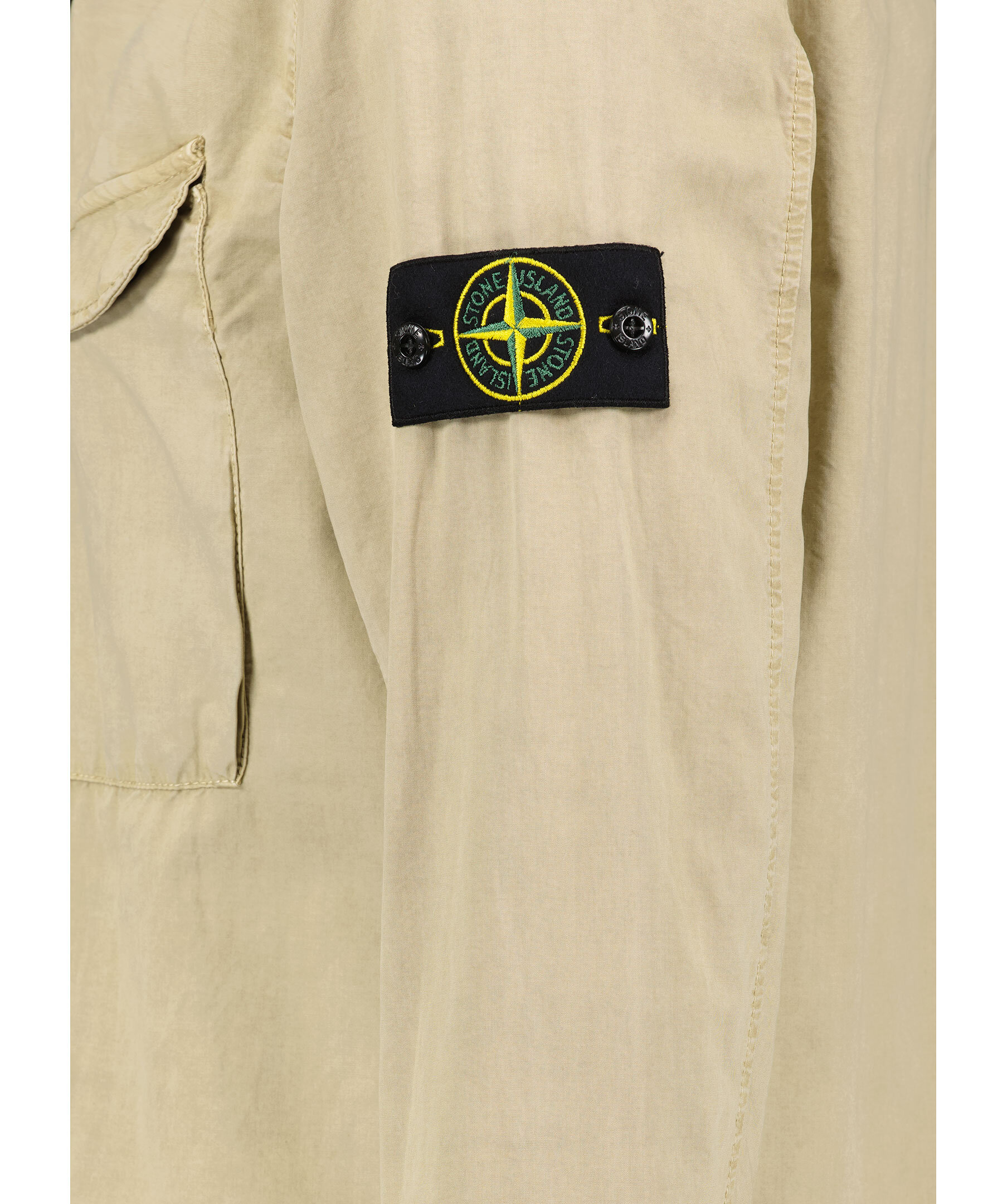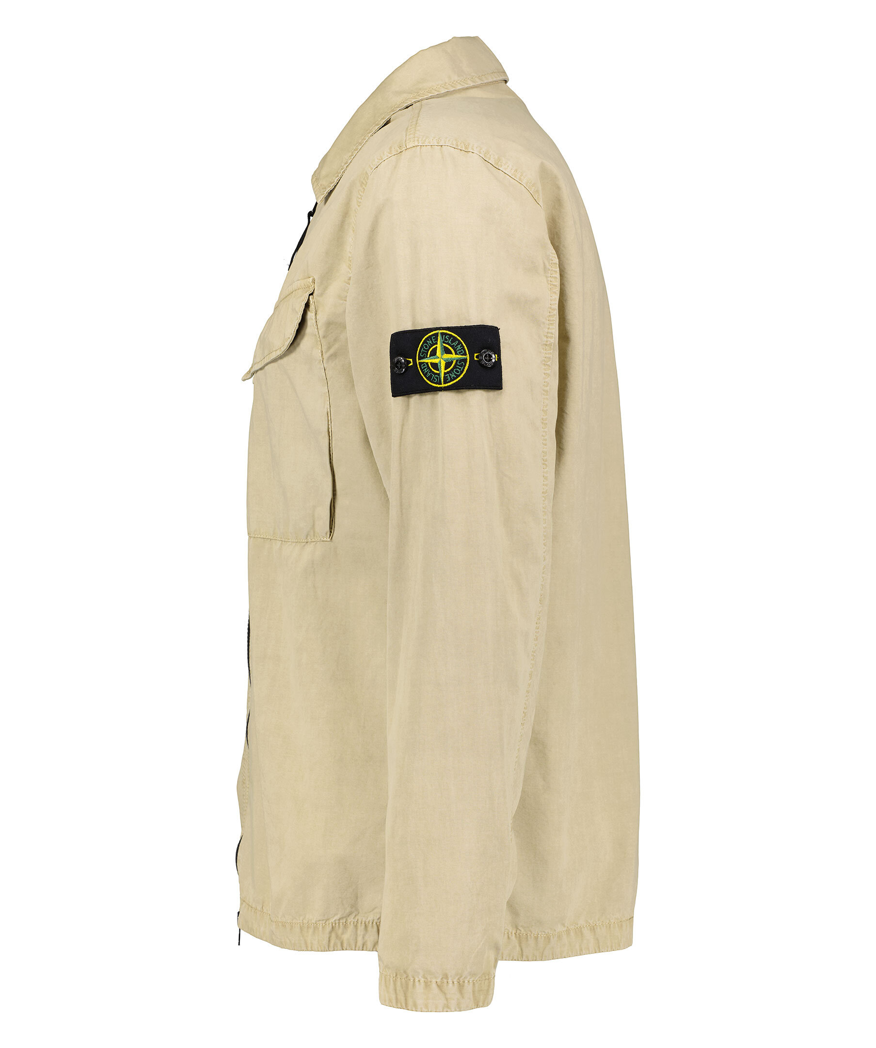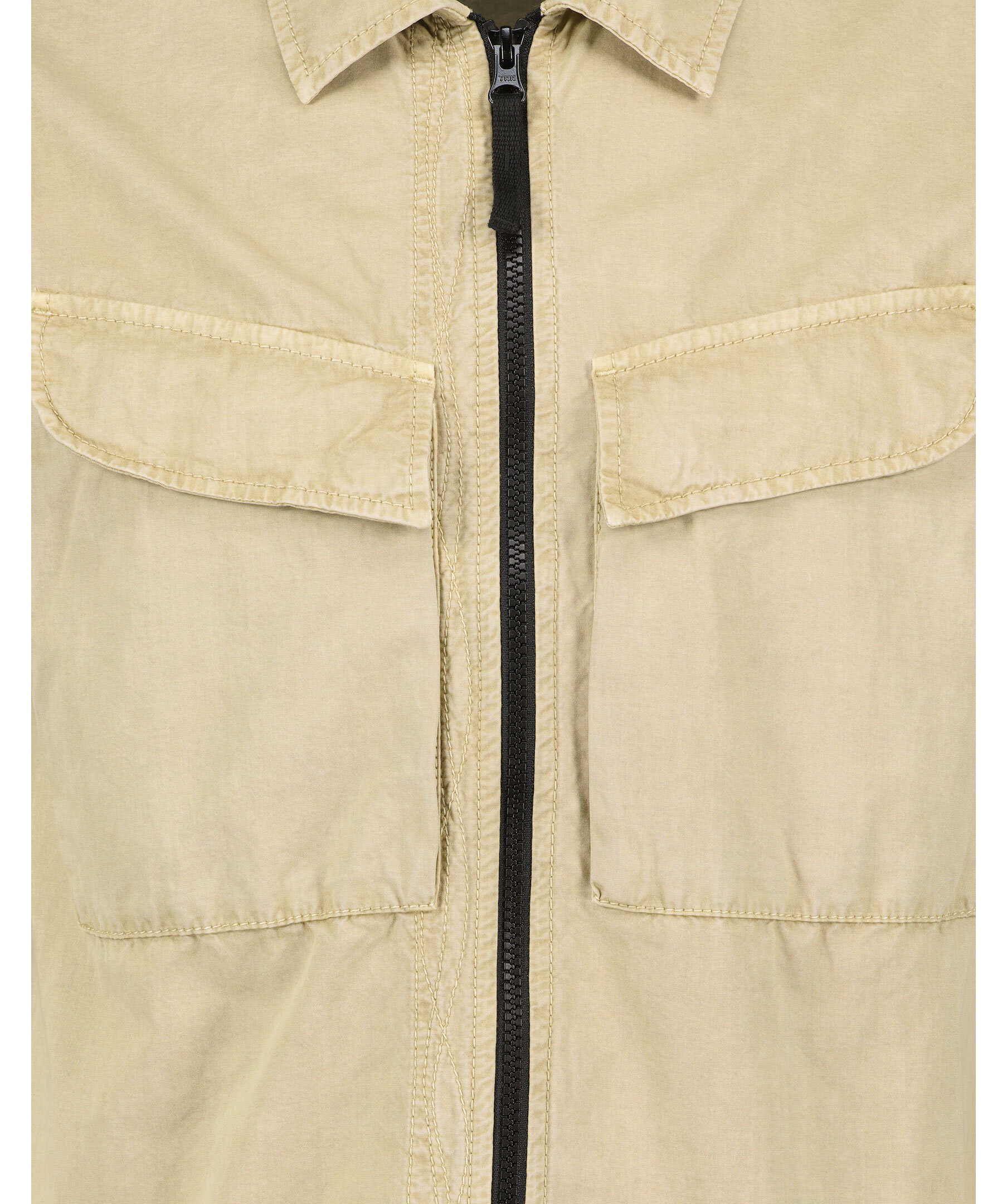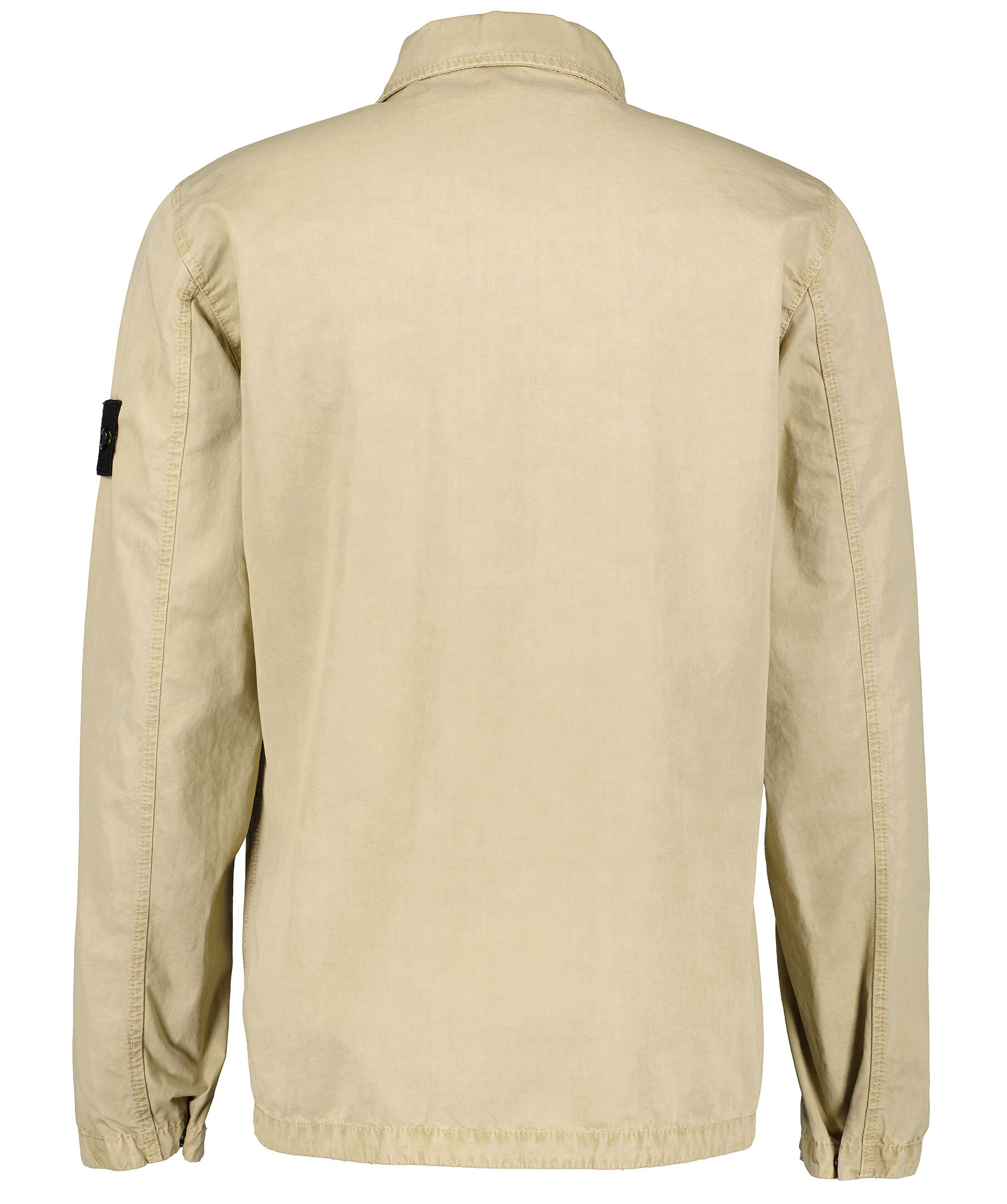 Beige overshirt med spetsig krage från Stone Island. Två bröstfickor med lock som stängs med två tryckknappar. Stängs framtill med svart tvåvägsdragkedja. Avtagbar patch med logotyp på vänster ärm. Tryckknapp i ärmslut som justerar storleken på ärmslutet.