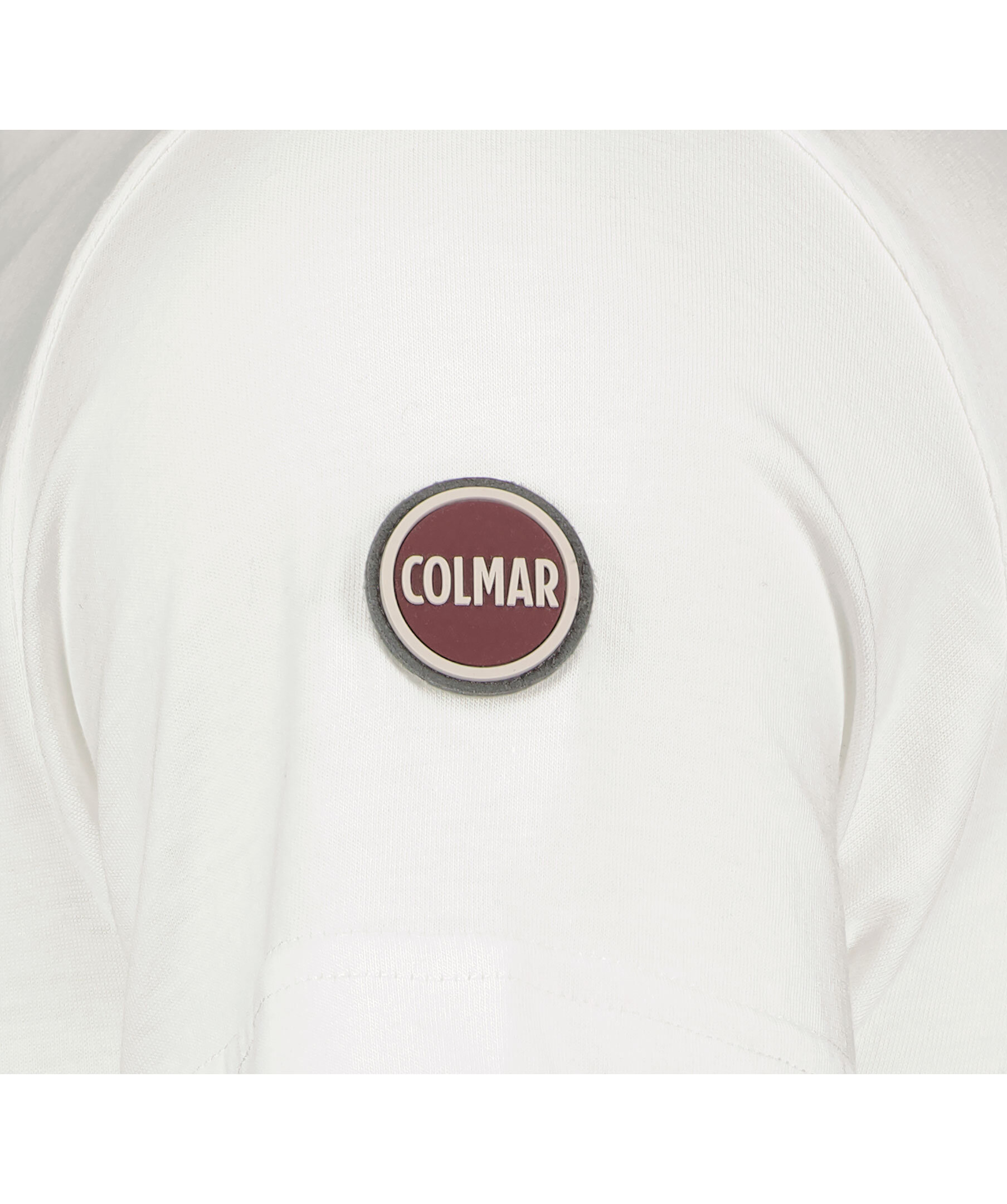 Vit t-shirt från Colmar i slim fit modell. Gummerad logotyp på vänster ärm och rundad halsringning. Tillverkad i bomullsblandning.