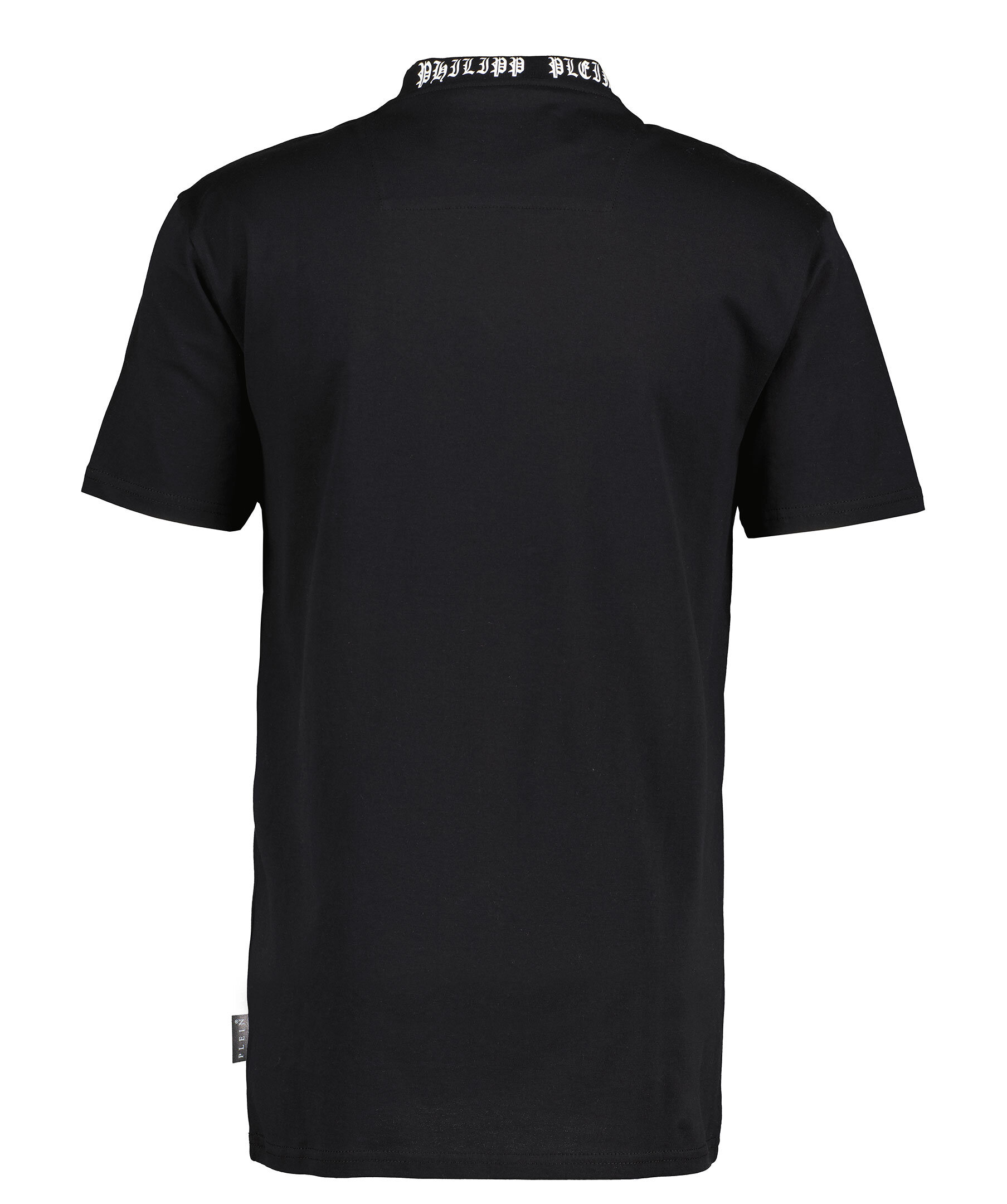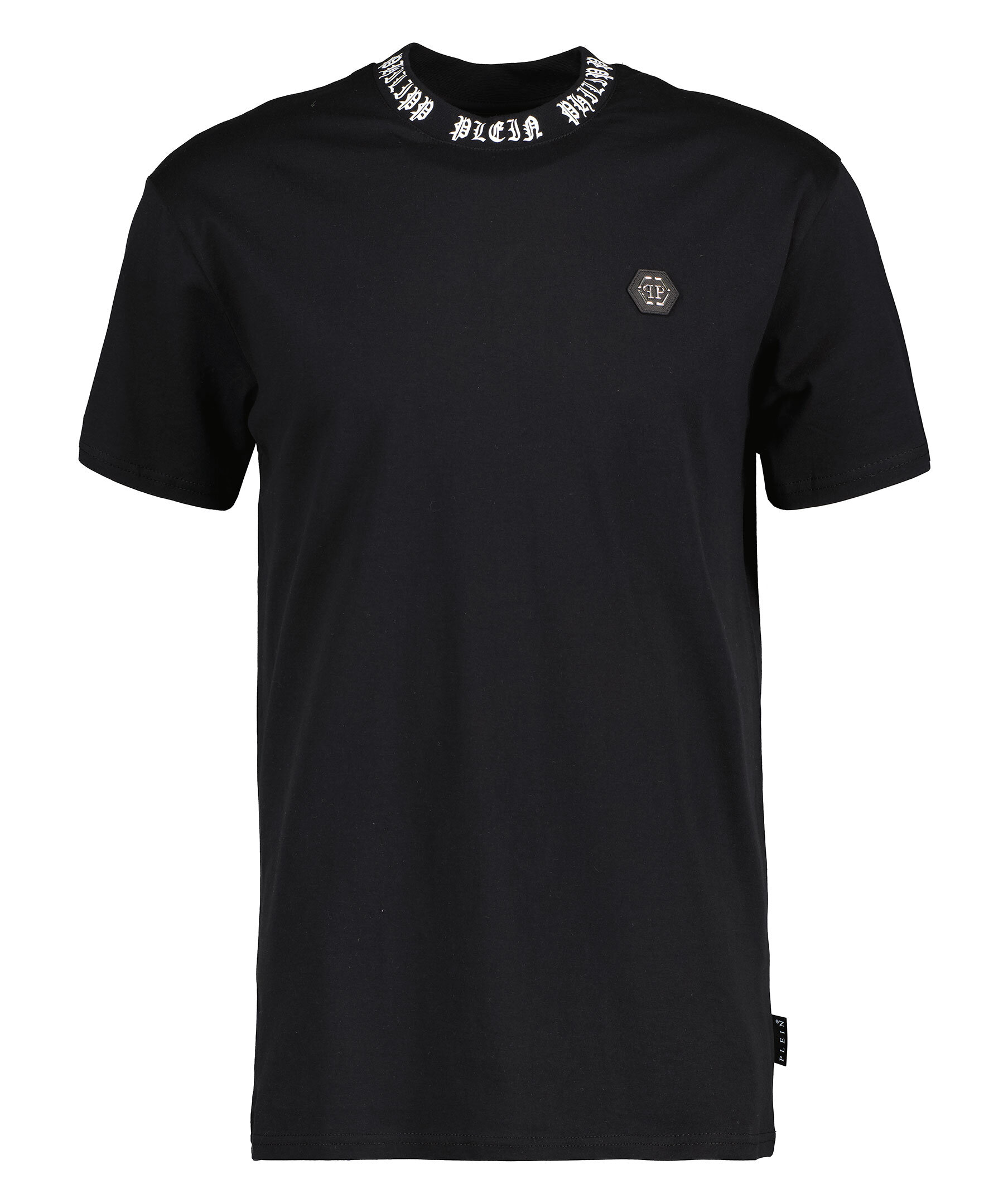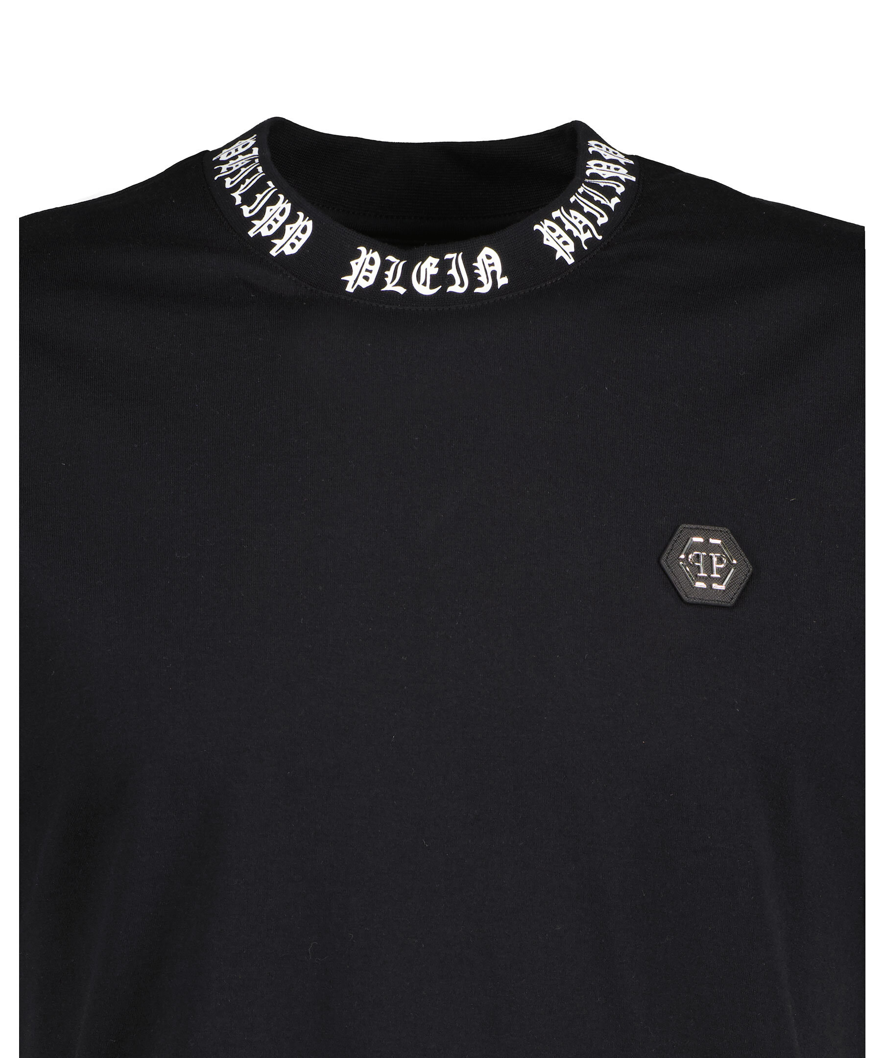 Svart t-shirt från Philipp Plein. Tillverkad i 100% bomull. Ribbstickad halsringning med vitt märkesövertryck. PP Hexagon på en saffian läderlapp sys på vänster bröst.