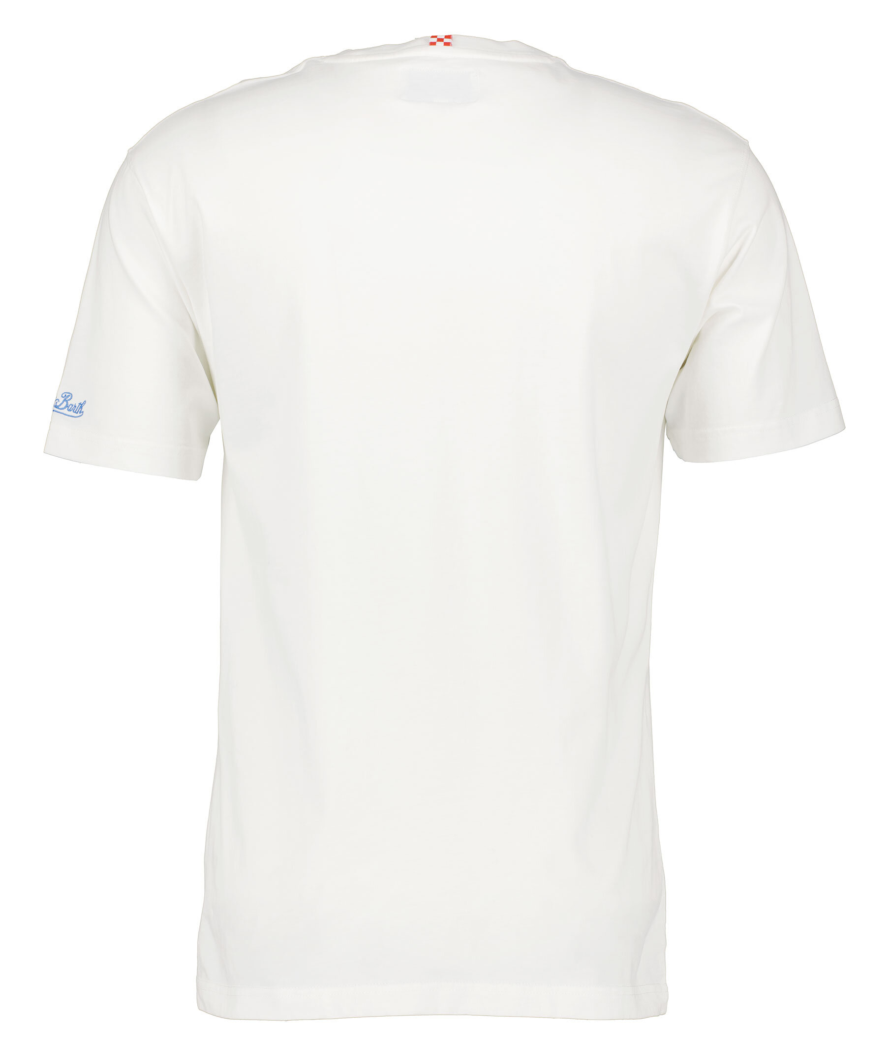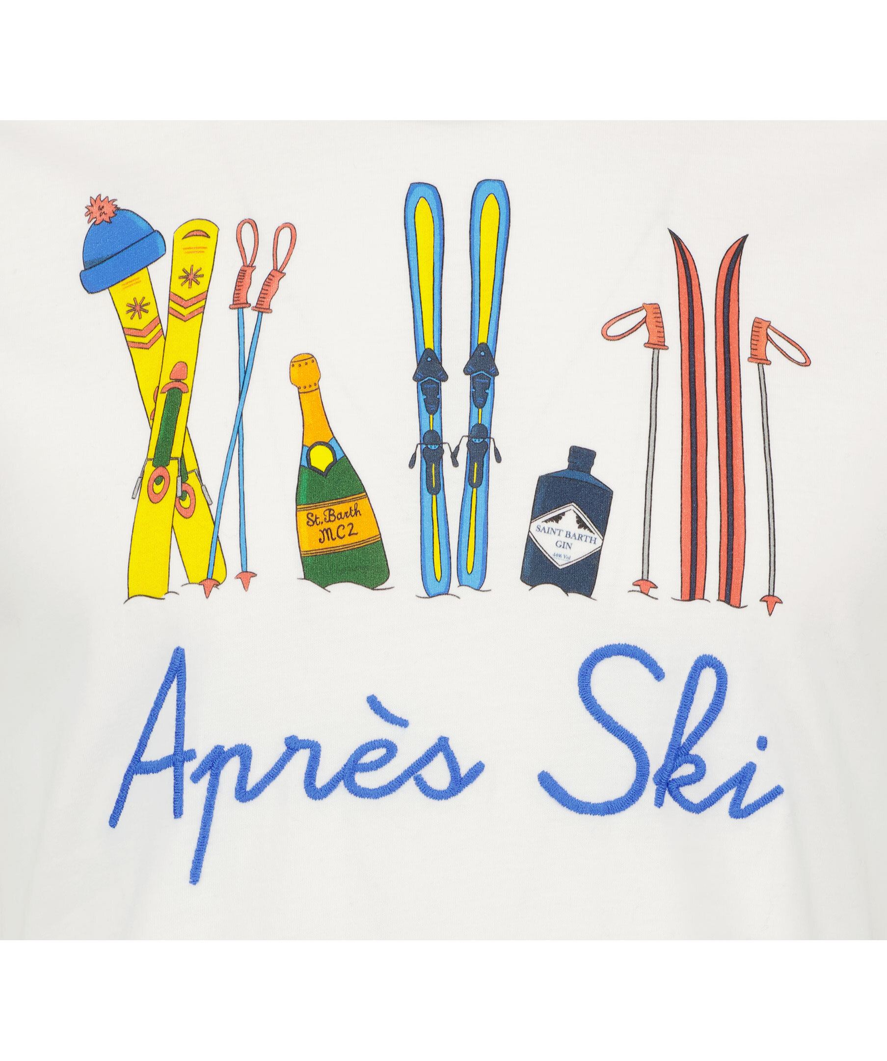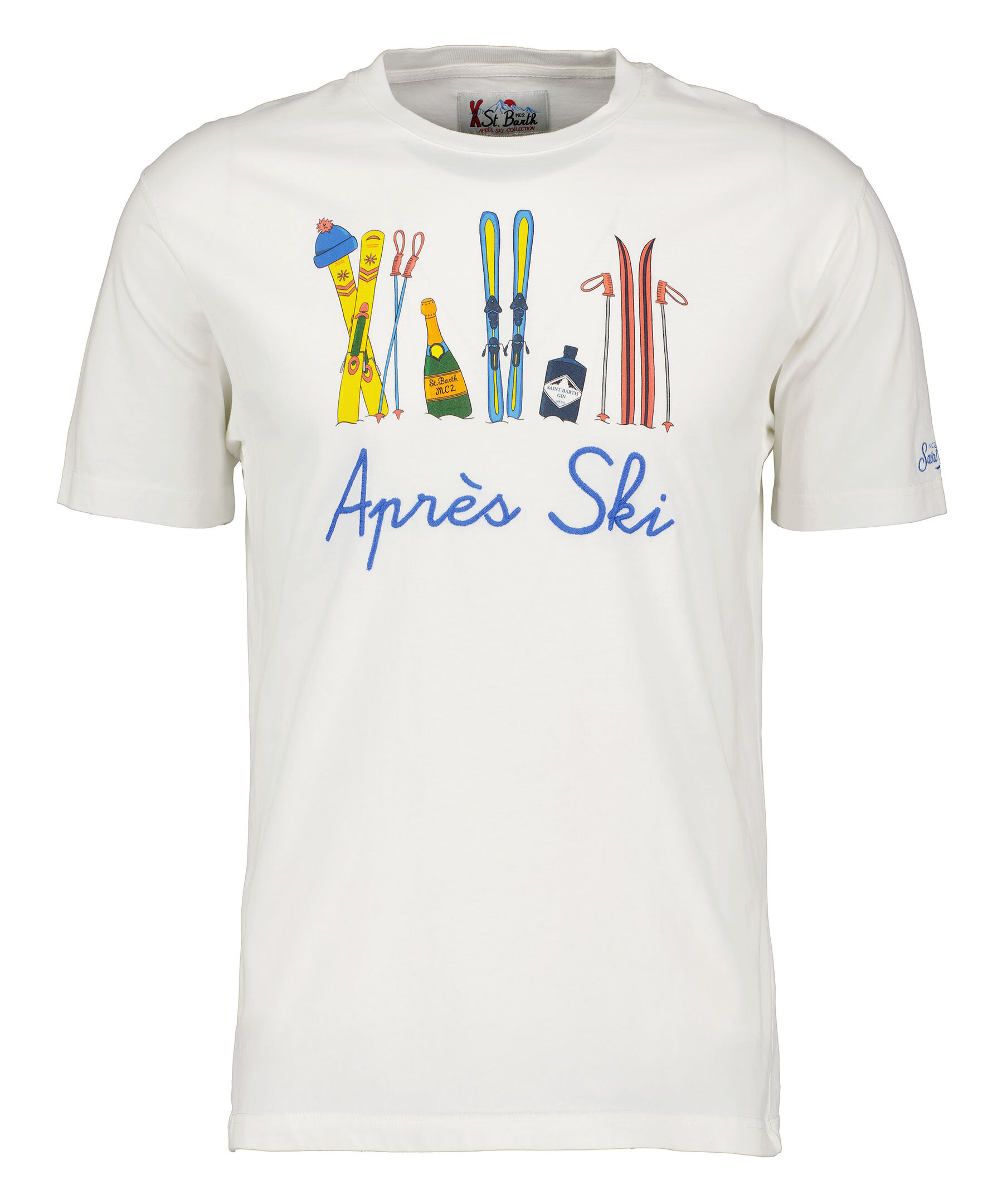 Benvit t-shirt från Mc2 Saint Barth. Broderade "Aprés Ski" bokstäver i blått och tryck med skidor på framsidan. St. Barth broderi på ärmen, rund halsringning. Smal passform. Tillverkad i 100% bomull.