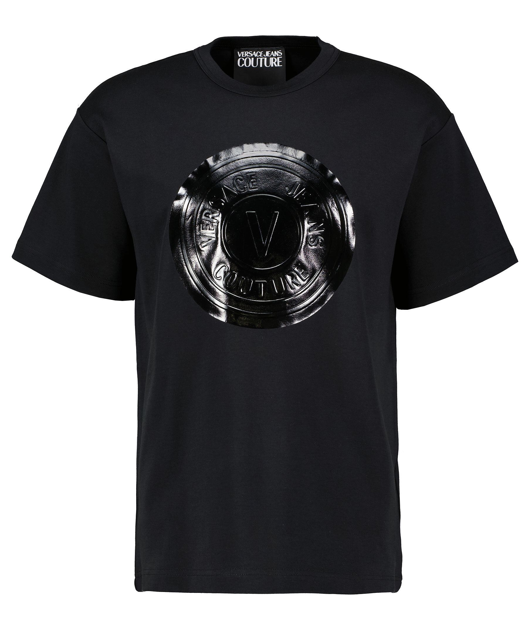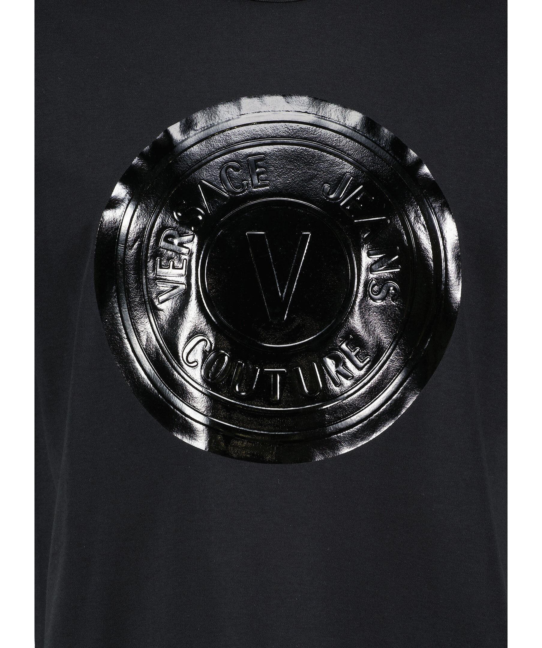 Svart T-shirt från Versace Jeans Couture. Svart glansigt präglat tryck på bröstet. Rundad halsringning. Tillverkad i 100% Bomull.