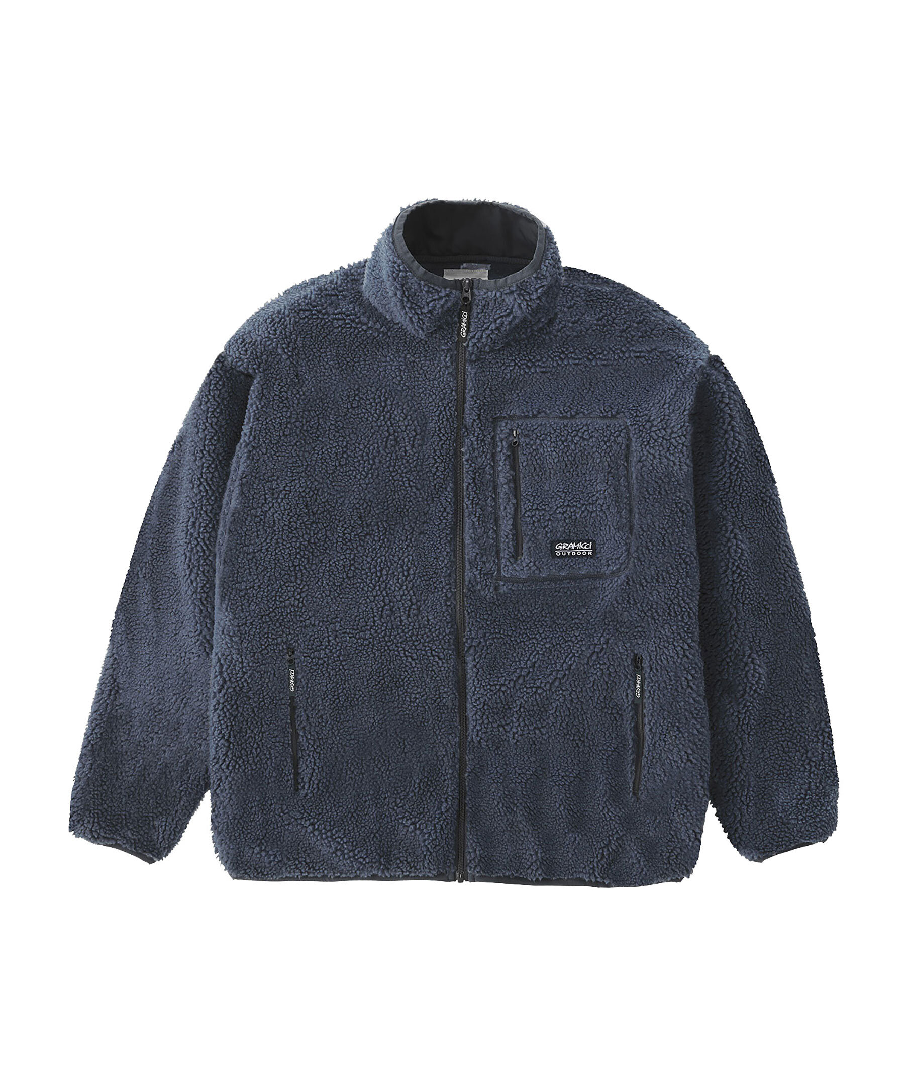 Mörkgrå fleecetröja från Gramicci. Stängs framtill med dragkedja. Två fickor framtill, en bröstficka som stängs med dragkedja. Patch med logotyp på vänster bröst. Smal elastisk resår vid ärm- och plaggslut.