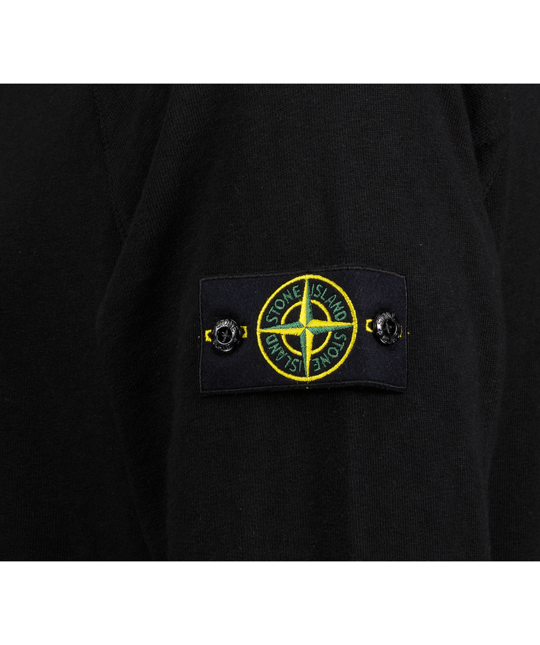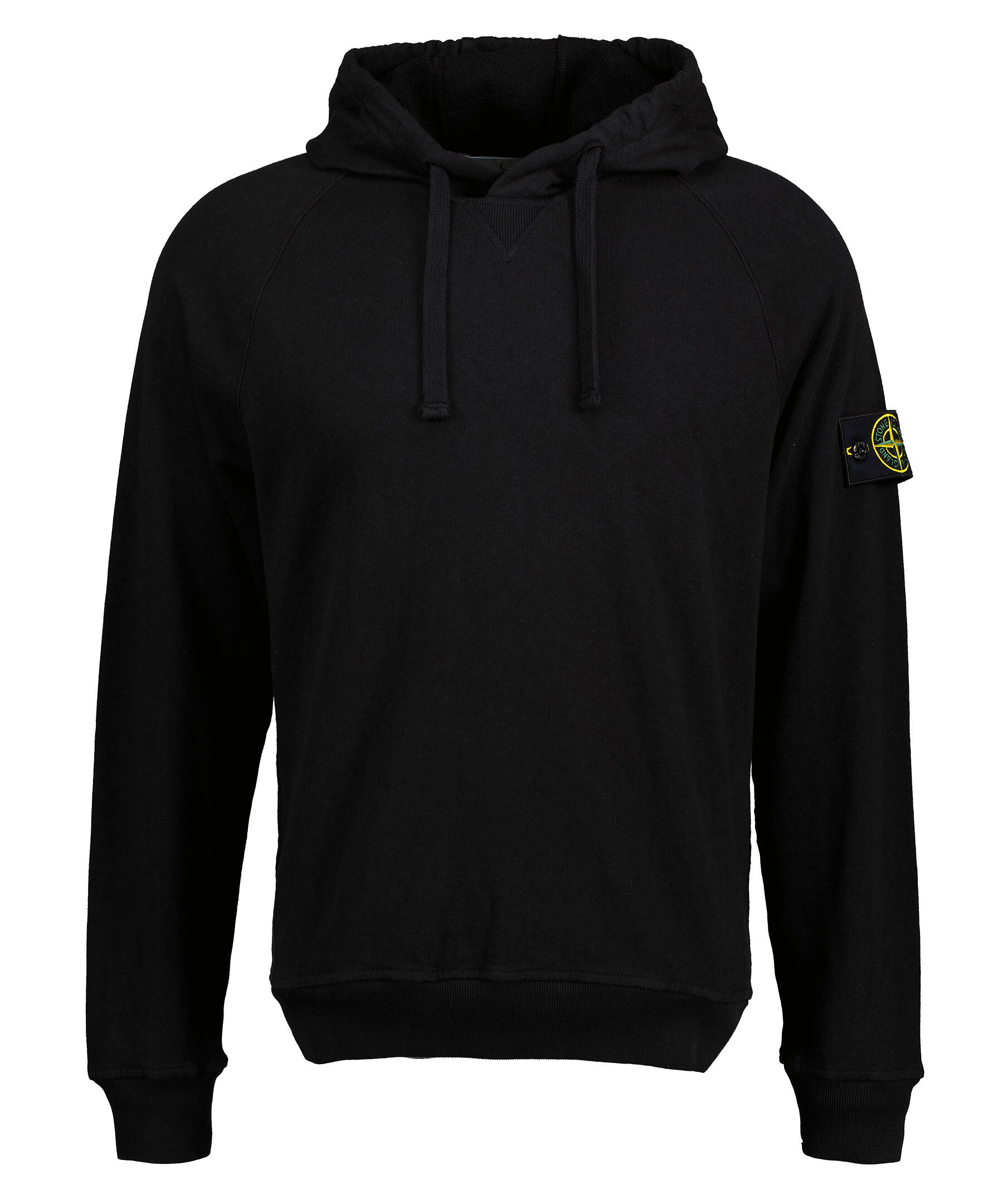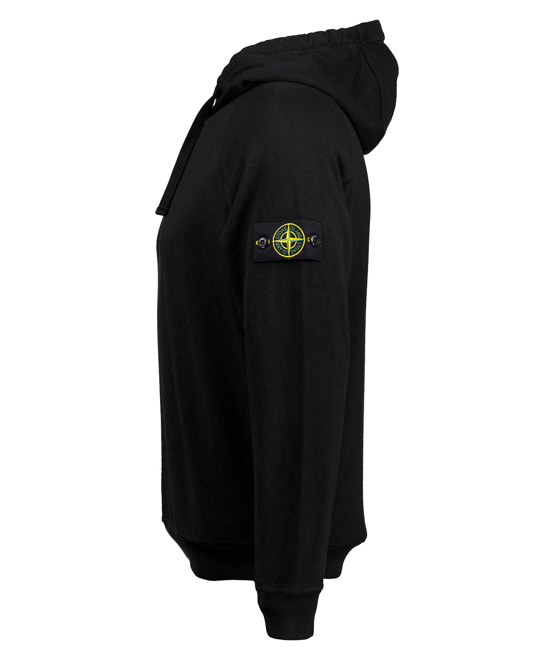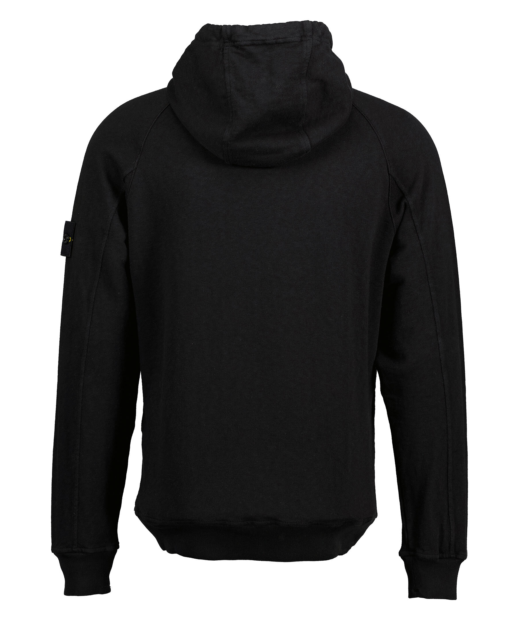 Svart hoodie från Stone Island. Tröjan är behandlad med en färgbehandling som gör att plagget kan upplevas som lite sliten i utseendet. Avtagbar tygpatch med logotyp på vänster överärm. Dragsko i luva. Gjord i 100% bomull.