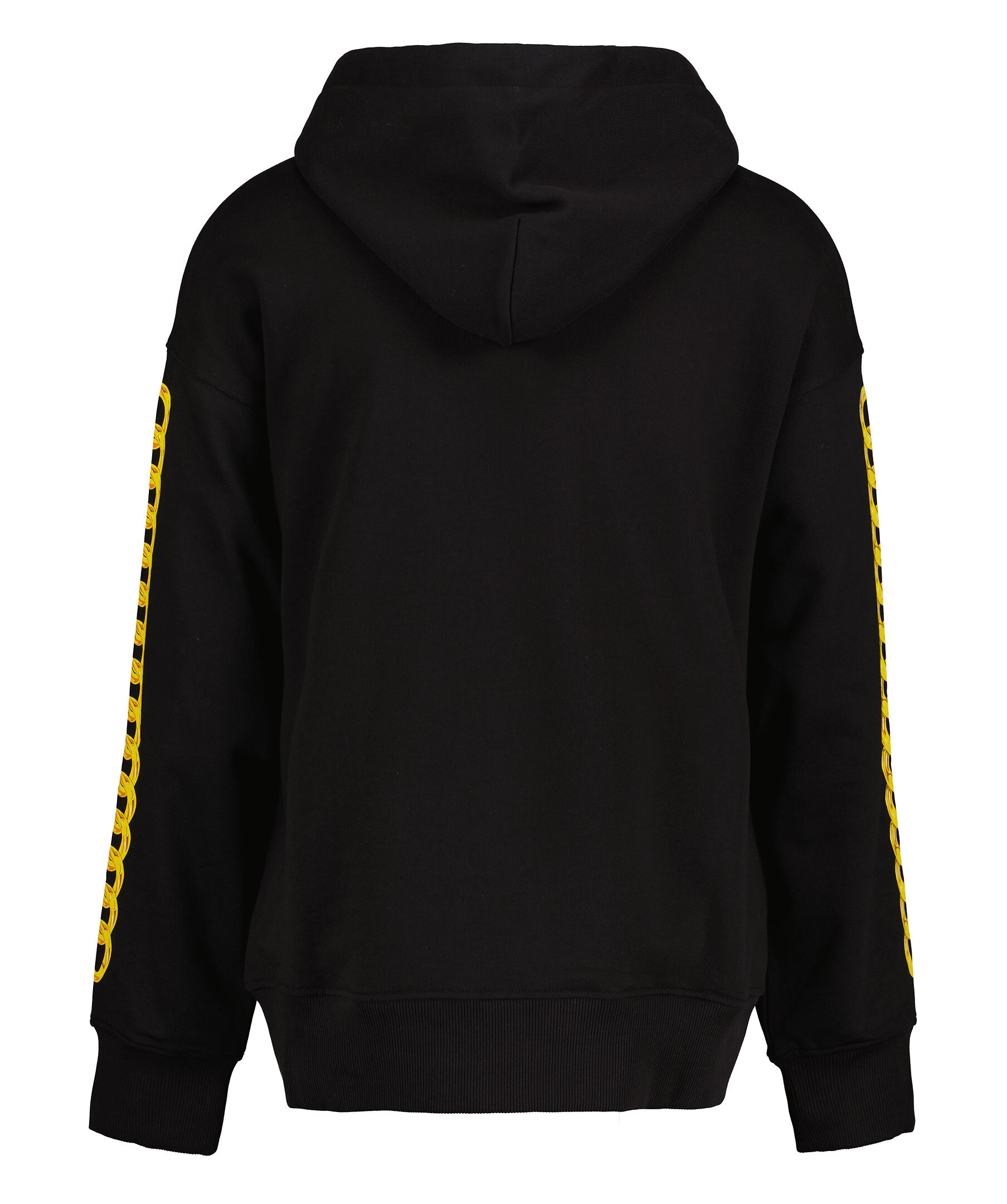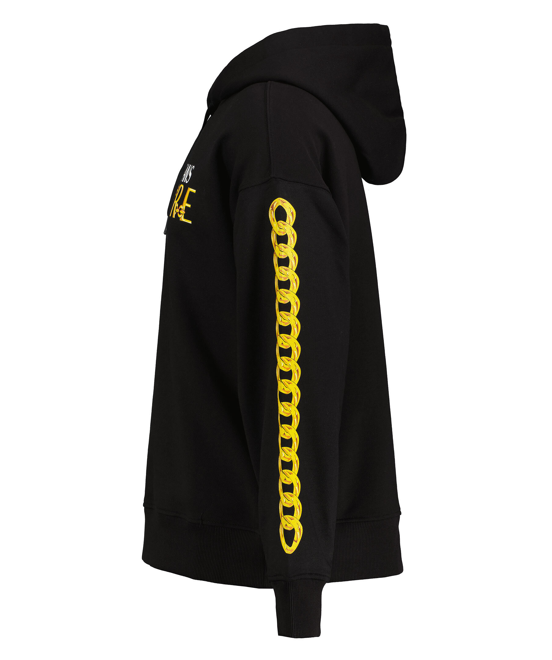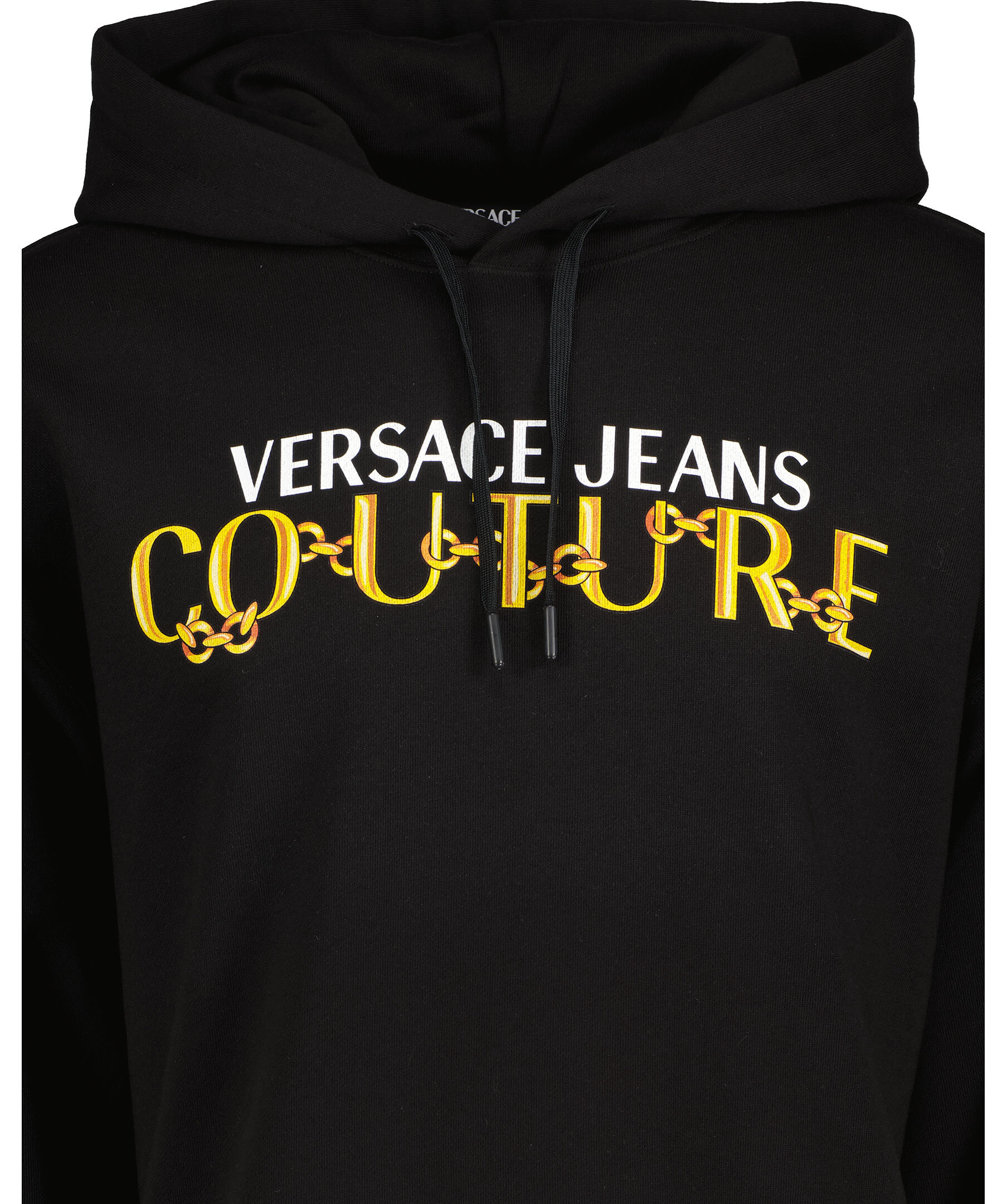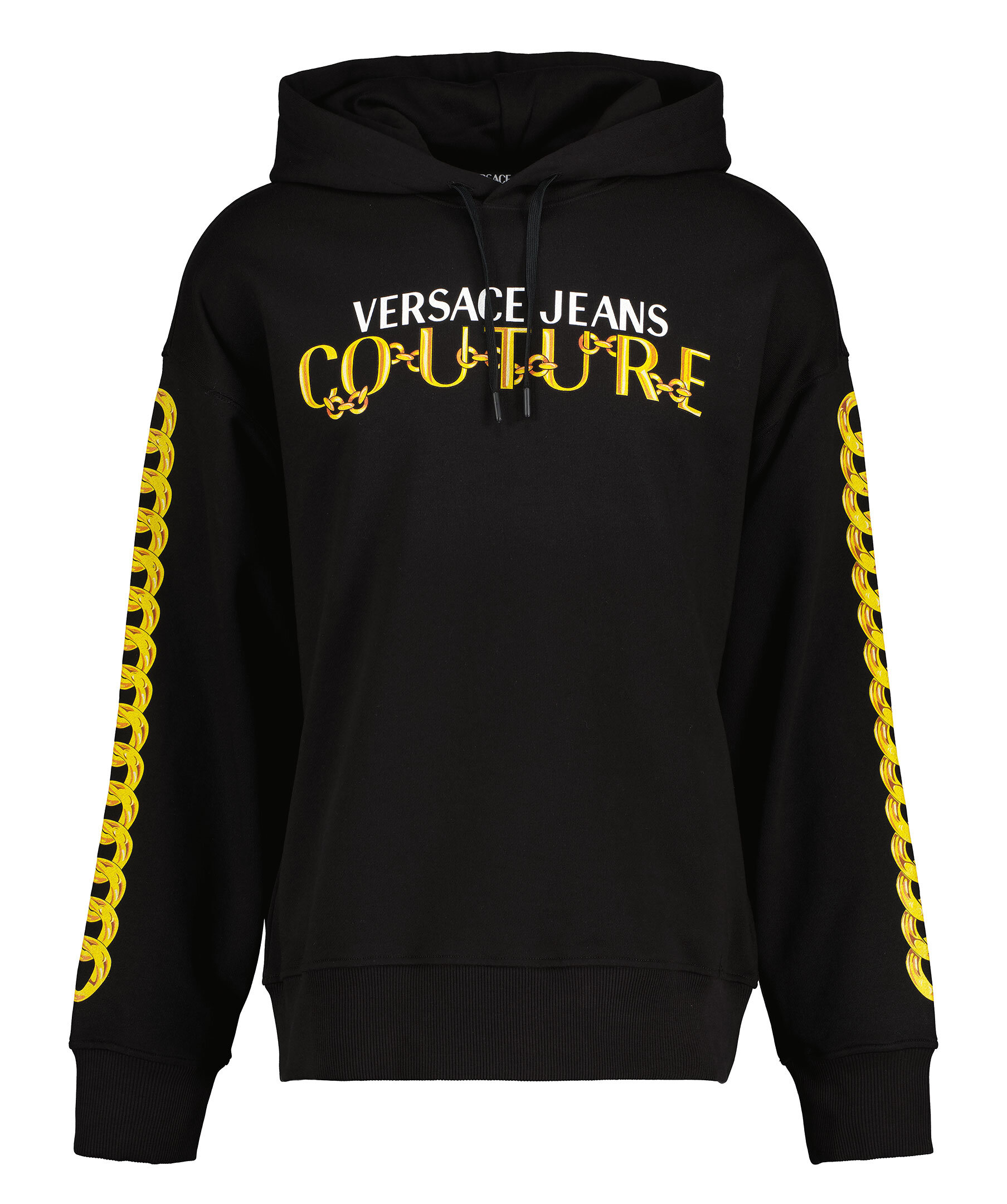 Svart hoodie från Versace Jeans Couture. Stor logotyp på framsidan i gult och vitt samt kedjetryck längs ärmarna. Ribbade muddar och plaggslut samt snörning vid huvan.