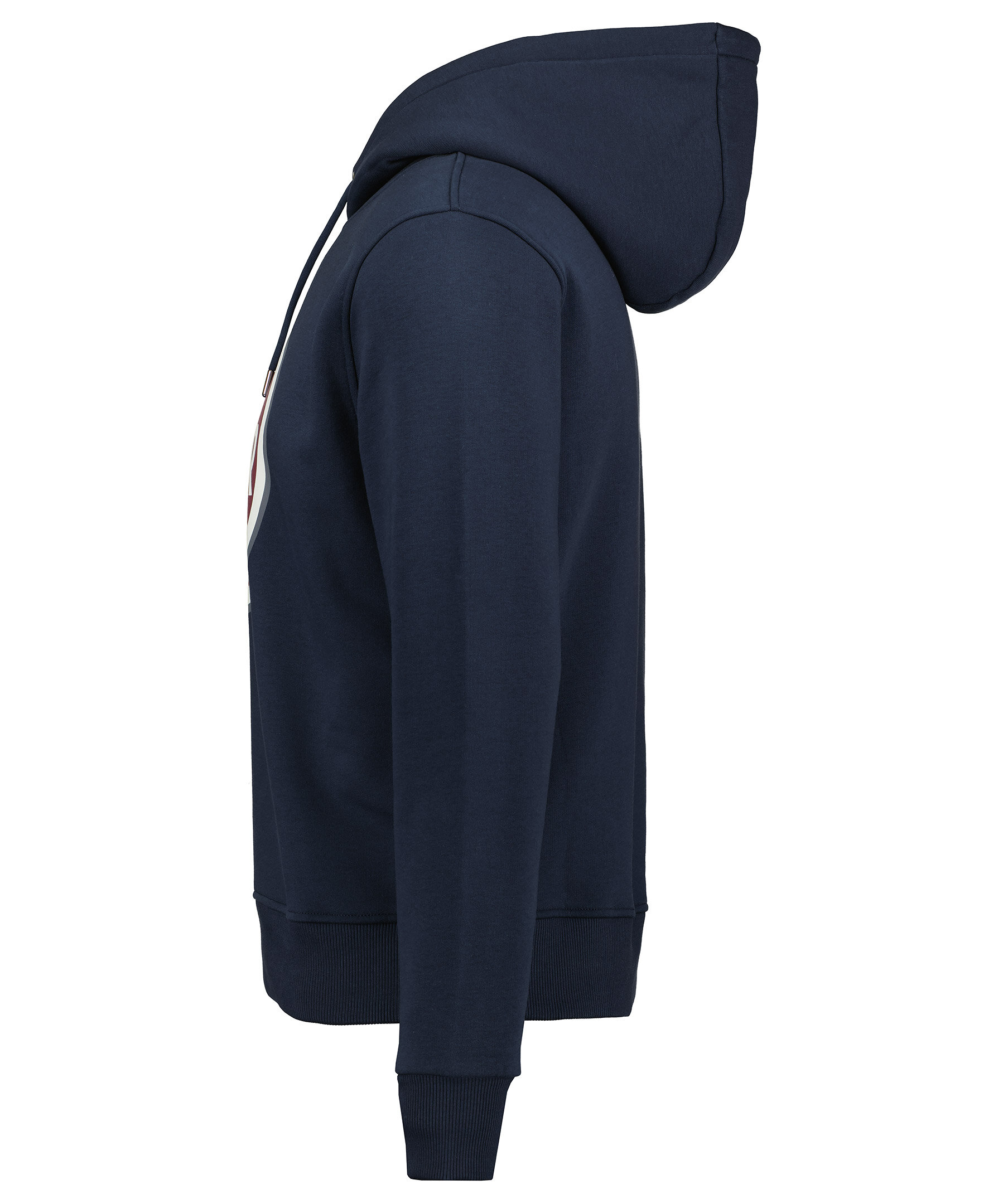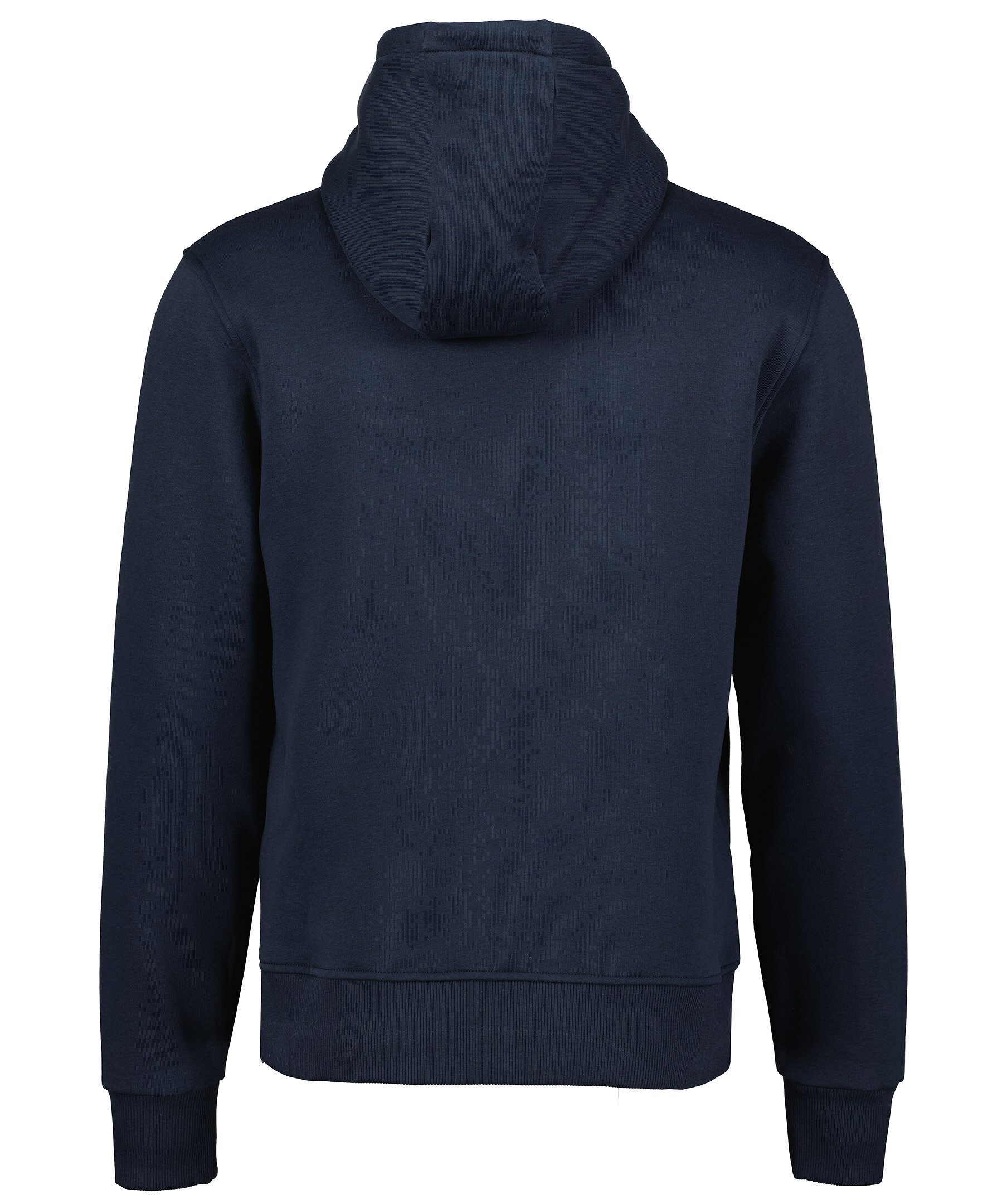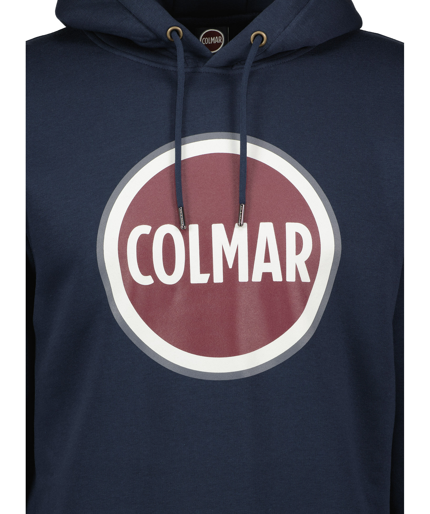 Mörkblå hoodie från Colmar. Luva med dragsko. Stor tryckt logotyp över bröstet i rött, beige och grått. ribbstickade muddar vid ärm- och plaggslut. Borstad insida.