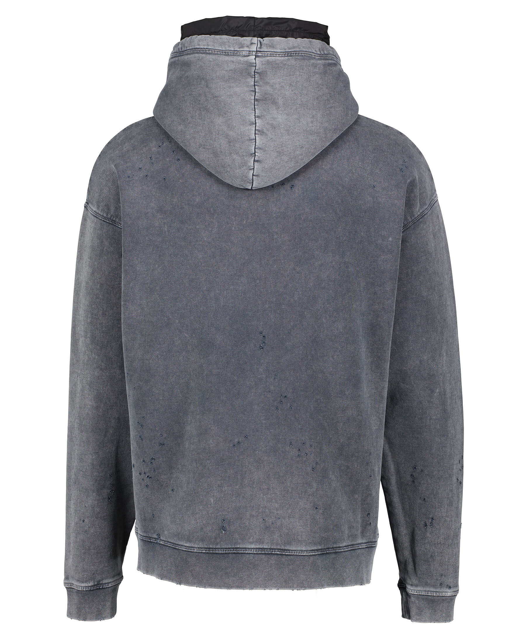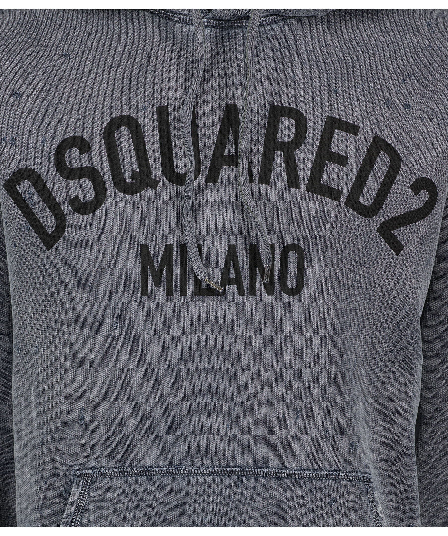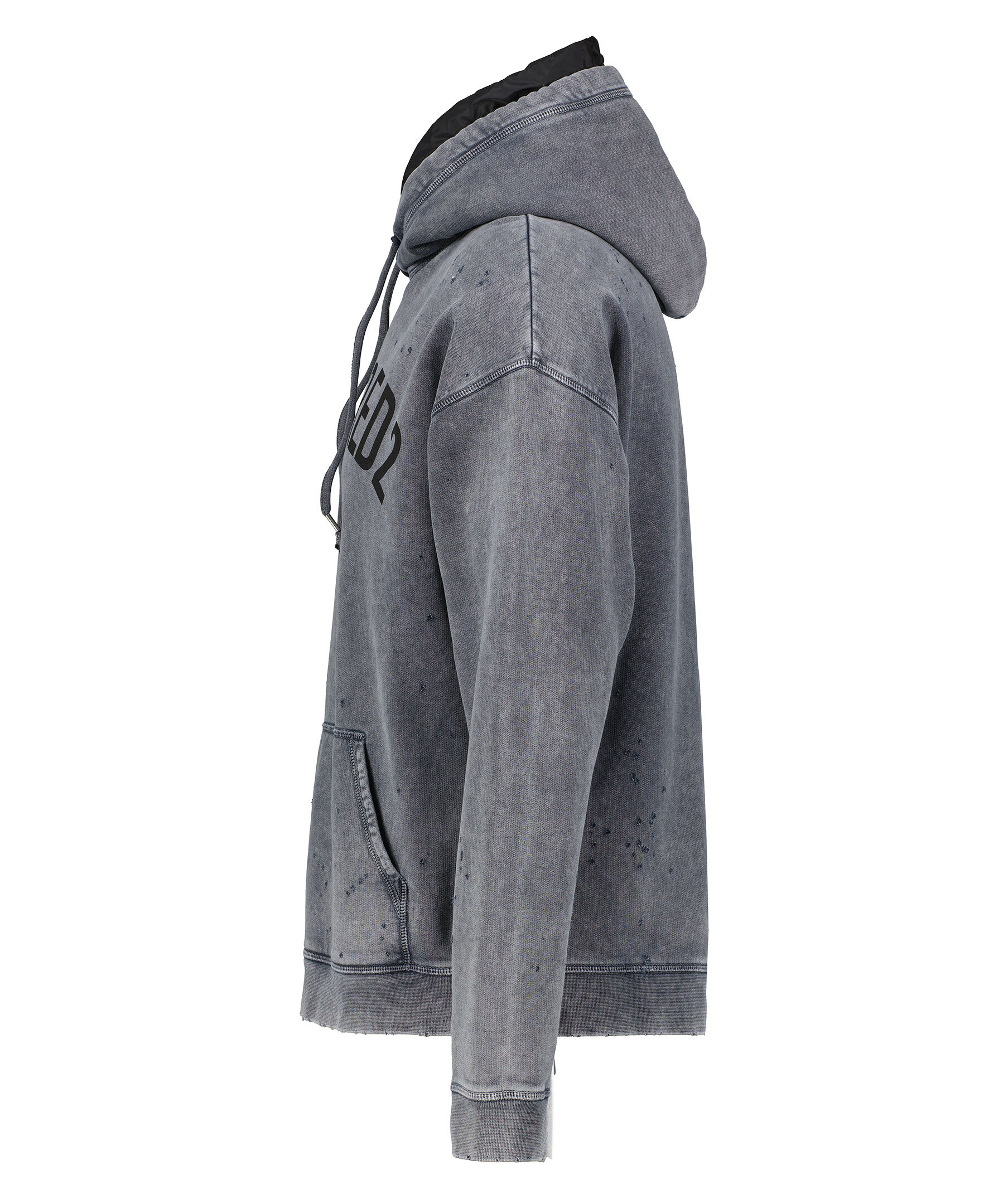 Mörkgrå, stentvättad och medvetet sliten hoodie från Dsquared2. Tillverkad i 100% bomull. Svart, tryckt logotyp på bröstet, snörning i luvan och en extra luva i tunt, svart material och känguruficka på magen. Ribbade muddar i ärmslut och plaggslut.
