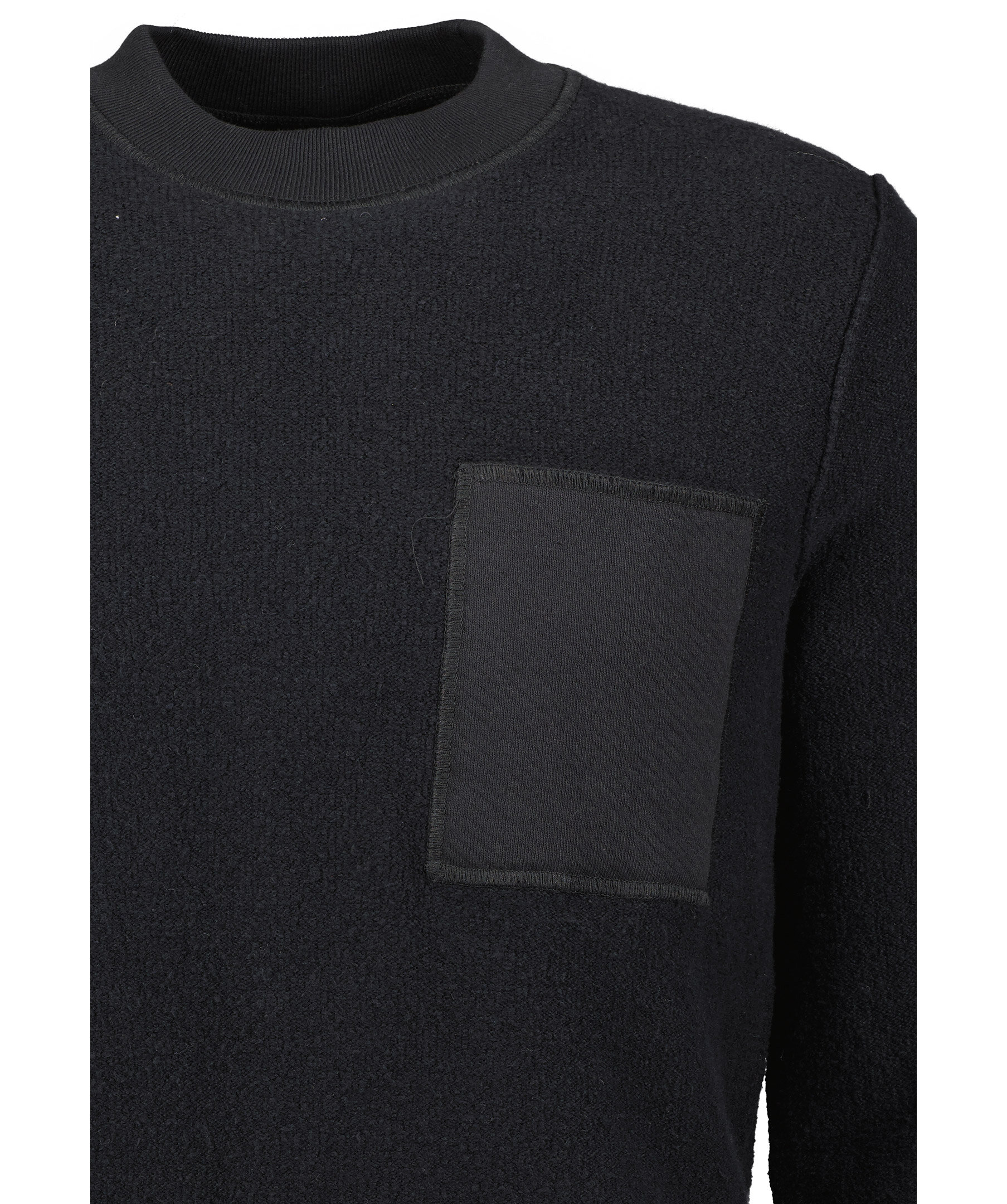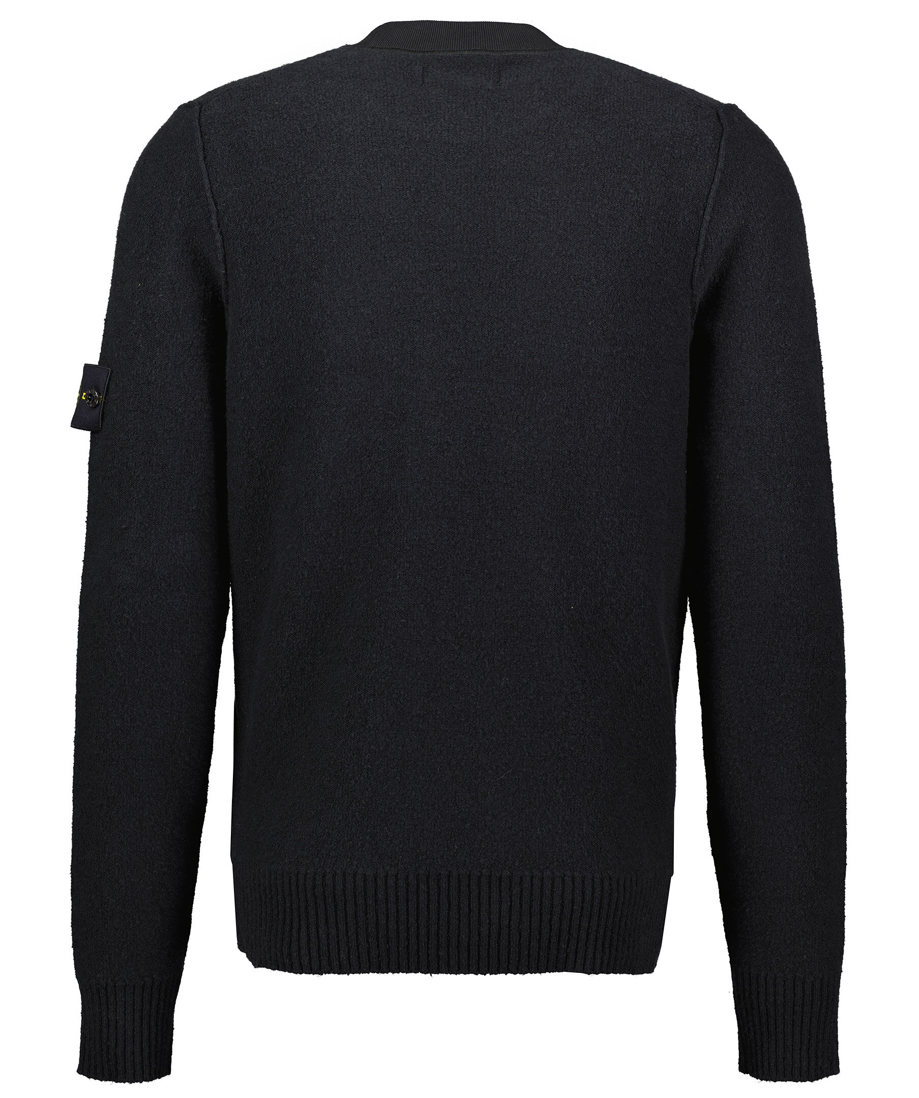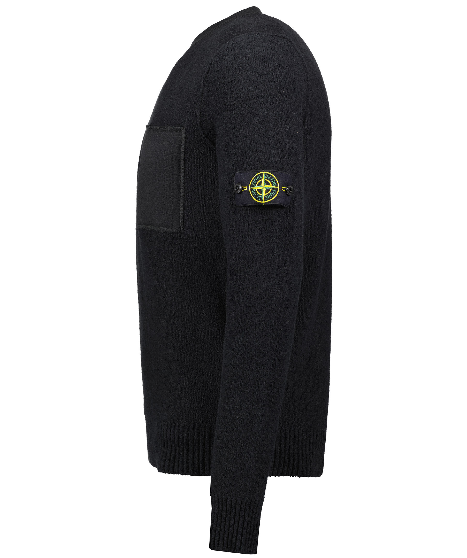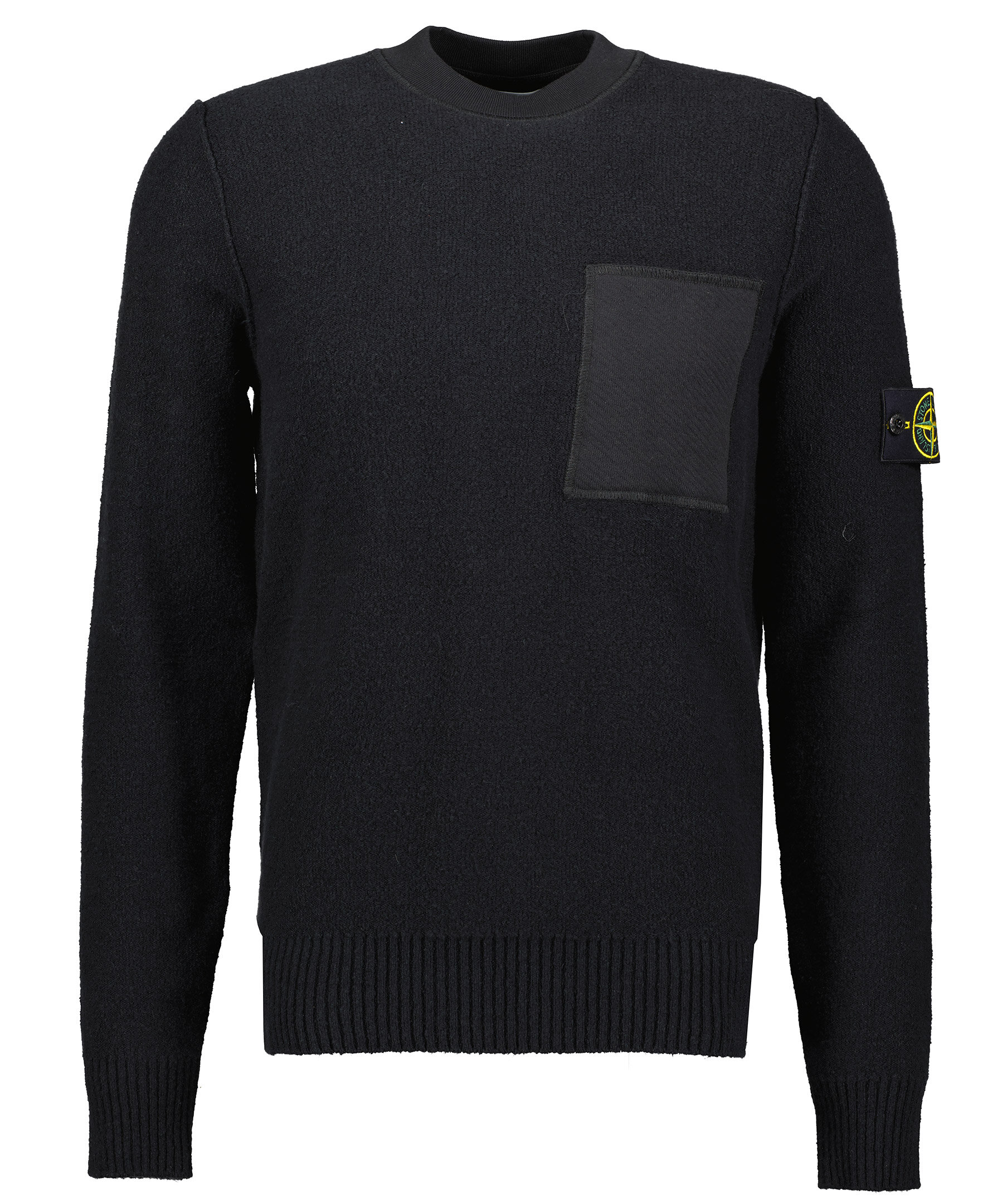 Svart stickad tröja i mycket mjukt material, från Stone Island. Rundad hals, bröstficka samt löstagbar patch med logotyp på vänster ärm. Ribbstickade muddar.