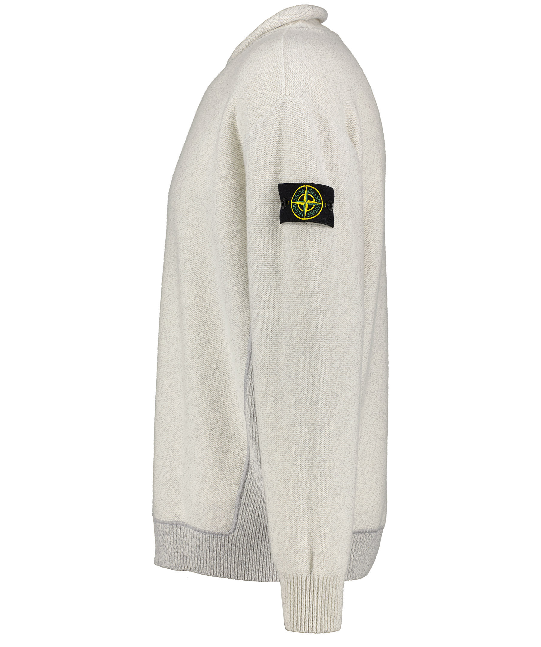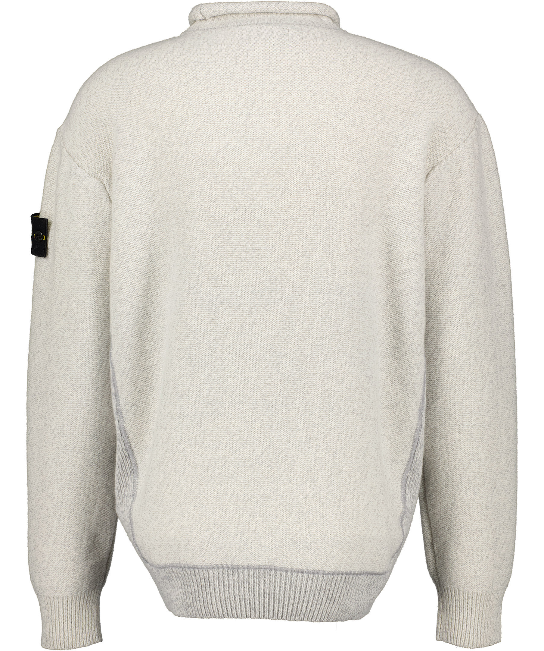 Grå och vit avigt stickad tröja från Stone Island. Rundad halslinning med hög krage. Ribbstickade muddar i ärm- och plaggslut. Löstagbar patch på vänster ärm.
