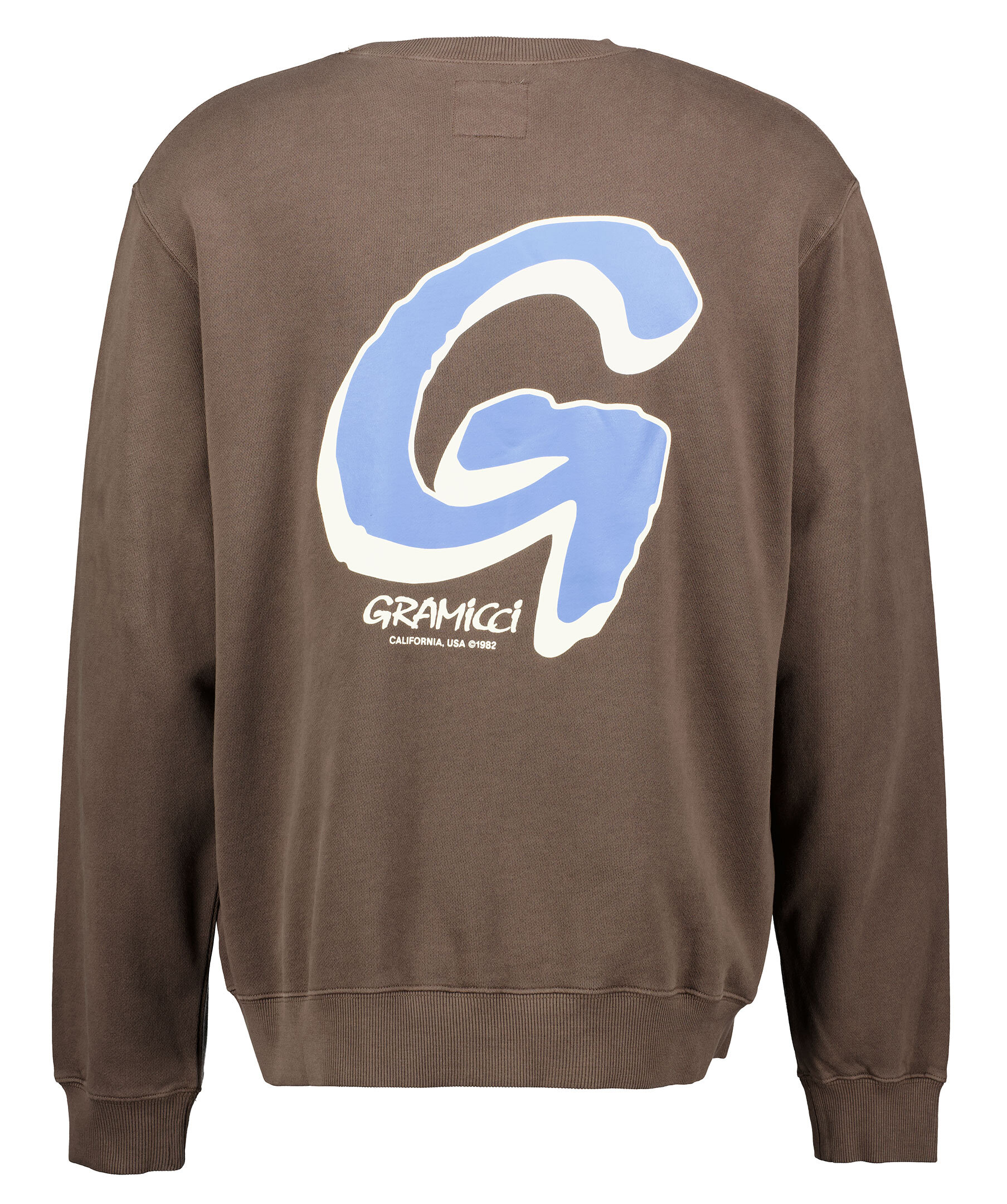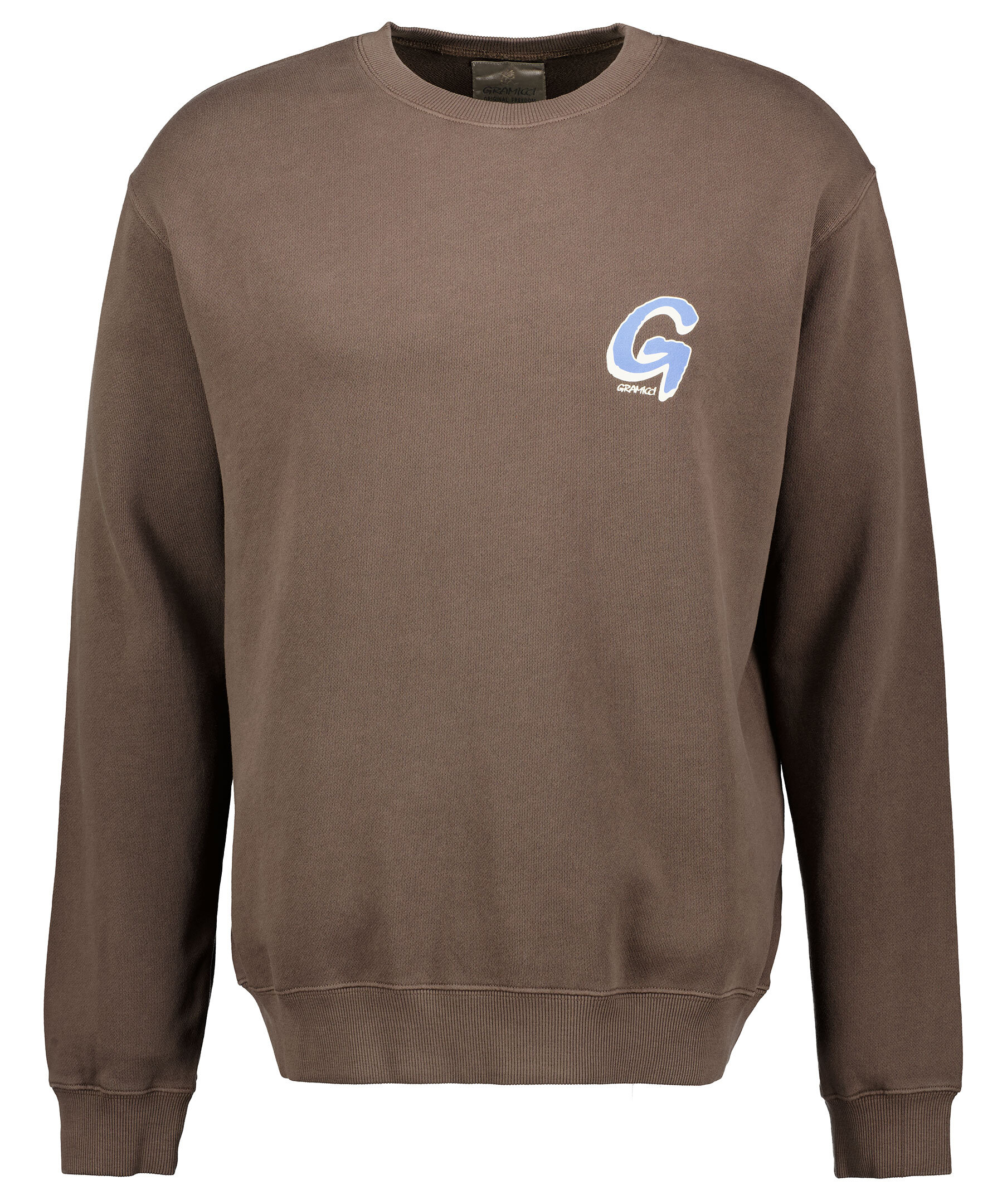 Mörkbrun college tröja från Gramicci. Tryckt logotyp på vänster bröst. Rundad halsringning. Tillverkad i 100% bomull. Ribbstickade muddar vid kragen, ärm- och plaggslut.