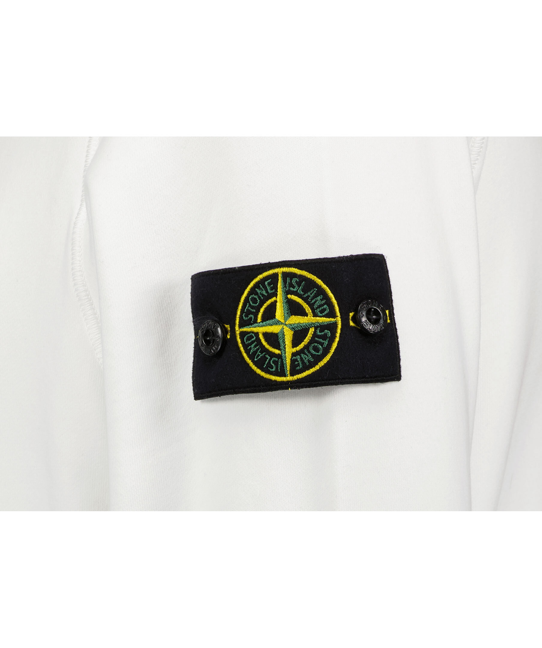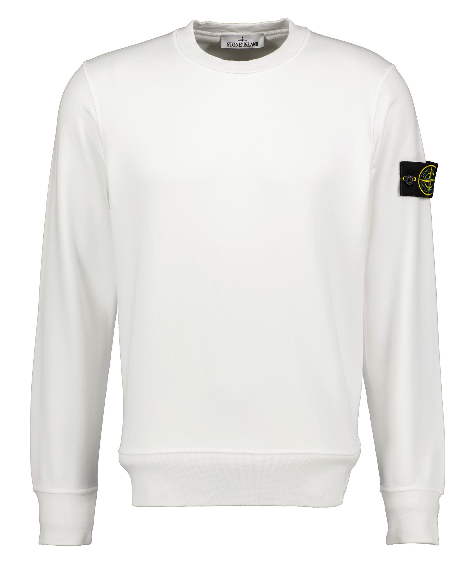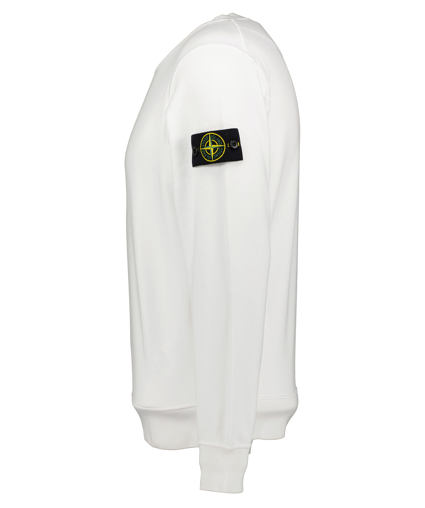 Vit sweatshirt från Stone Island gjord i 100% bomull. Ribbade muddar vid hals, ärm och plaggslut. Avtagbar tygpatch med logotyp på vänster överärm.