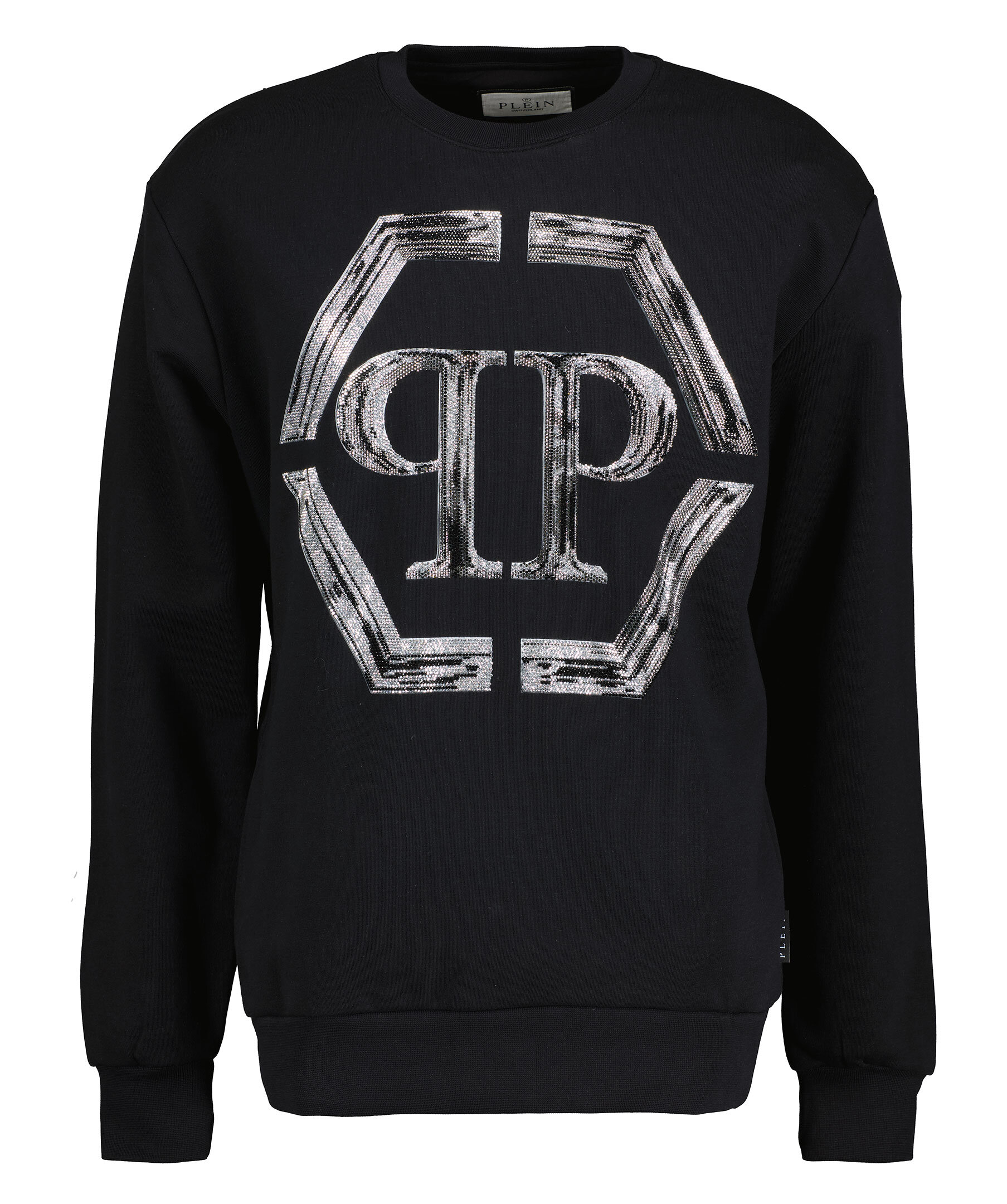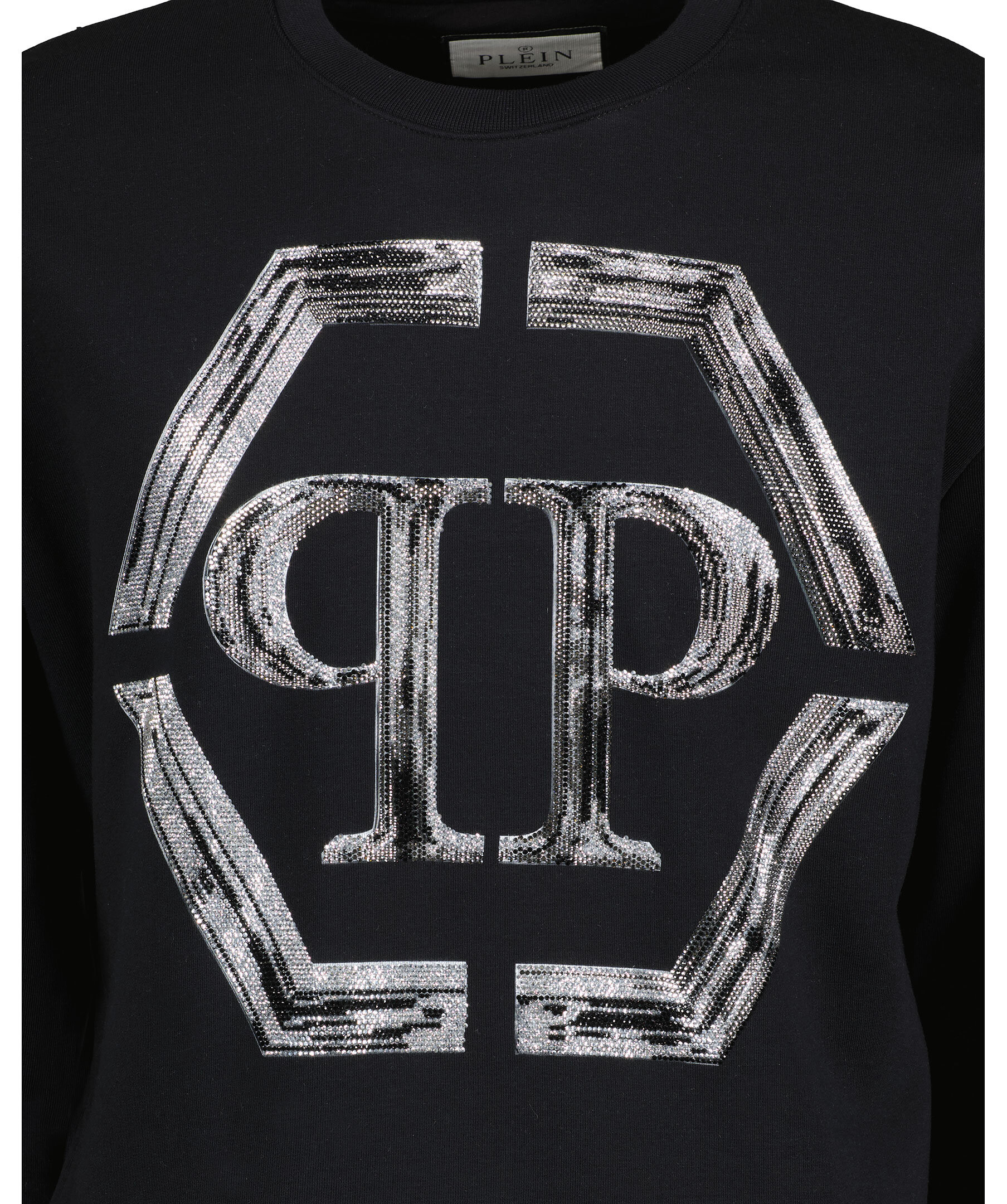 Svart sweatshirt från Philipp Plein. Tillverkad i en bomullsblandning. Stor hexagonlogotyp i silvriga stenar på framsidan. PP Hexagon på en saffian läderlapp sys på vänster bröst. Ribbstickad halsringning samt muddar vid ärm- och plaggslut. Tröjan har fickor i sidorna.