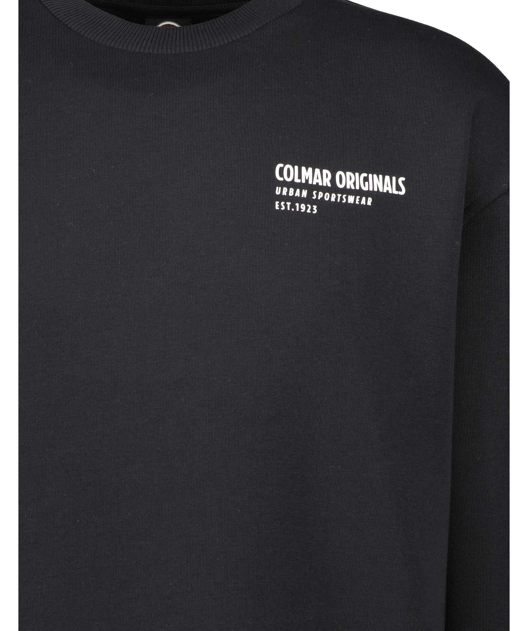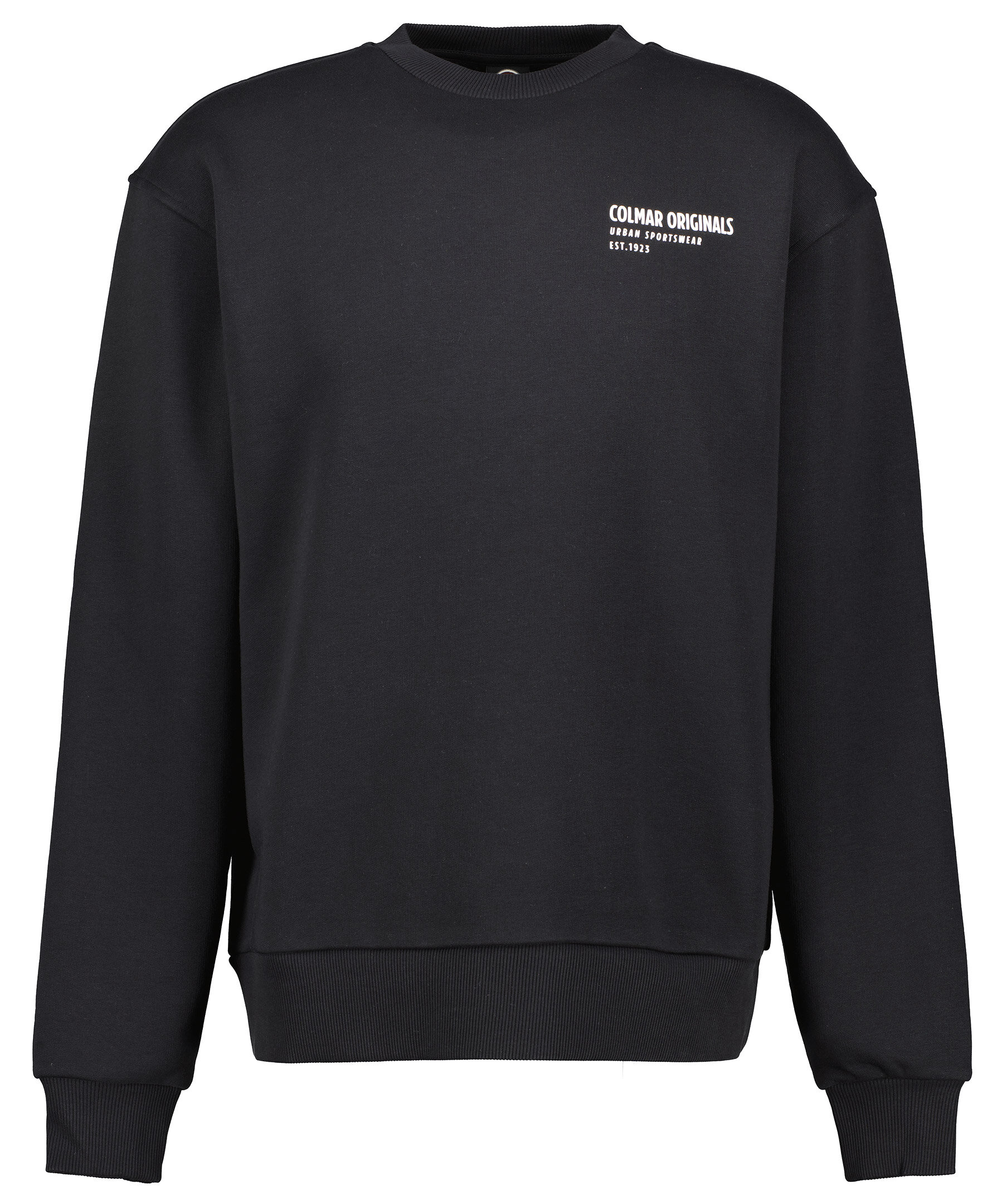 Svart sweatshirt från Colmar. Tryckt logotyp i vitt på vänster bröst. Ribbstickade muddar vid kragen, ärm- och plaggslut. Borstad insida. Tillverkad i bomullsblandning.