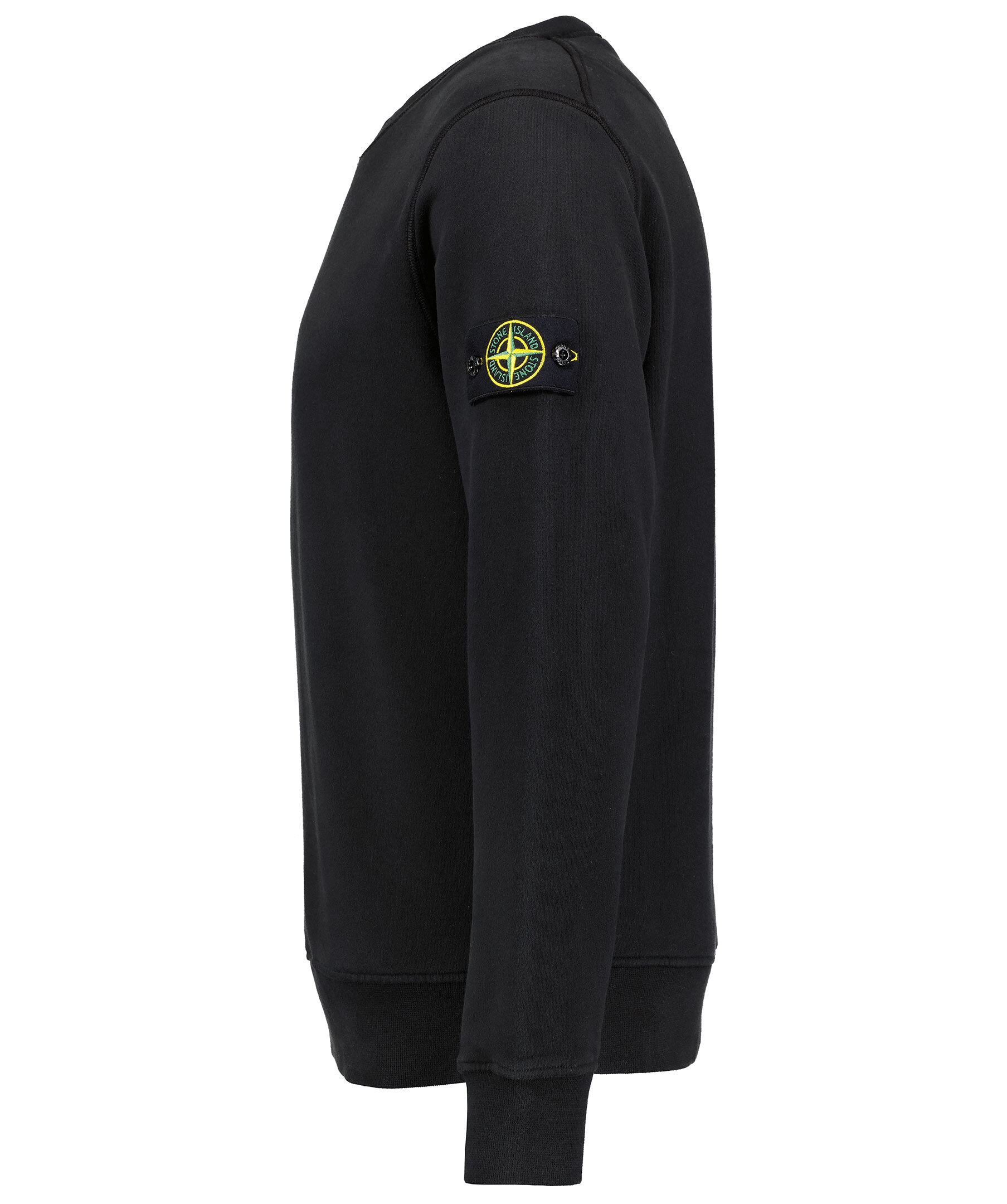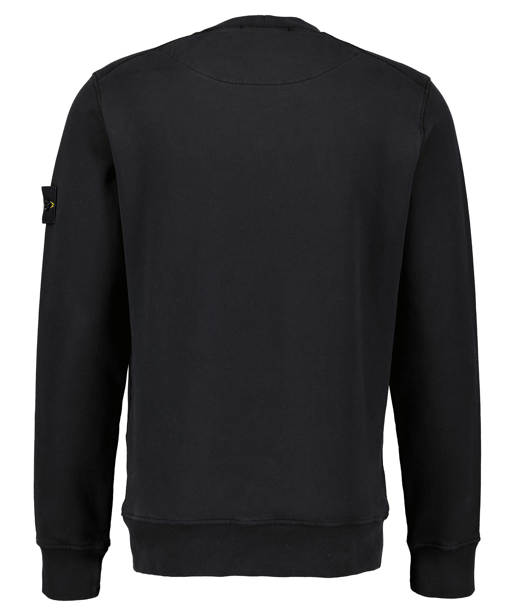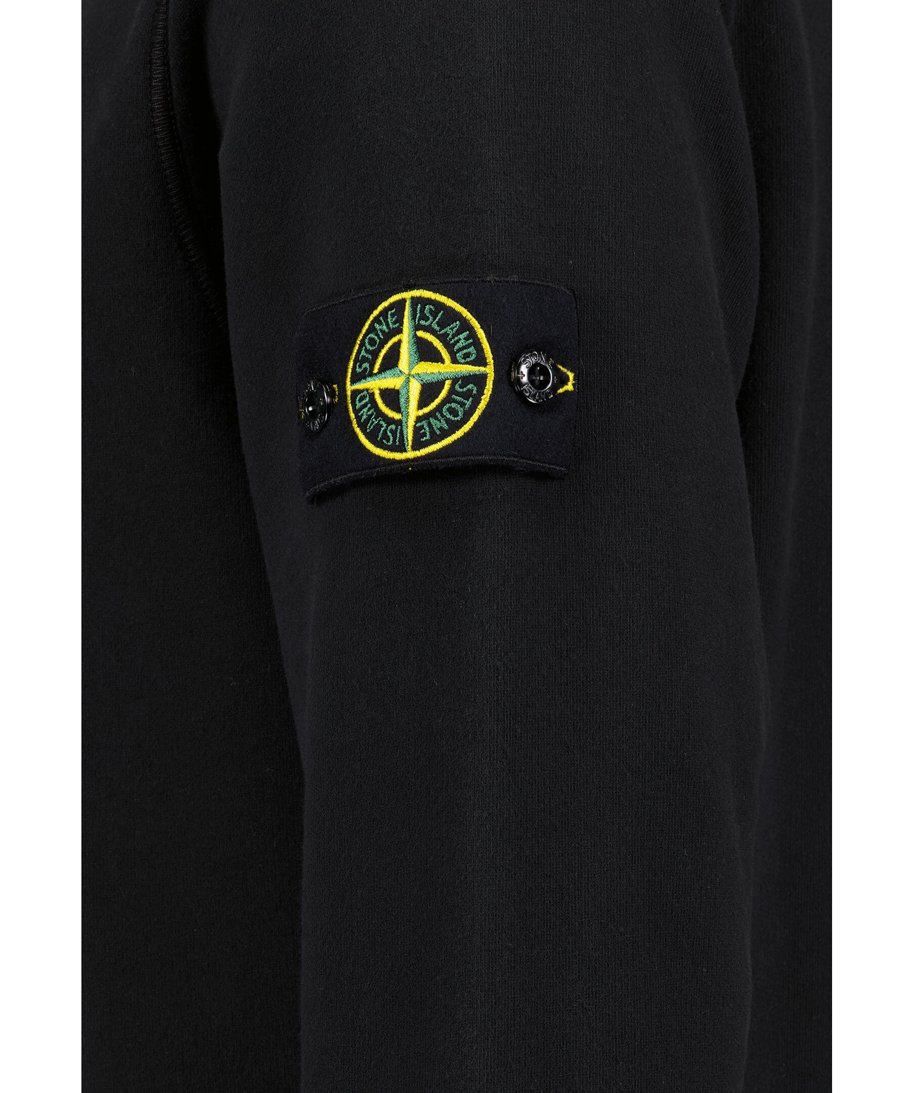 Svart sweatshirt från Stone Island. Rundad halsringning. Ribbstickade muddar vid kragen, ärm- och plaggslut. Löstagbar patch på vänster ärm.