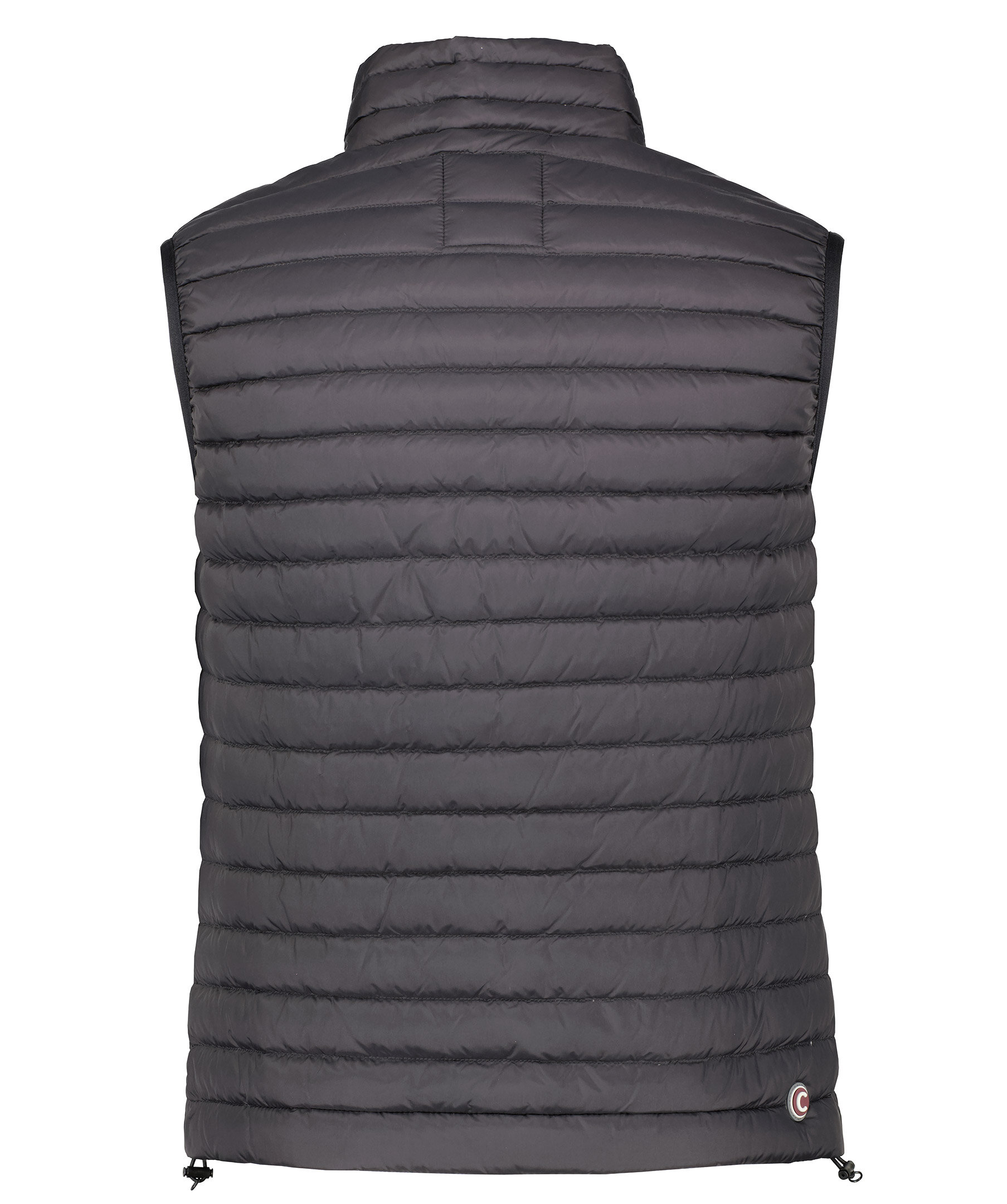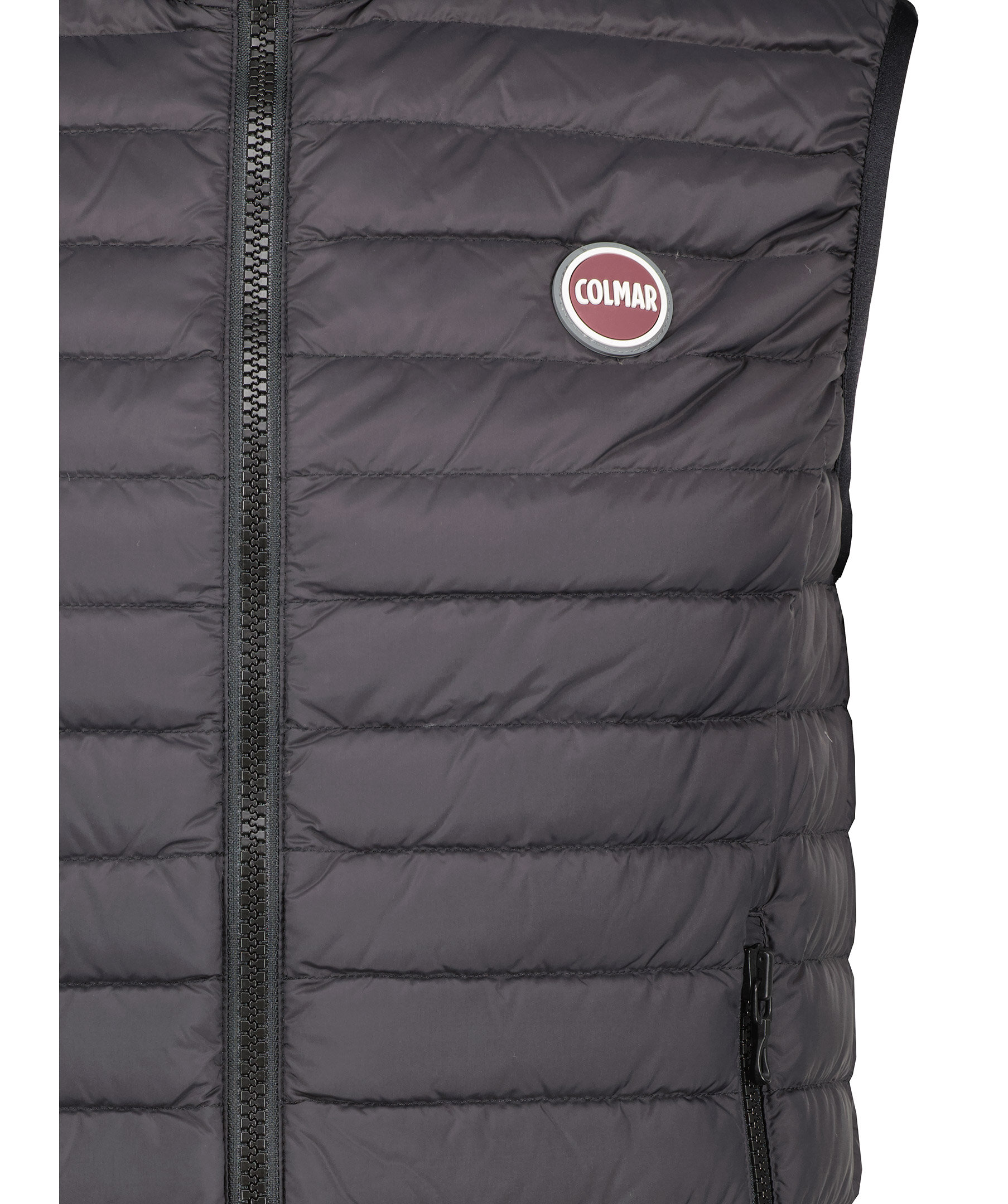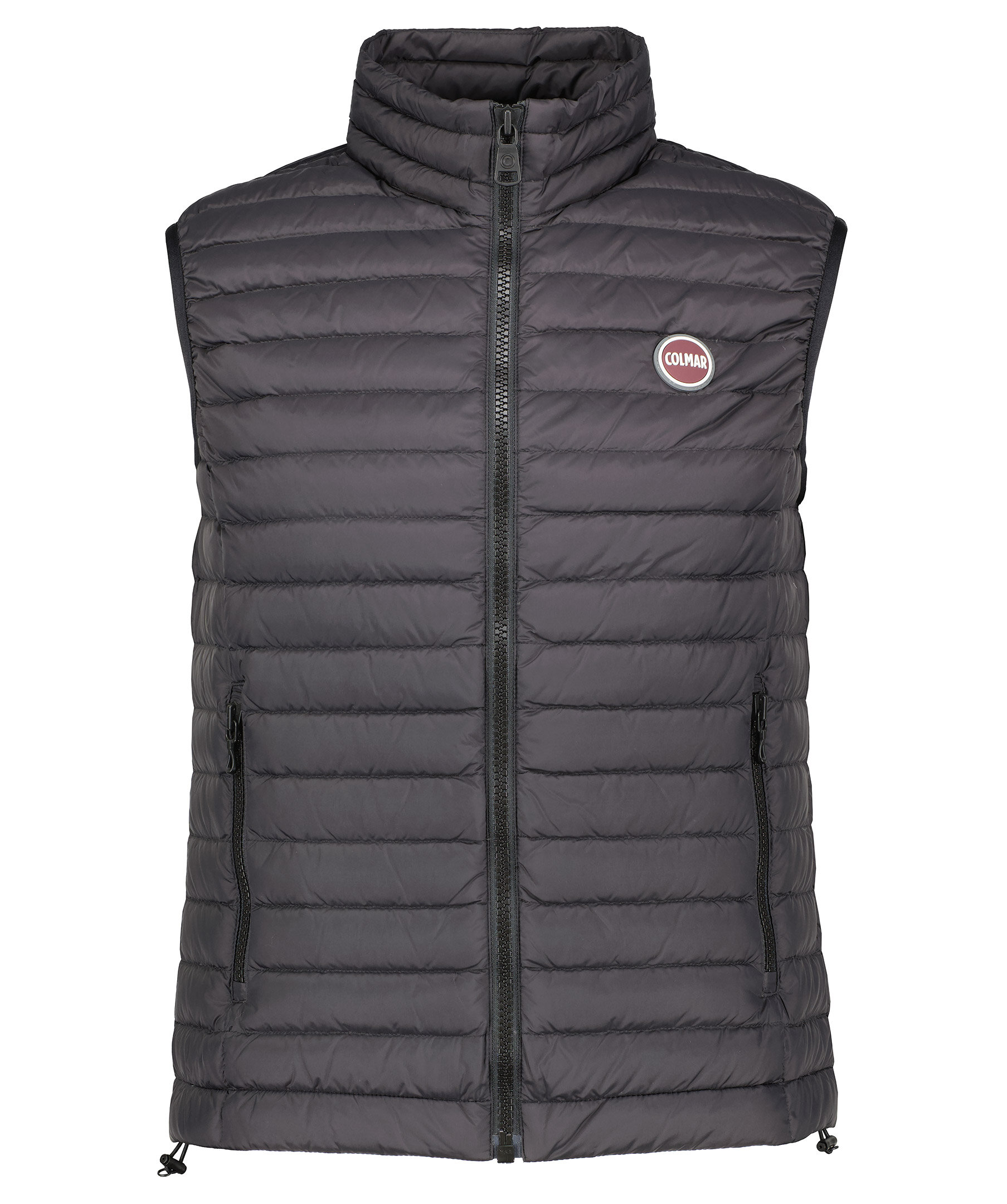 Svart dunväst från Colmar. Stängs framtill med dragkedja. Två fickor framtill som stängs med dragkedja. Smal elastisk mudd i ärmslut. Gummerad logotyp på vänster sida vig plaggslut och på vänster bröst. Dragsko vidd västslut.