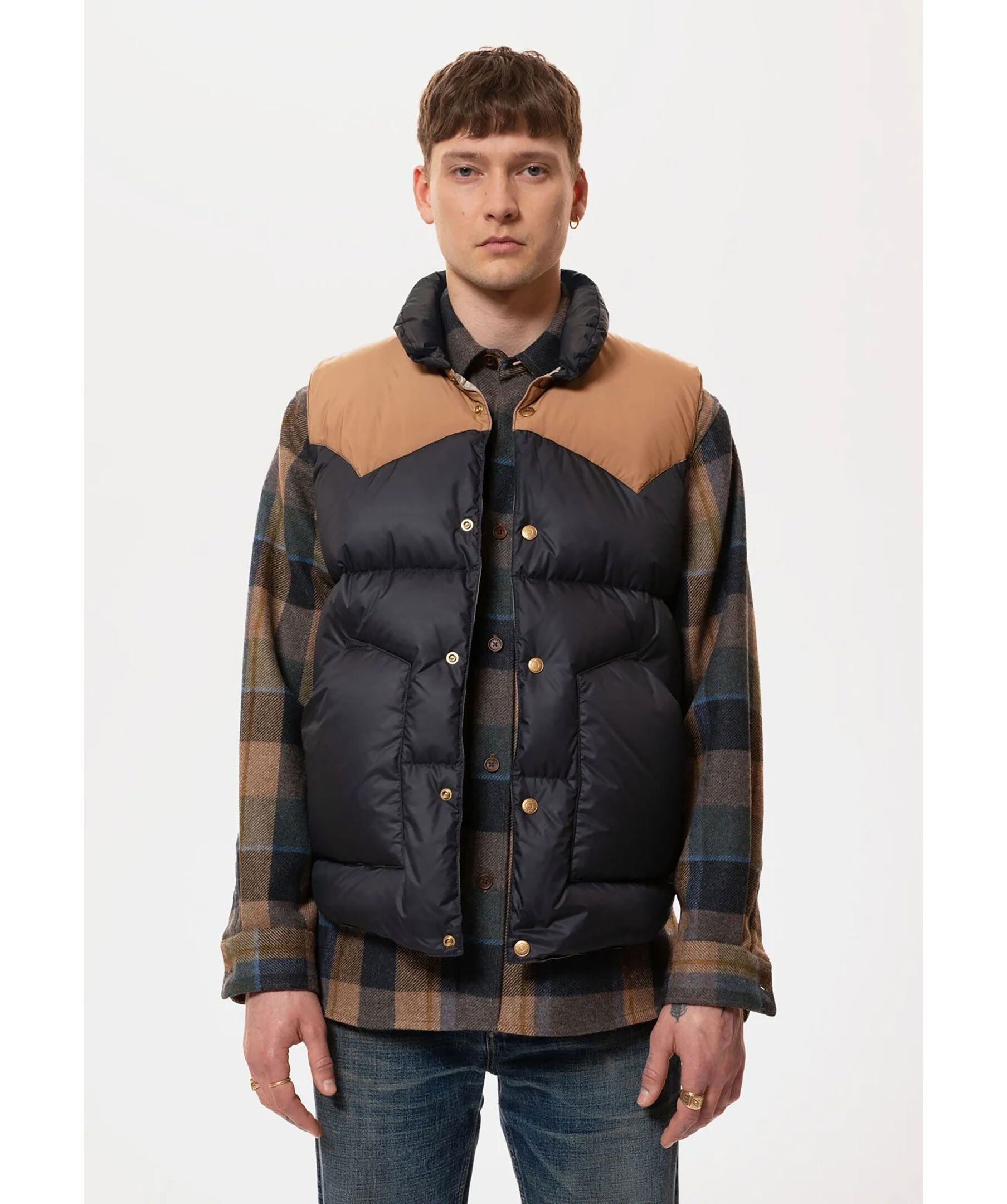 Multifärgad, quiltat pufferväst från Nudie Jeans. Västen stängs med tryckknappar framtill och har två sidfickor samt logotyplapp med dragkedja på insidan. Tillverkad i en polyester.