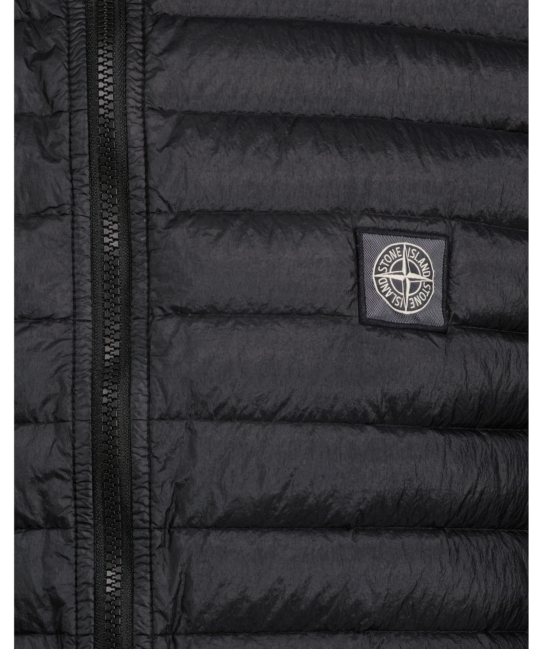 Svart quiltad dunväst från Stone Island. Stängs framtill med en svart tvåvägsdragkedja. Fyrkantig patch med logotyp på vänster bröst. Smal elastiskmudd vid ärm- och plaggslut och fickor i sidorna.